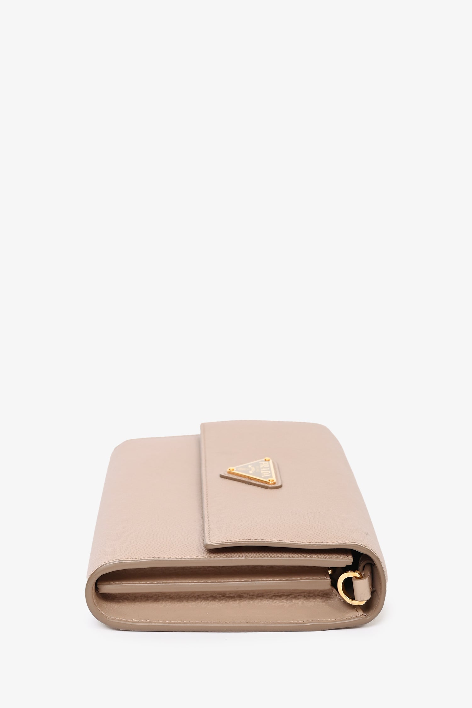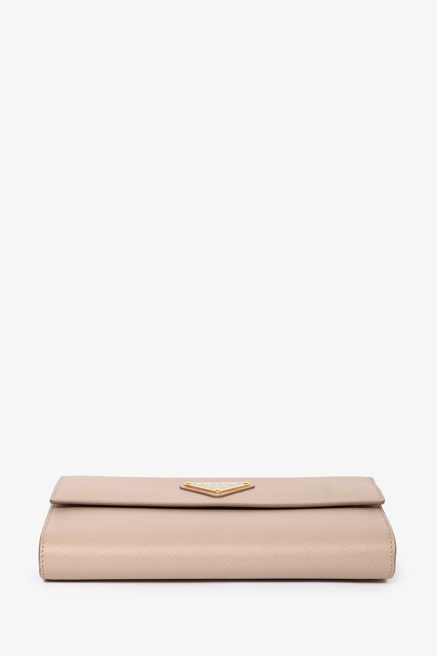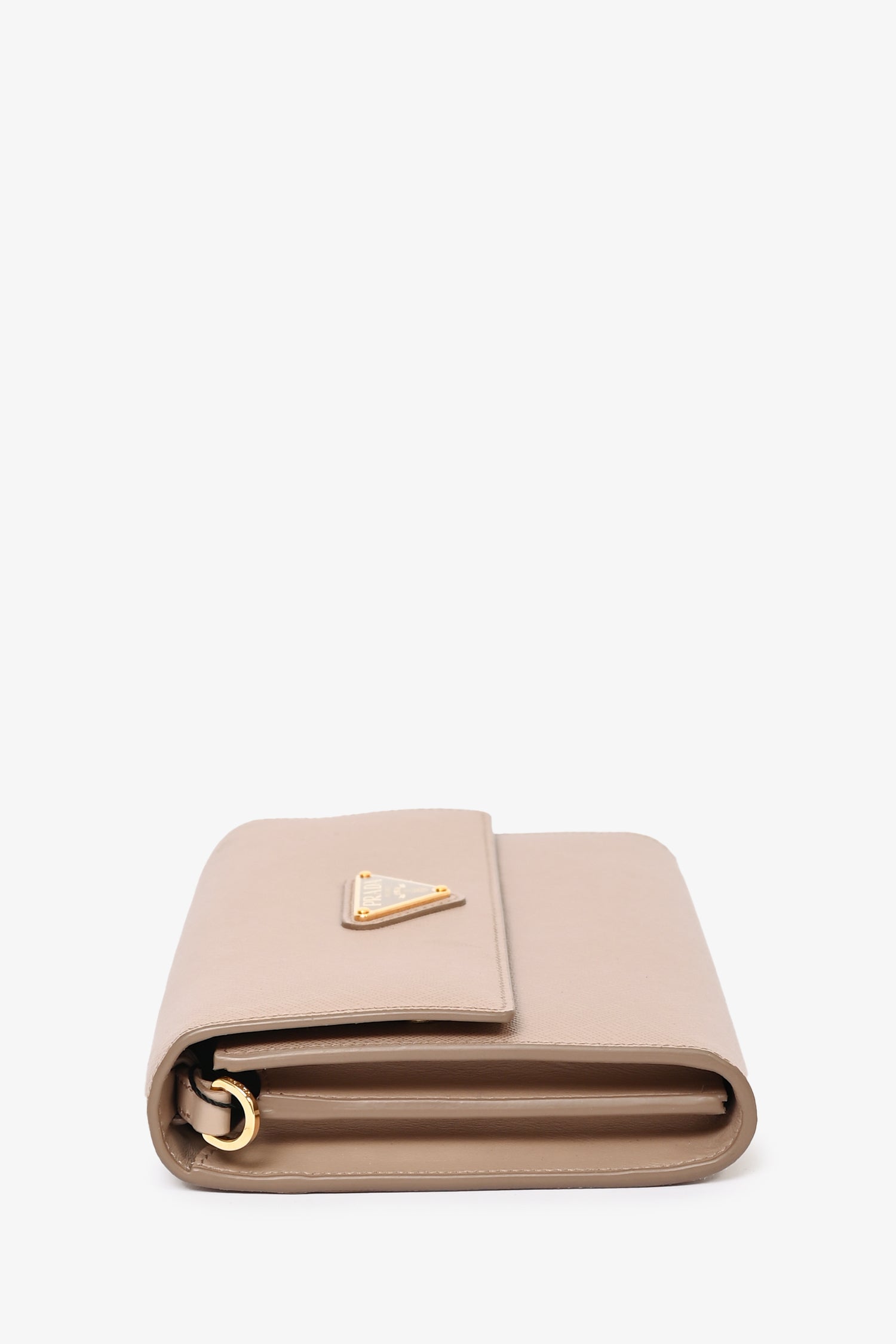 Refresh availabilityPrada Beige Saffiano Wallet On Chain. Front fold-over flap with magnetic button closure. 8 card slots. 1 billfold compartment 1 zippered coin compartment. Removable and adjustable strap. Gold-tone hardware. Tonal stitching.