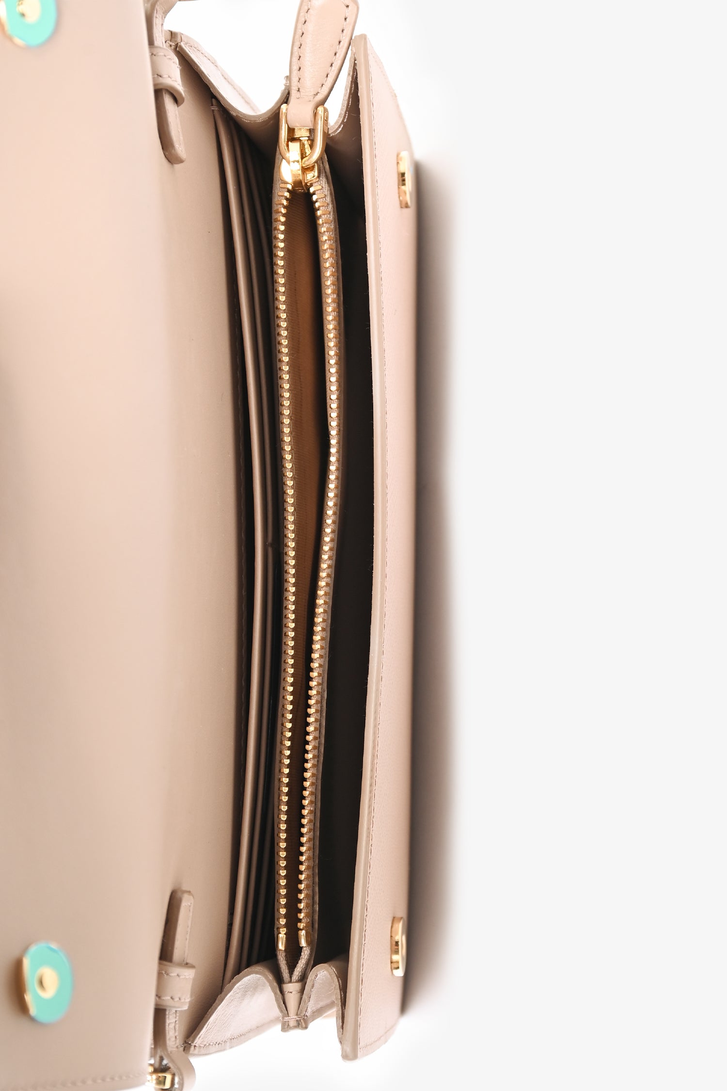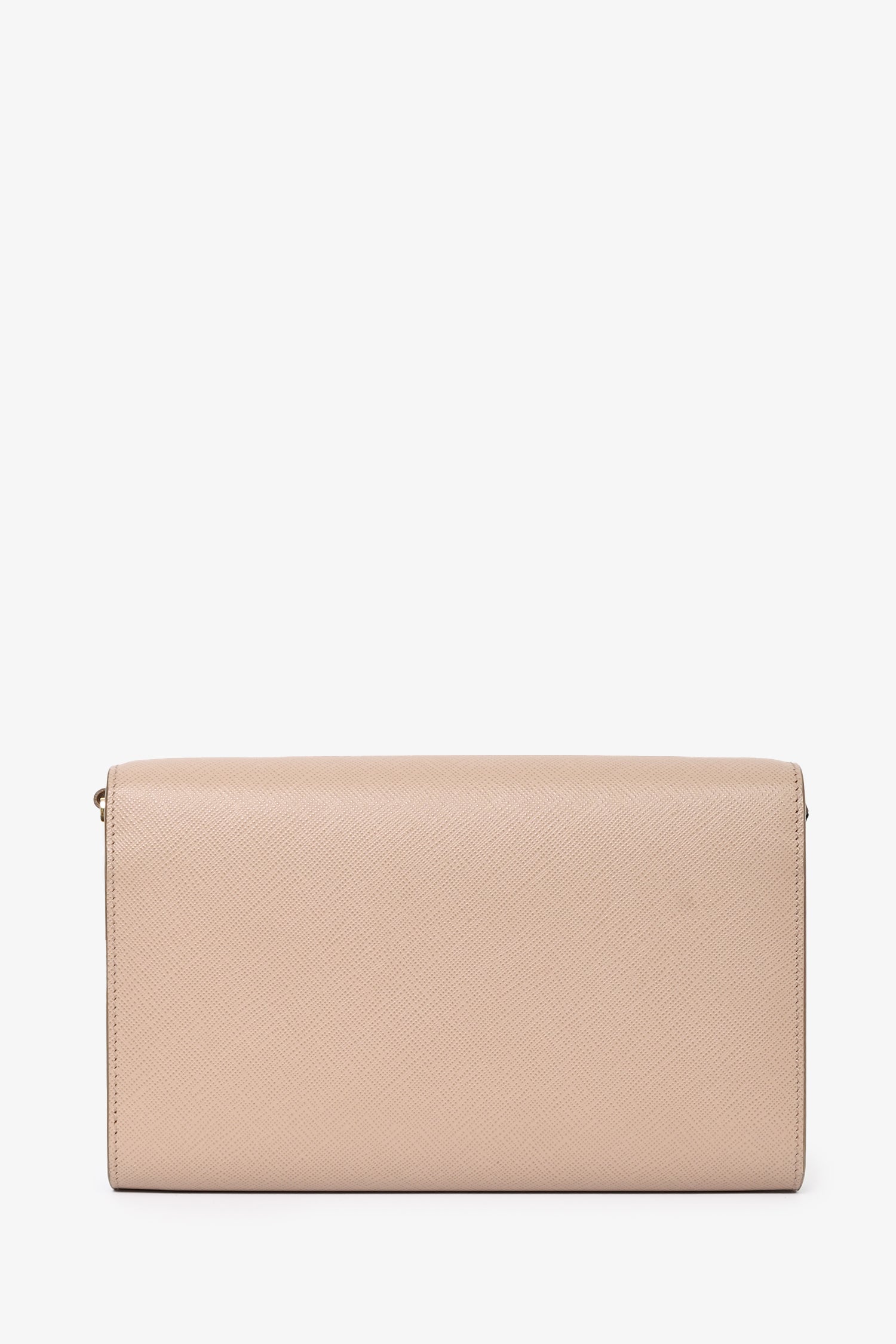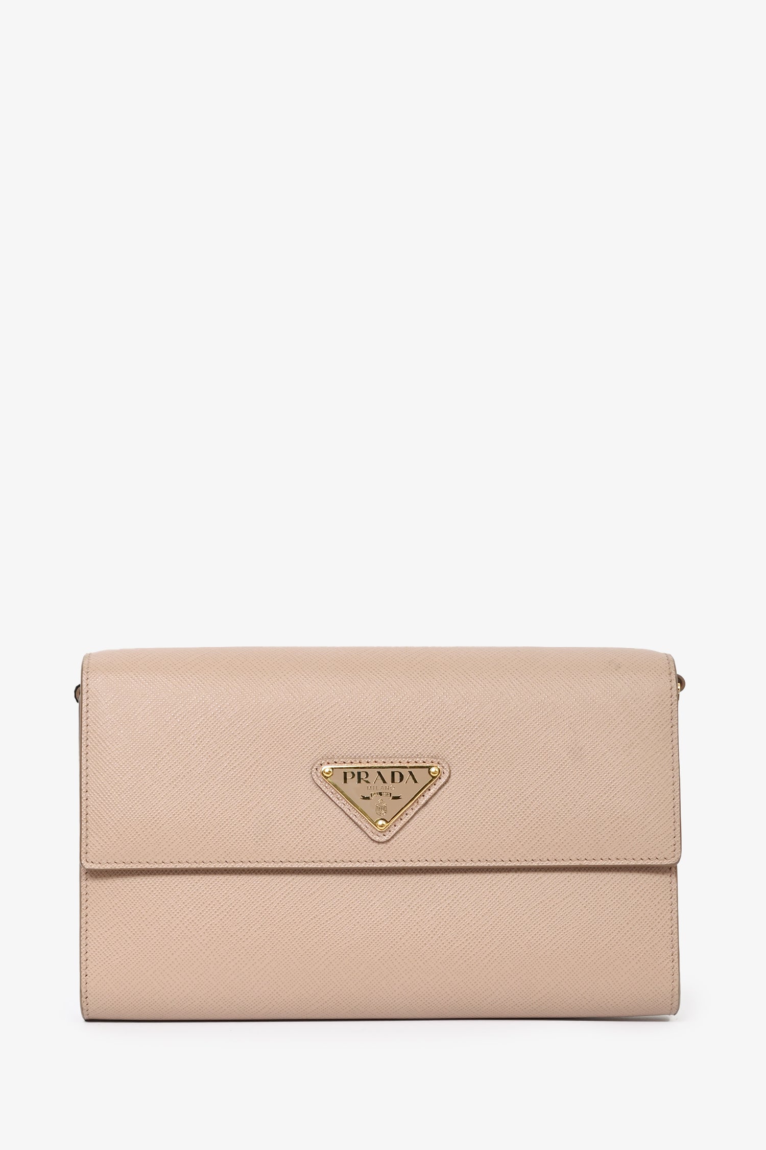 Refresh availabilityPrada Beige Saffiano Wallet On Chain. Front fold-over flap with magnetic button closure. 8 card slots. 1 billfold compartment 1 zippered coin compartment. Removable and adjustable strap. Gold-tone hardware. Tonal stitching.