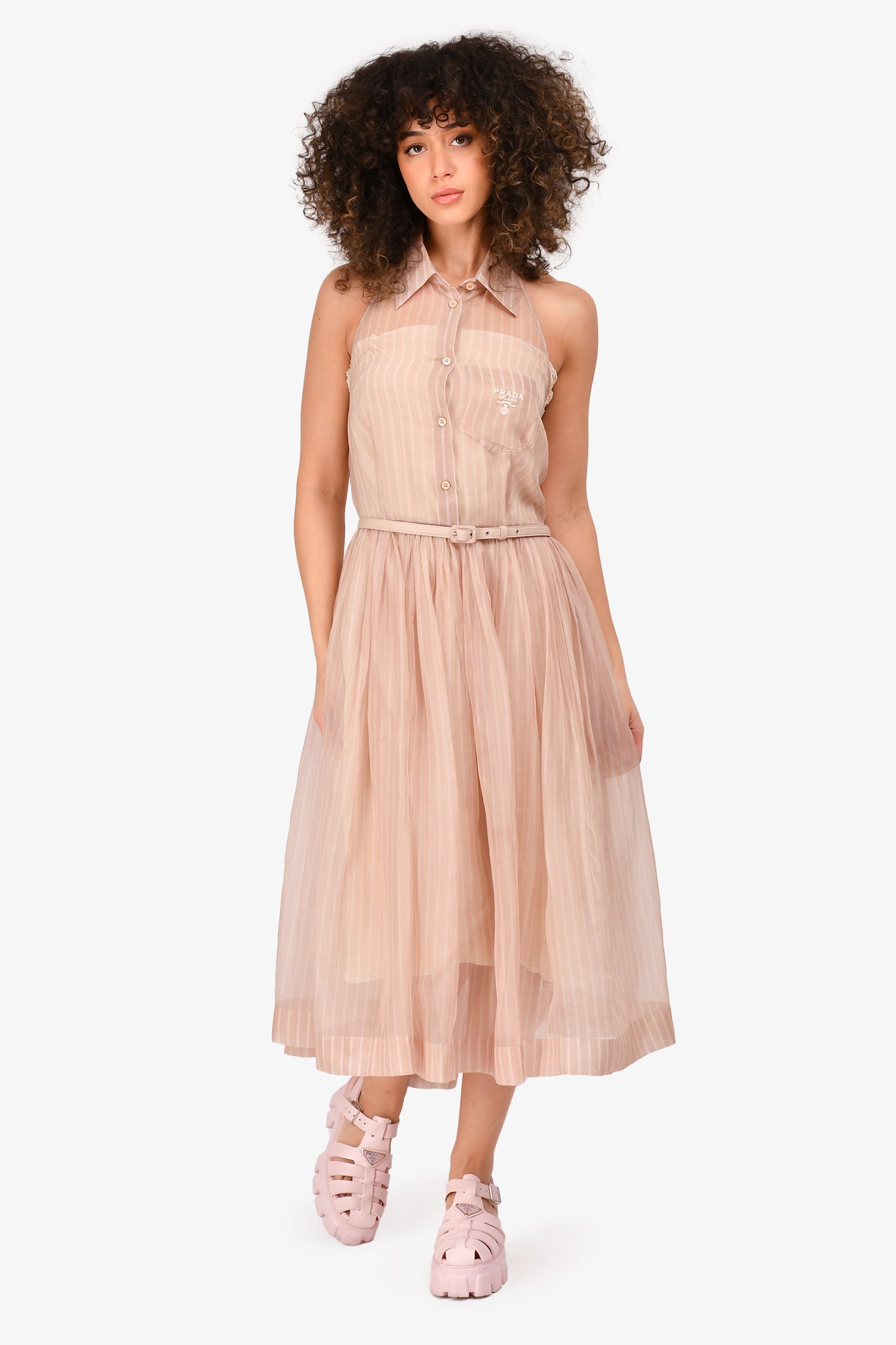 Refresh availabilityPrada Pink Sheer Striped Logo Embroidered Belted Sleeveless Midi Dress with Slip Dress. Detachable slip dress with side zip closure. Exterior dress with front half button-up closure and side zip closure. Front chest slip pocket. Tonal stitching.