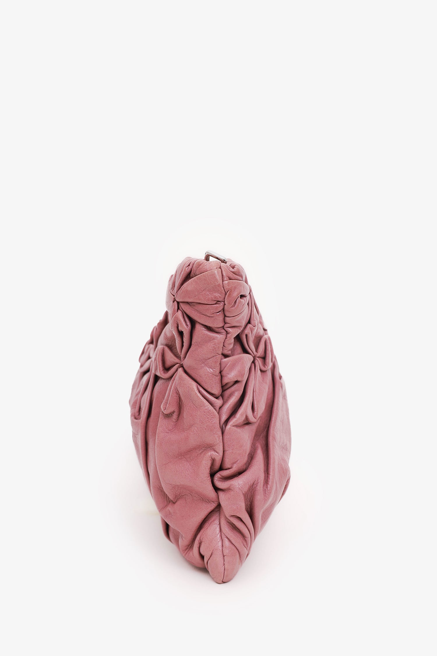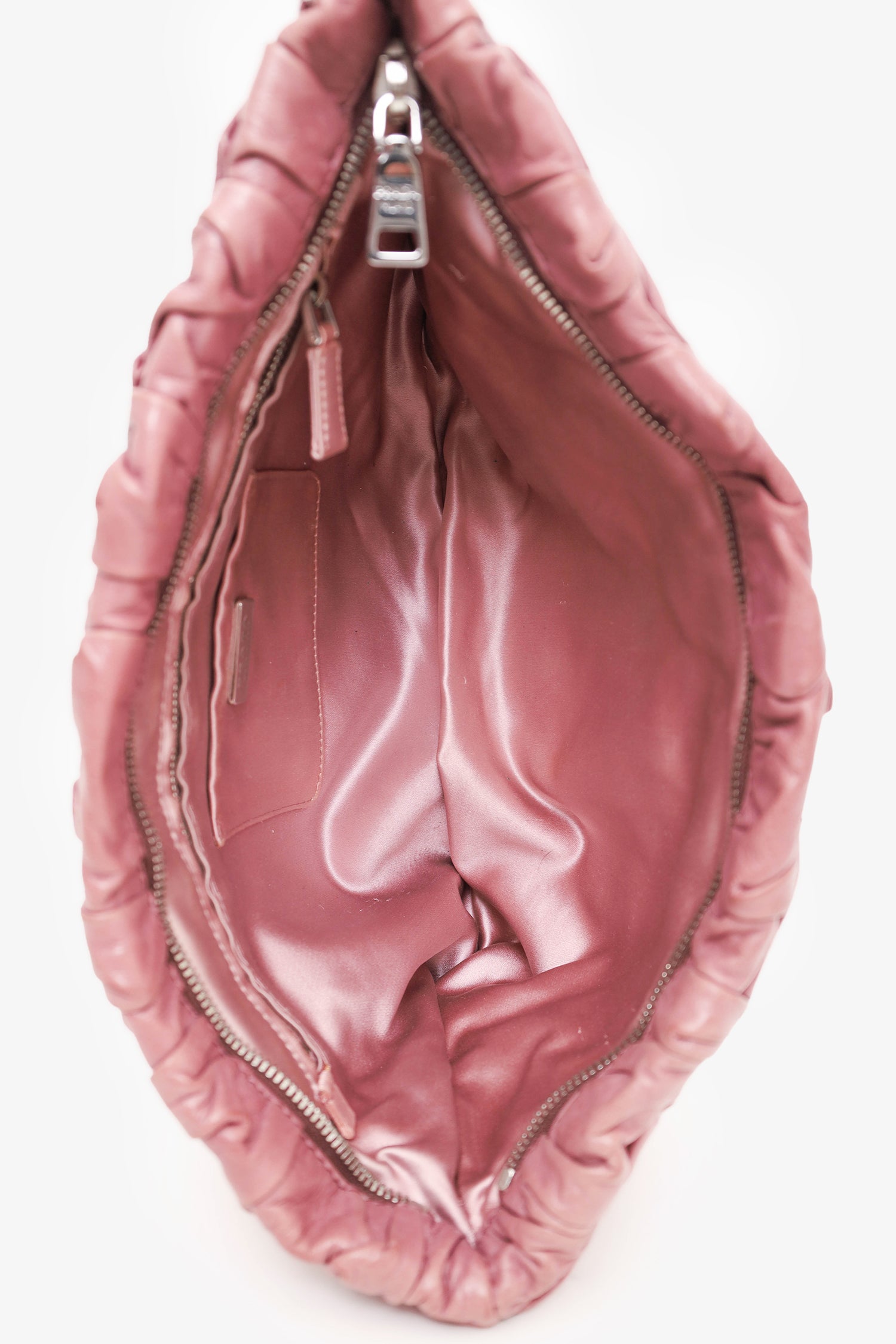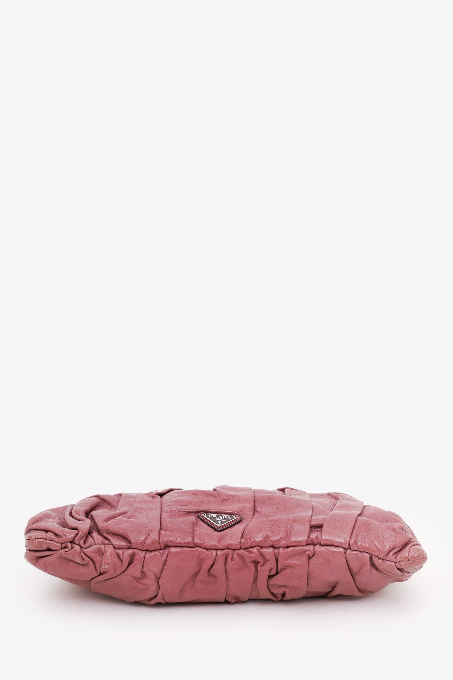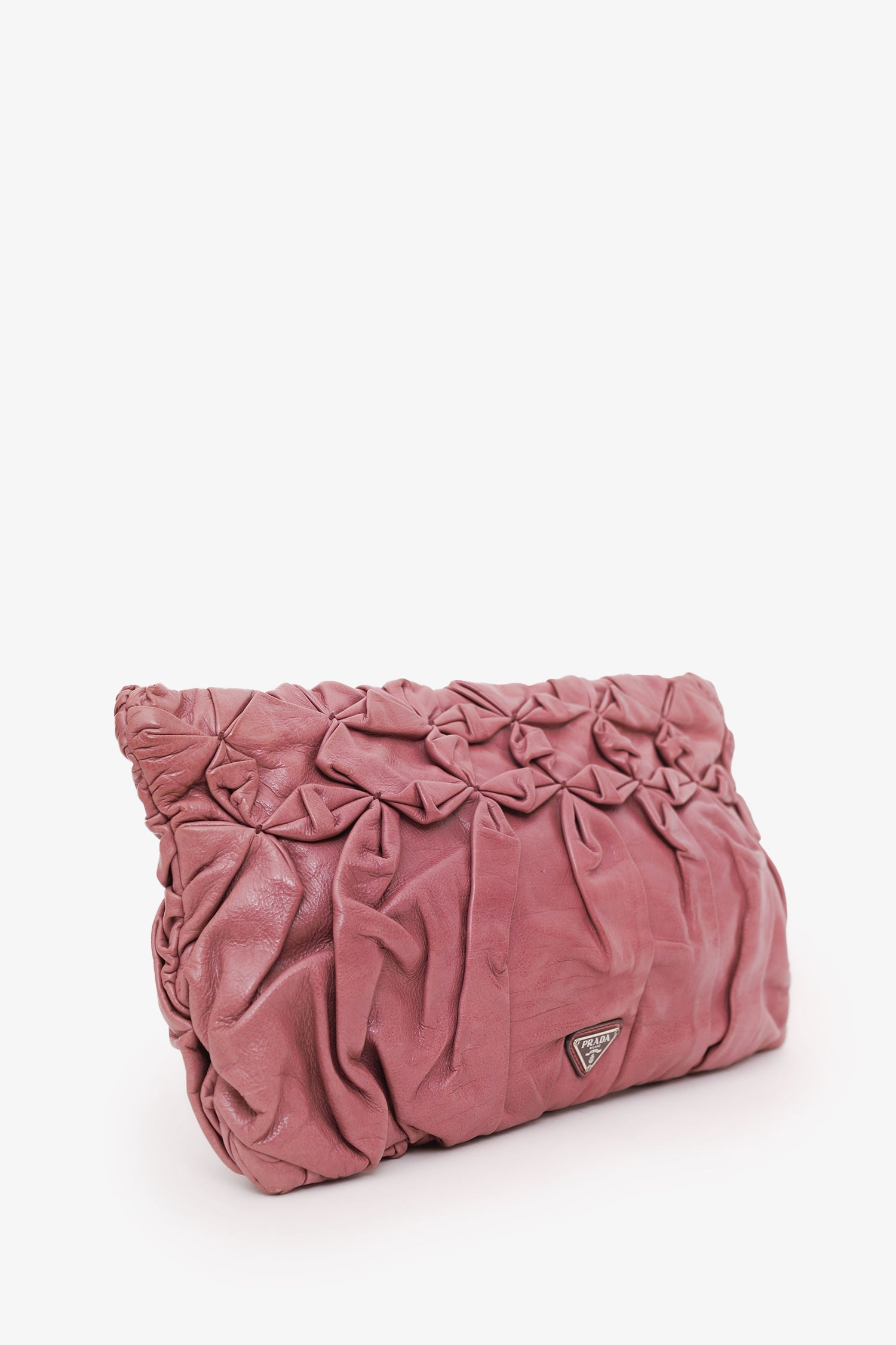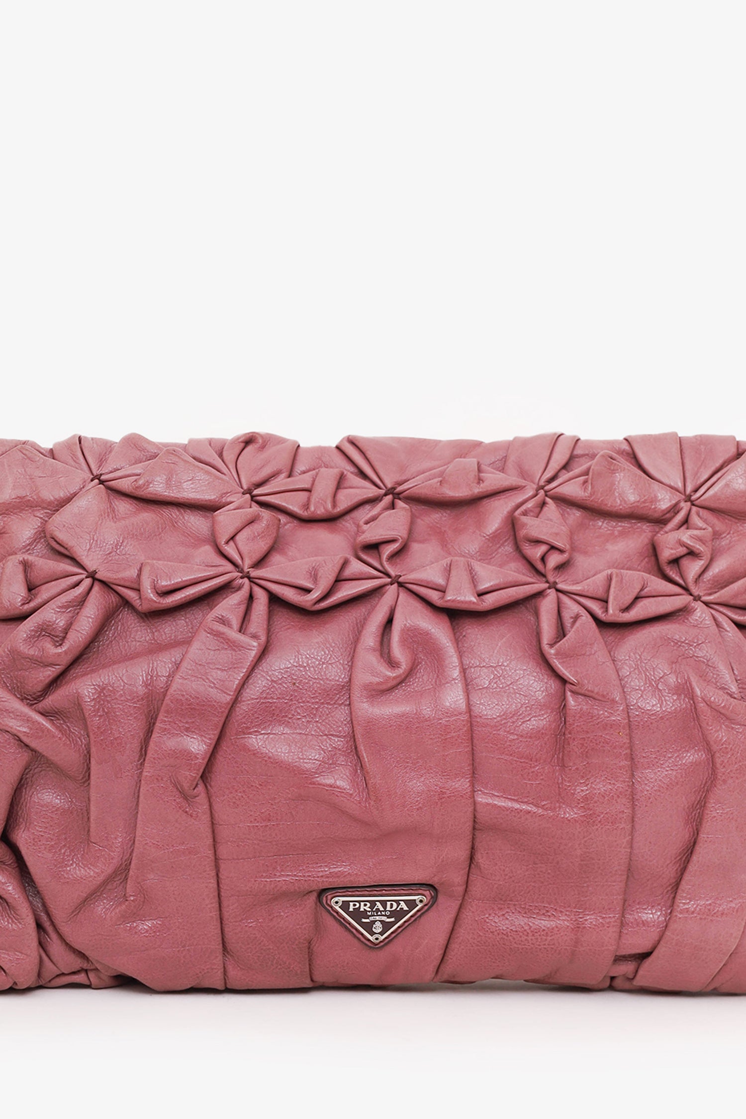 Refresh availabilityPrada Purple Leather Gaufre Clutch. Top zip closure. Open satin interior. Single interior wall pocket with zip closure. Tonal stitching.