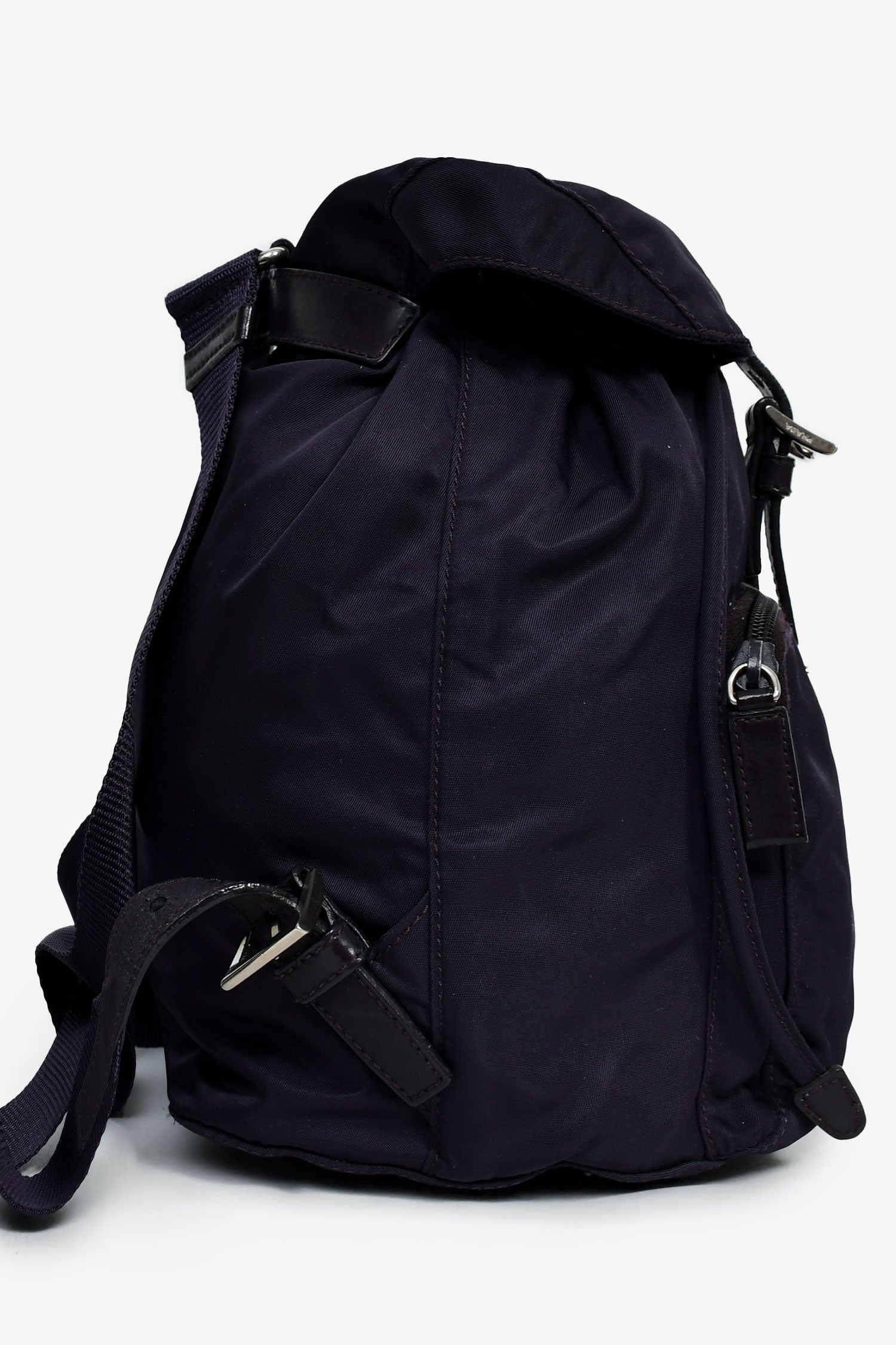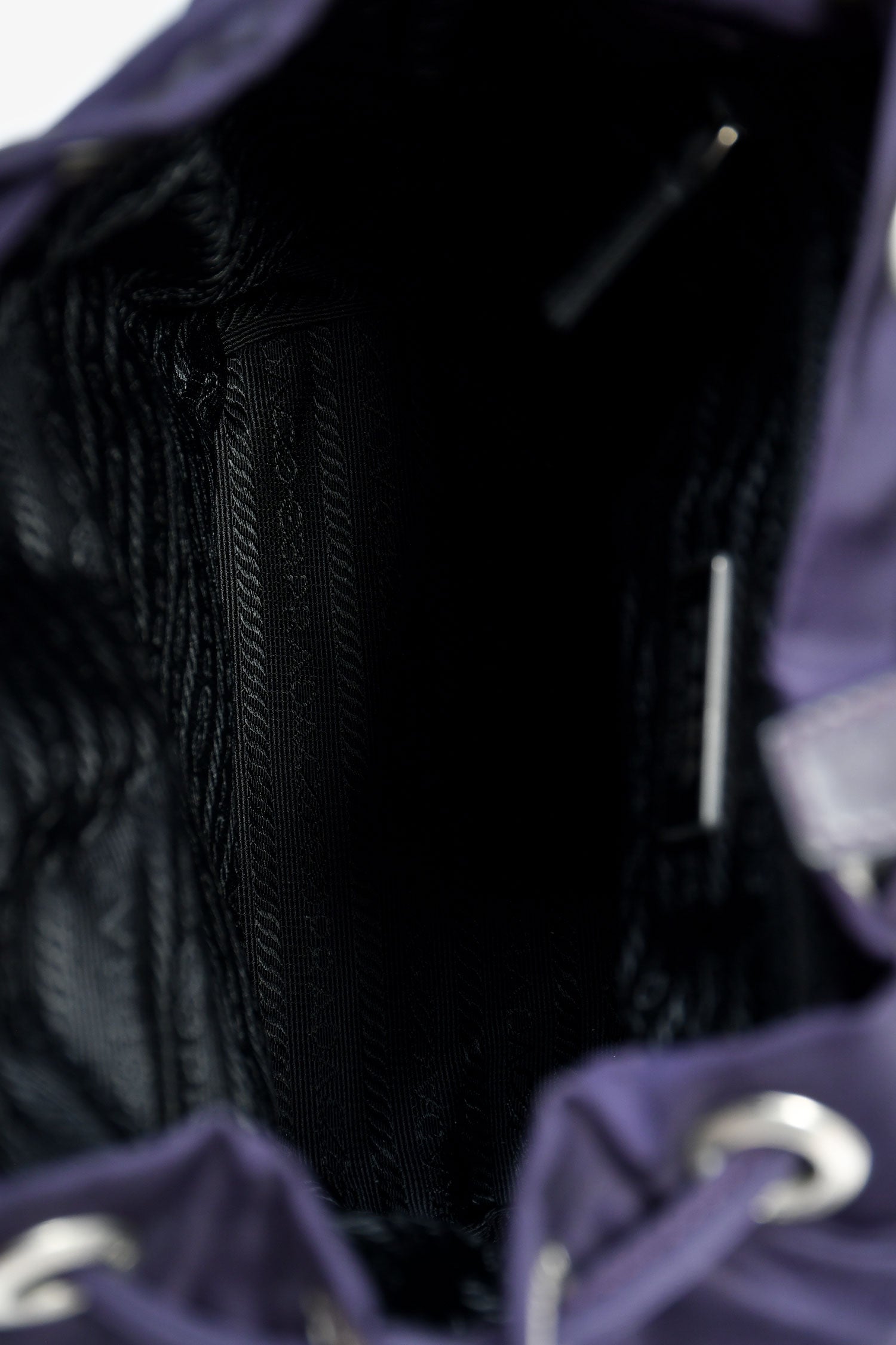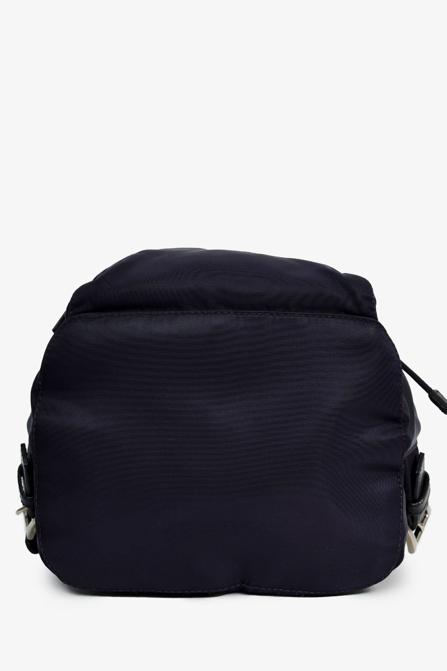 Refresh availabilityPrada Purple Nylon Single Buckle Backpack. Front zip pocket. Front fold-over flap with magnetic and strap with buckle closure. Front drawstring closure. Black logo'd textile interior lining. Single interior wall zip pocket. Adjustable straps. Silver-tone hardware.