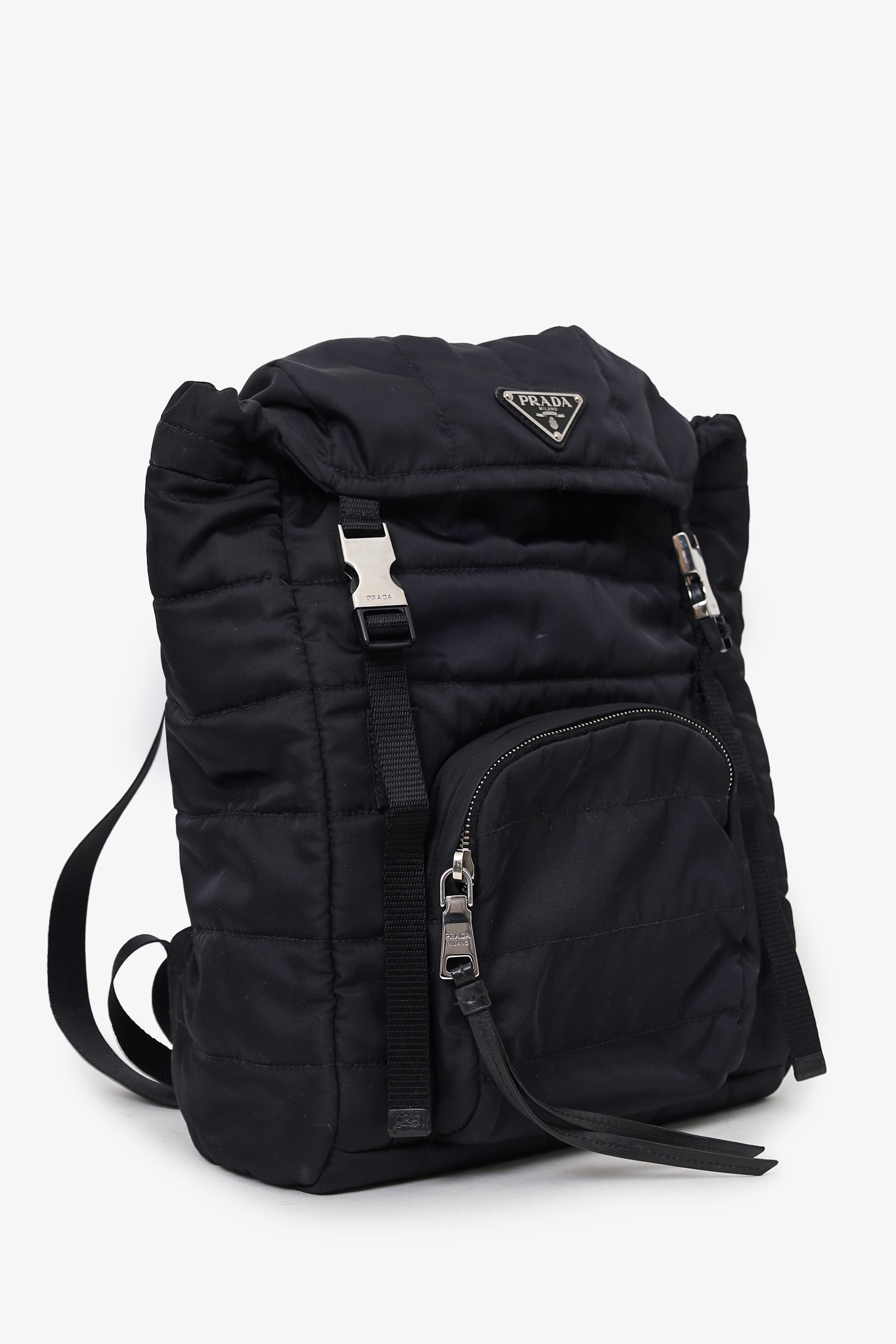 Refresh availabilityPrada Quilted Tessuto Nylon Double Buckle Backpack. Top fold-over flap with double adjustable buckle closure. Additional top adjustable cinching drawcord closure. Front exterior zip compartment. Rear adjustable backpack straps. Rear top handle. Lined interior. 2 interior pockets; 1 zip and 1 slip. Silver-tone hardware. Tonal stitching.