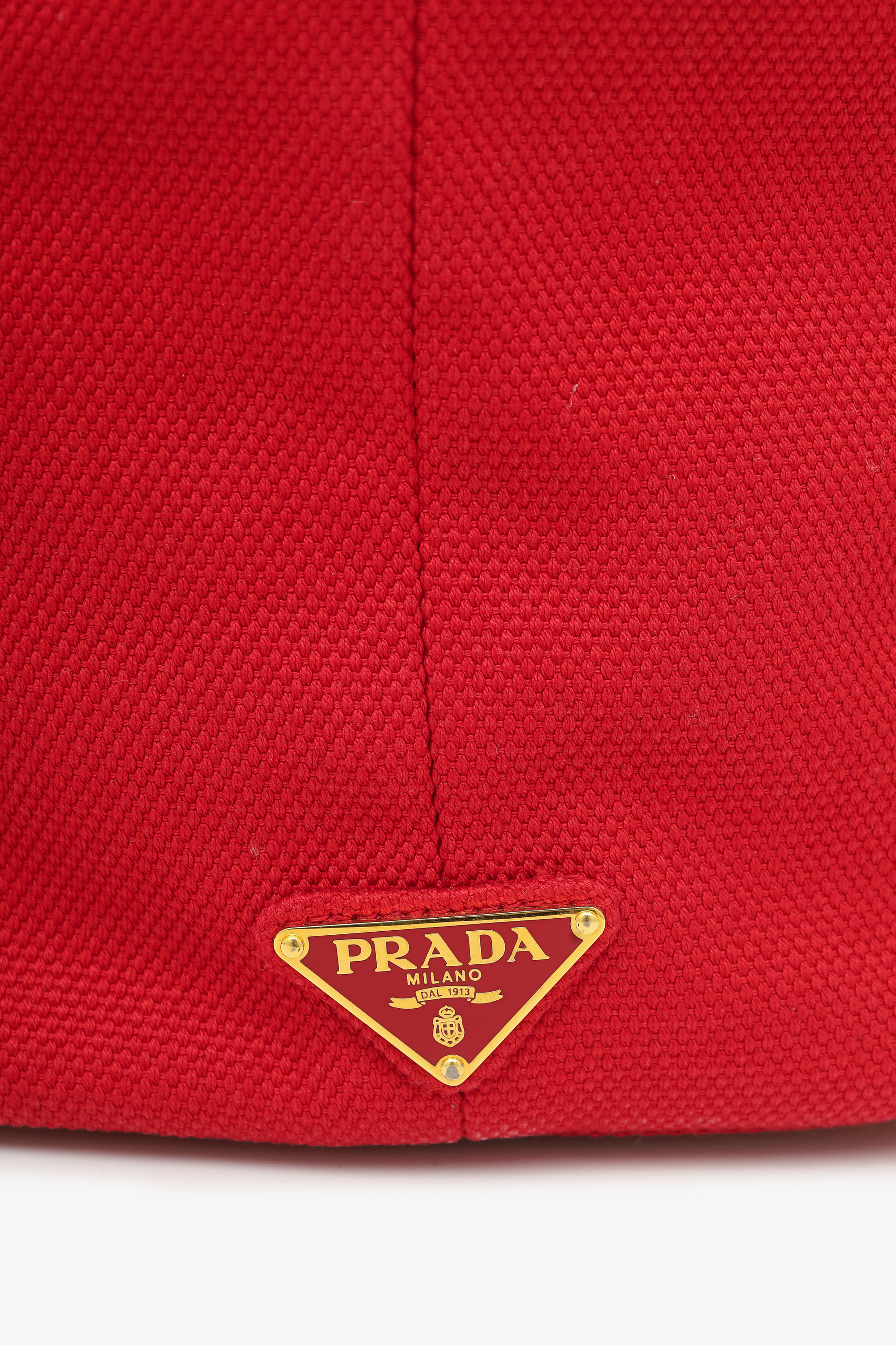 Refresh availabilityPrada Red Canvas Logo Large Tote Bag. Top zip closure. Top handle. 2 interior wall pockets with zip closure. 1 interior wall pocket. Tonal stitching.