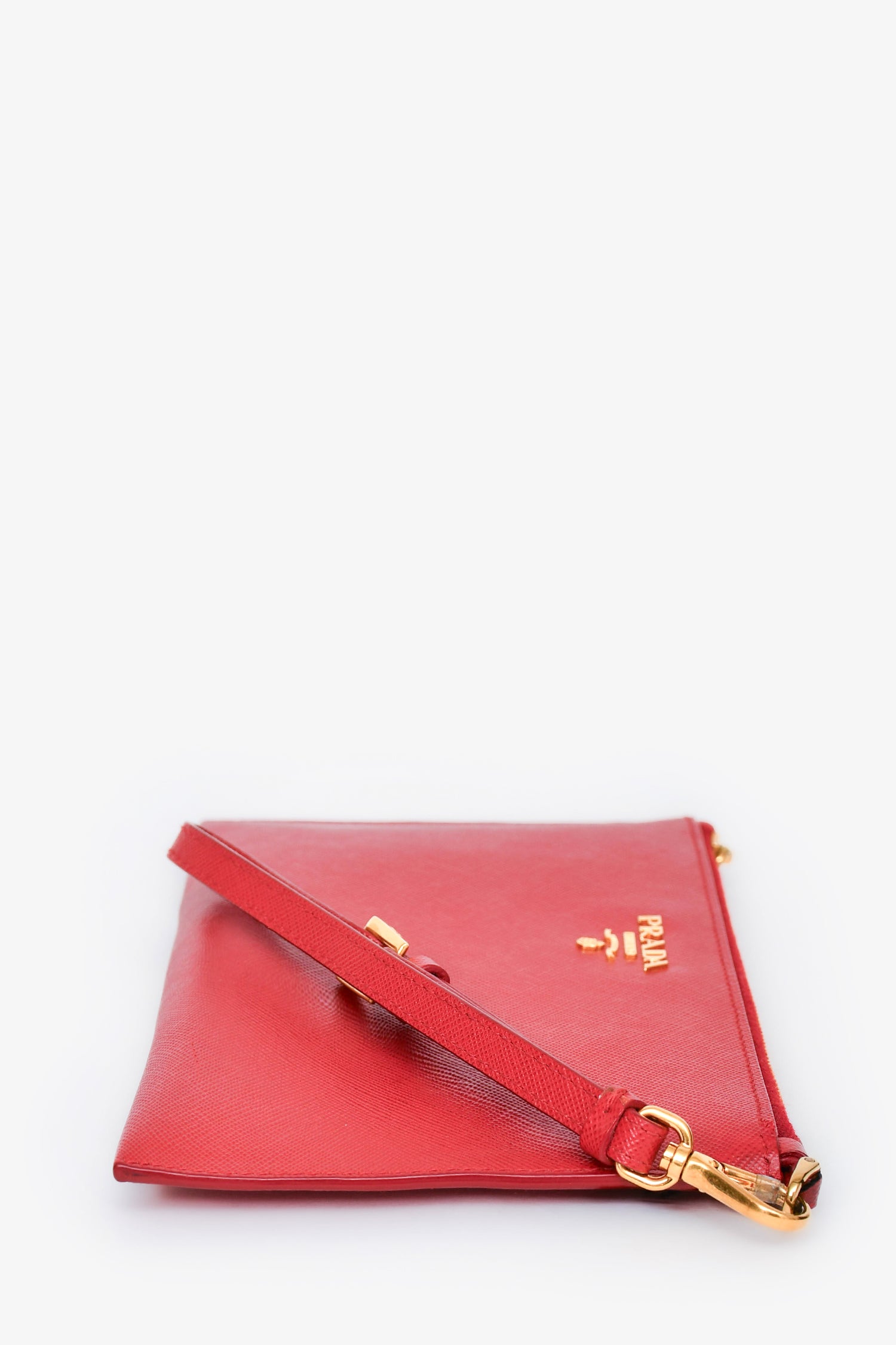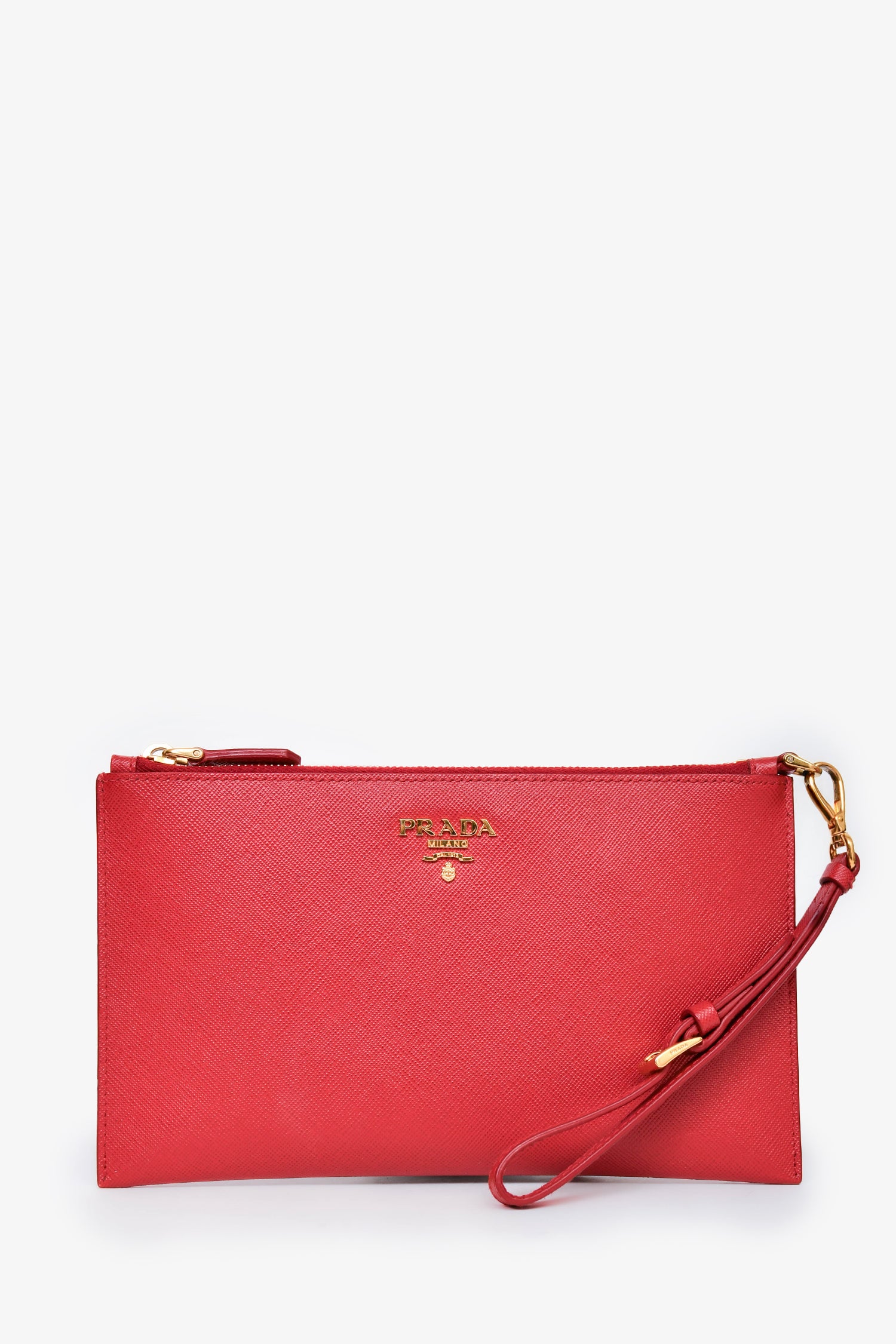 Refresh availabilityPrada Red Saffiano Clutch. 8 interior card holders. Top zipper closure. Gold-tone hardware. Tonal stitching.