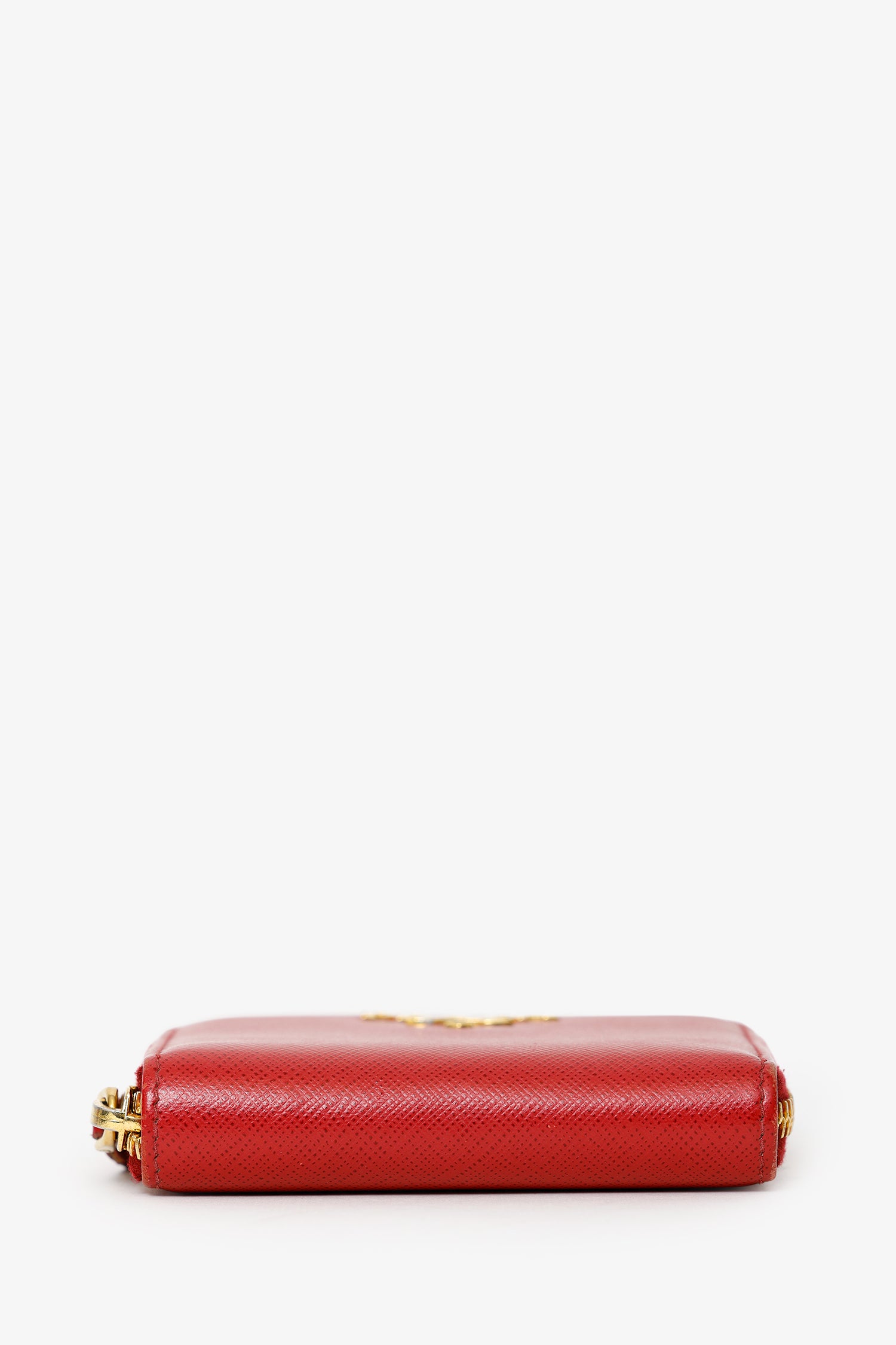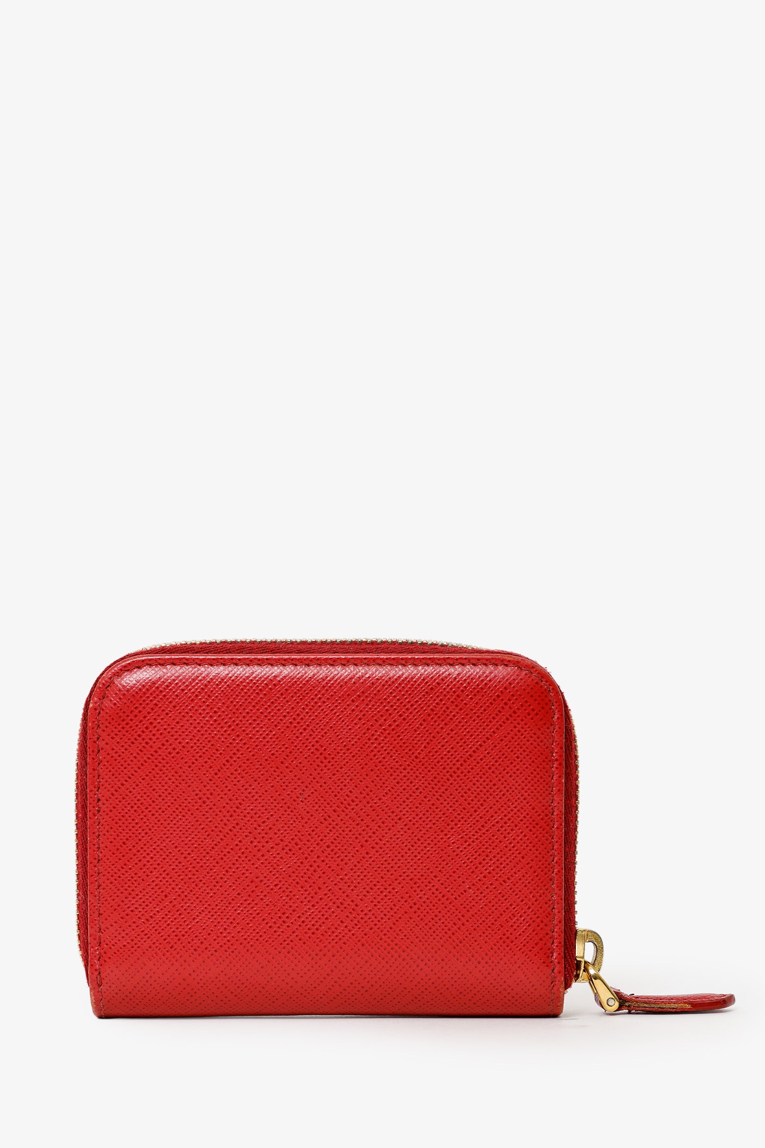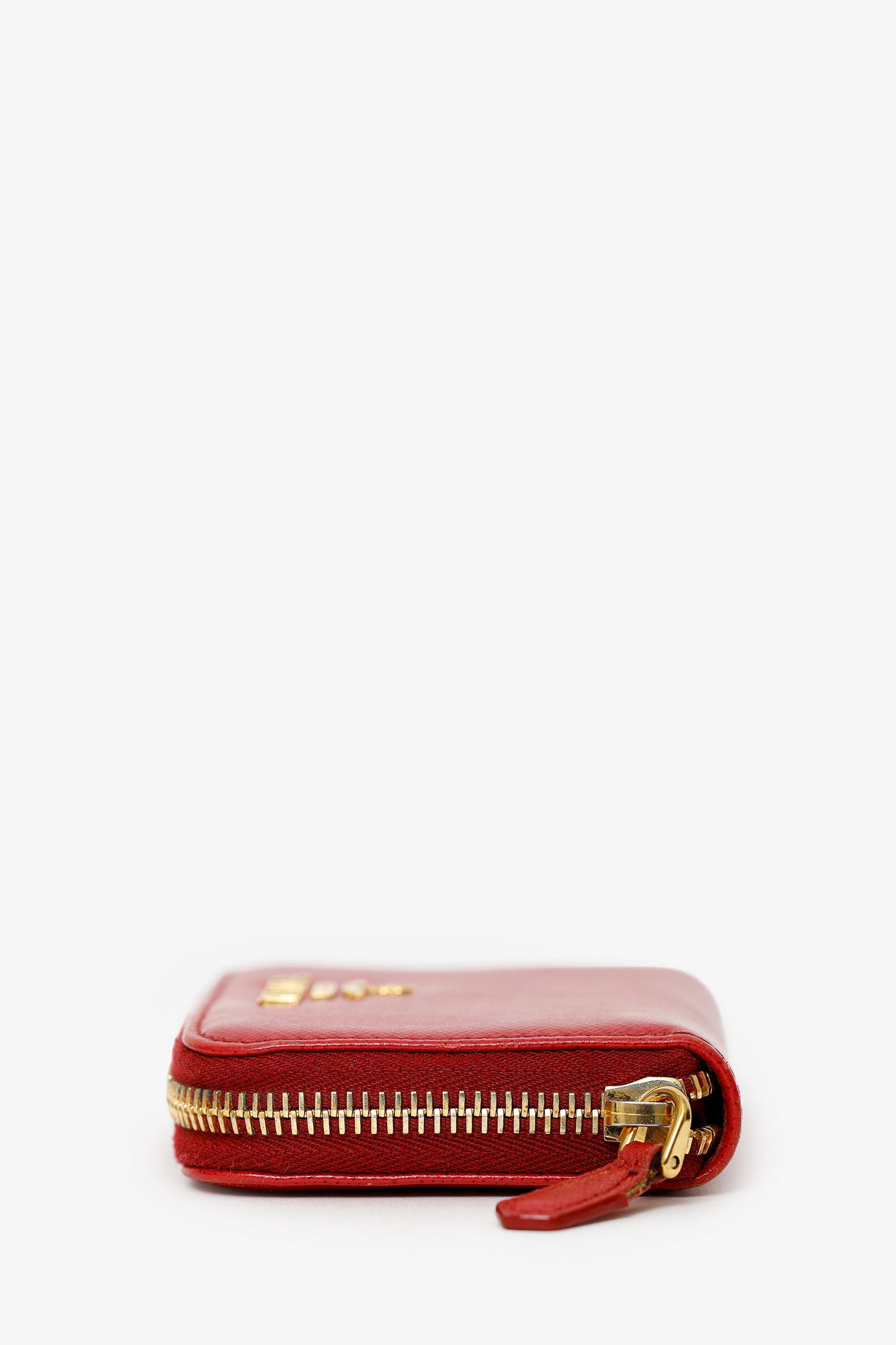 Refresh availabilityPrada Red Saffiano Metal Leather Zip Card Holder. Top wrap-around closure. Leather-lined interior with 6 pockets; 4 card slots, and 2 open pockets. Gold-tone hardware. Tonal stitching.