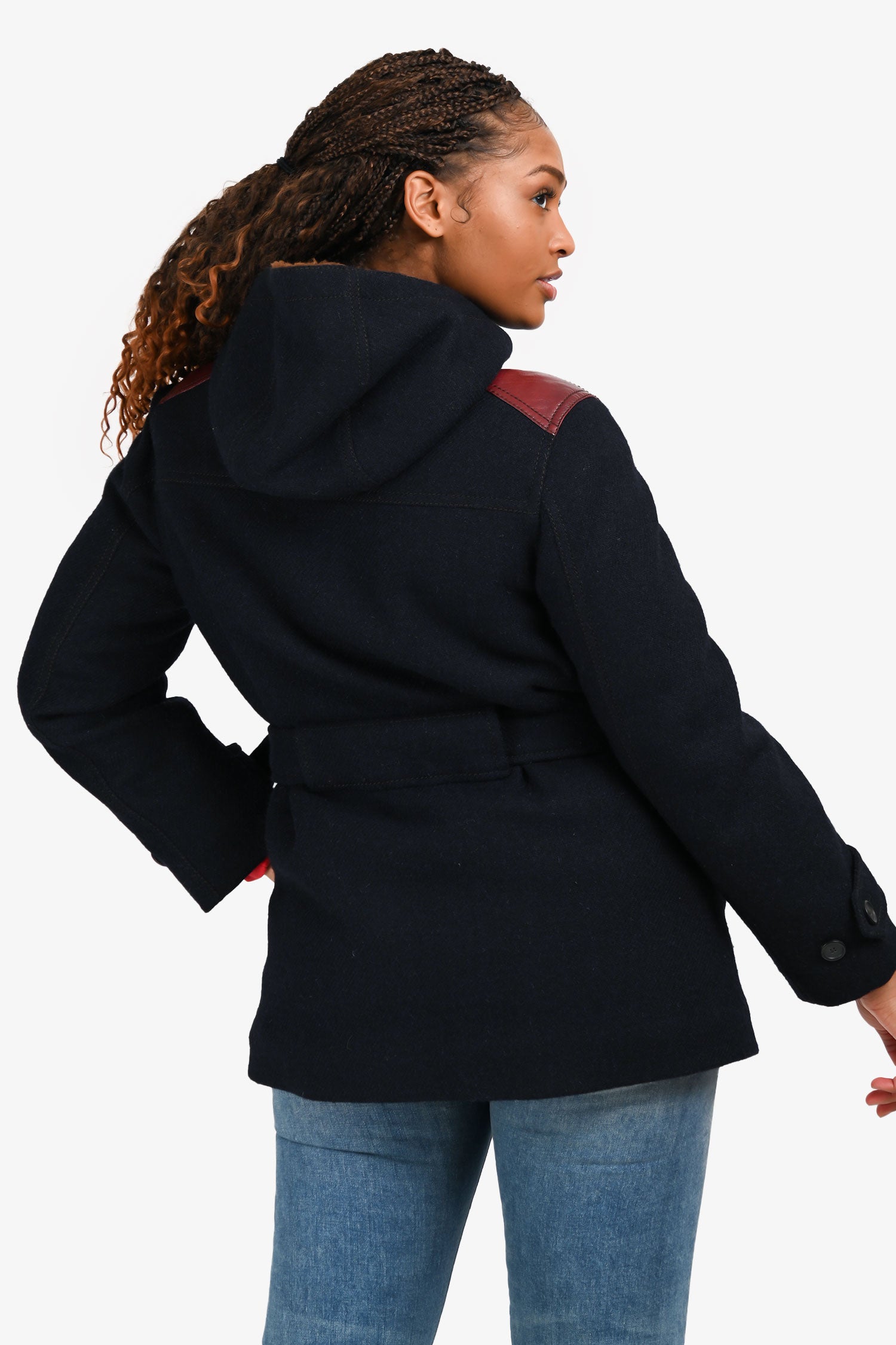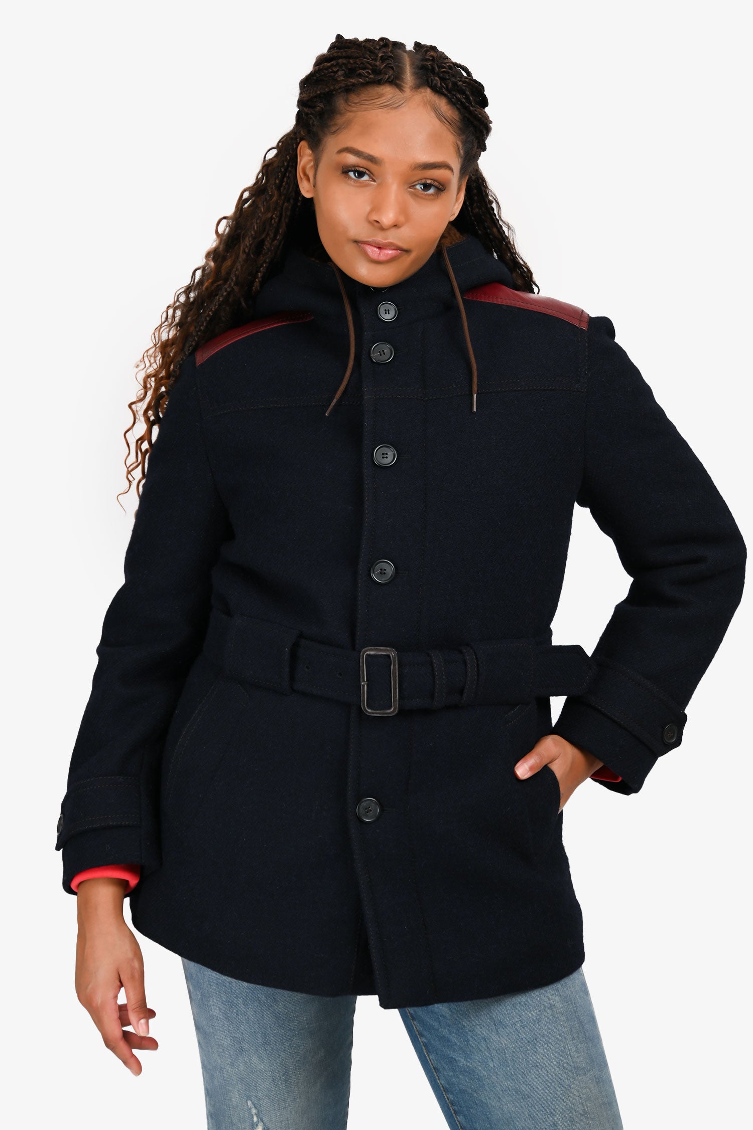 Refresh availabilityPrada Navy Wool/Faux Fur Jacket. Slip-on. Hooded neckline. Front zip and button-up closure. Drawstring hood. Contrast leather shoulder detail. Cuffs with straps and button-up closure. Waist belt with buckle. 2 exterior slip pockets; 2 interior slip pockets with button-up closure. Fully lined in faux fur. Contrast stitching.