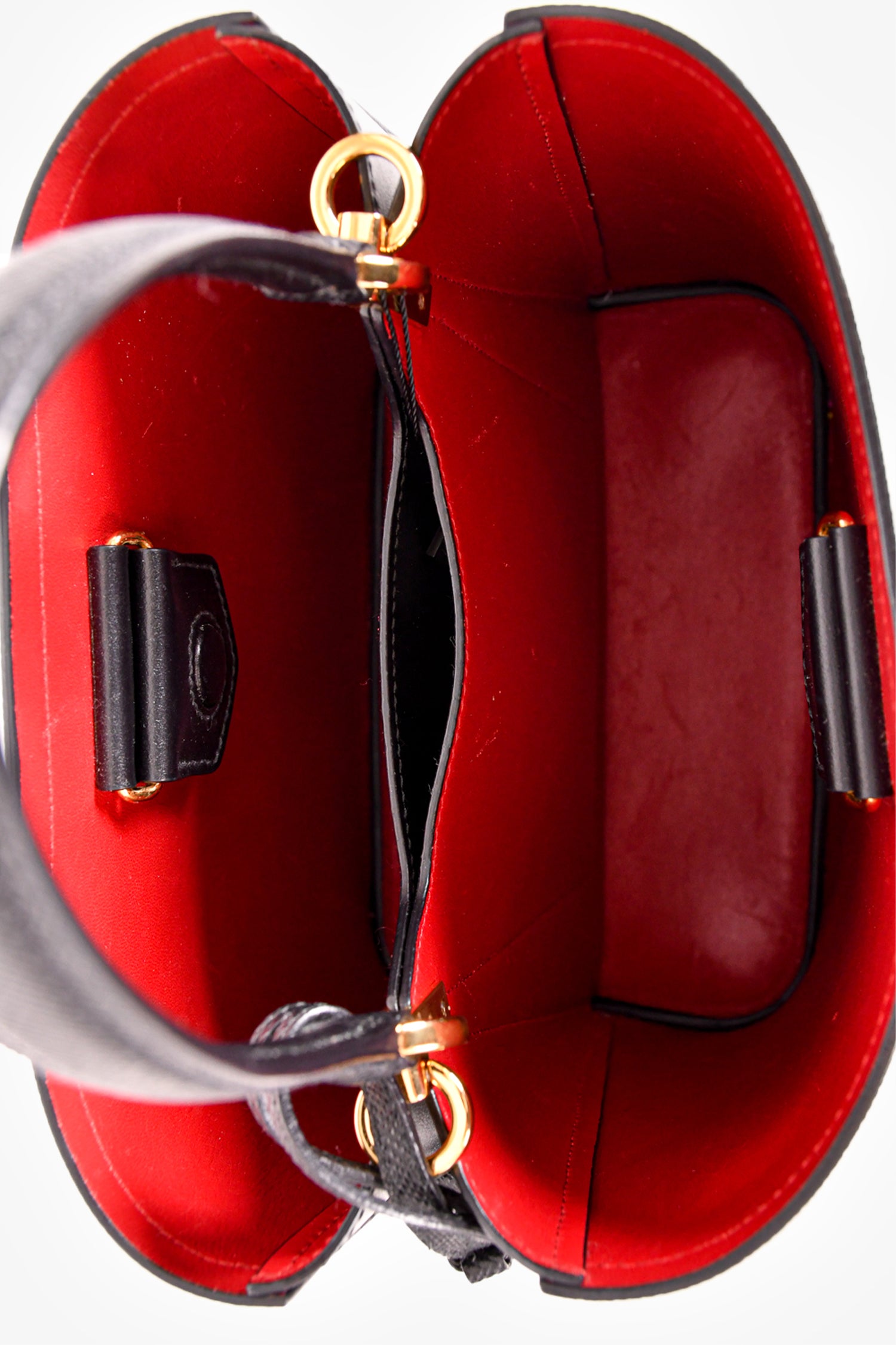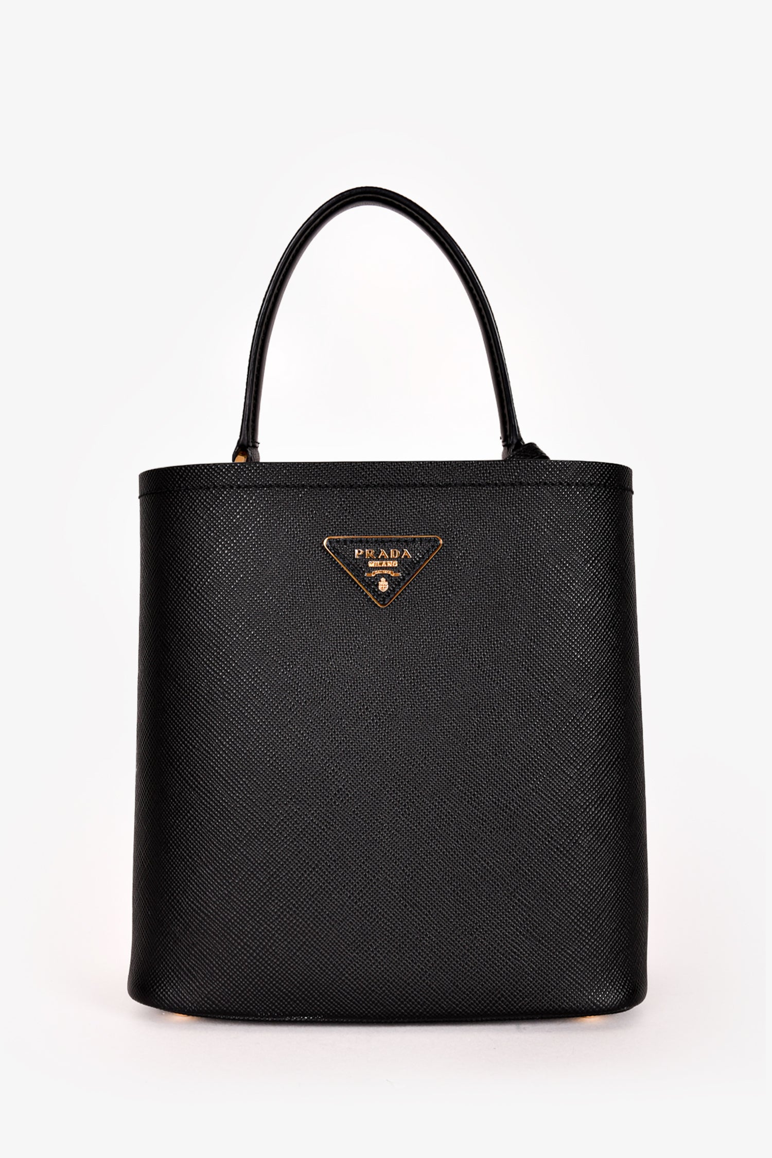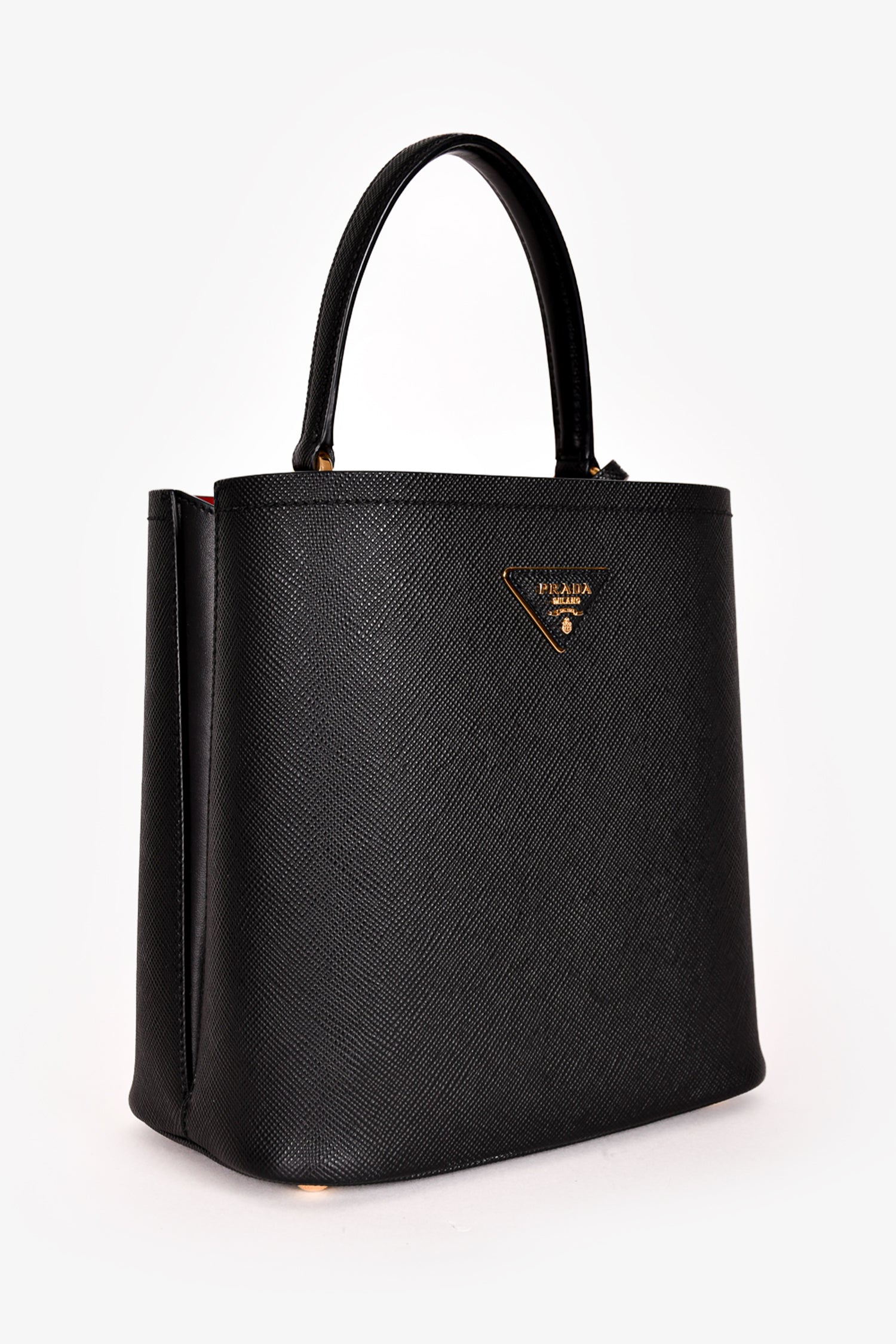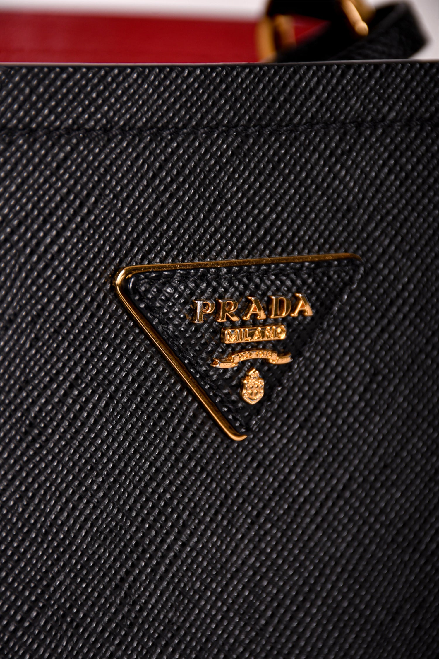 Refresh availabilityPrada Saffiano Panier Medium Bag with Strap. Top handle. Interior magnetic button closure. Red leather interior. 2 interior compartments; separated by a divider. Removable and adjustable strap. Detachable luggage tag. Gold-tone hardware. Tonal stitching.