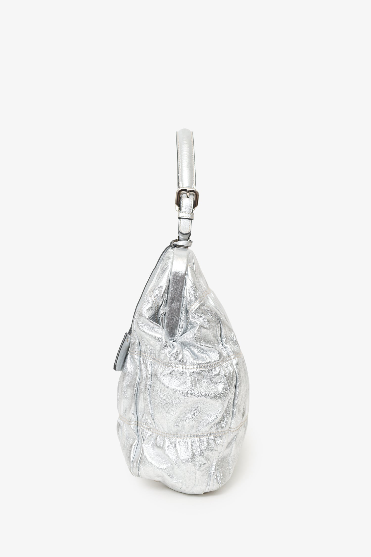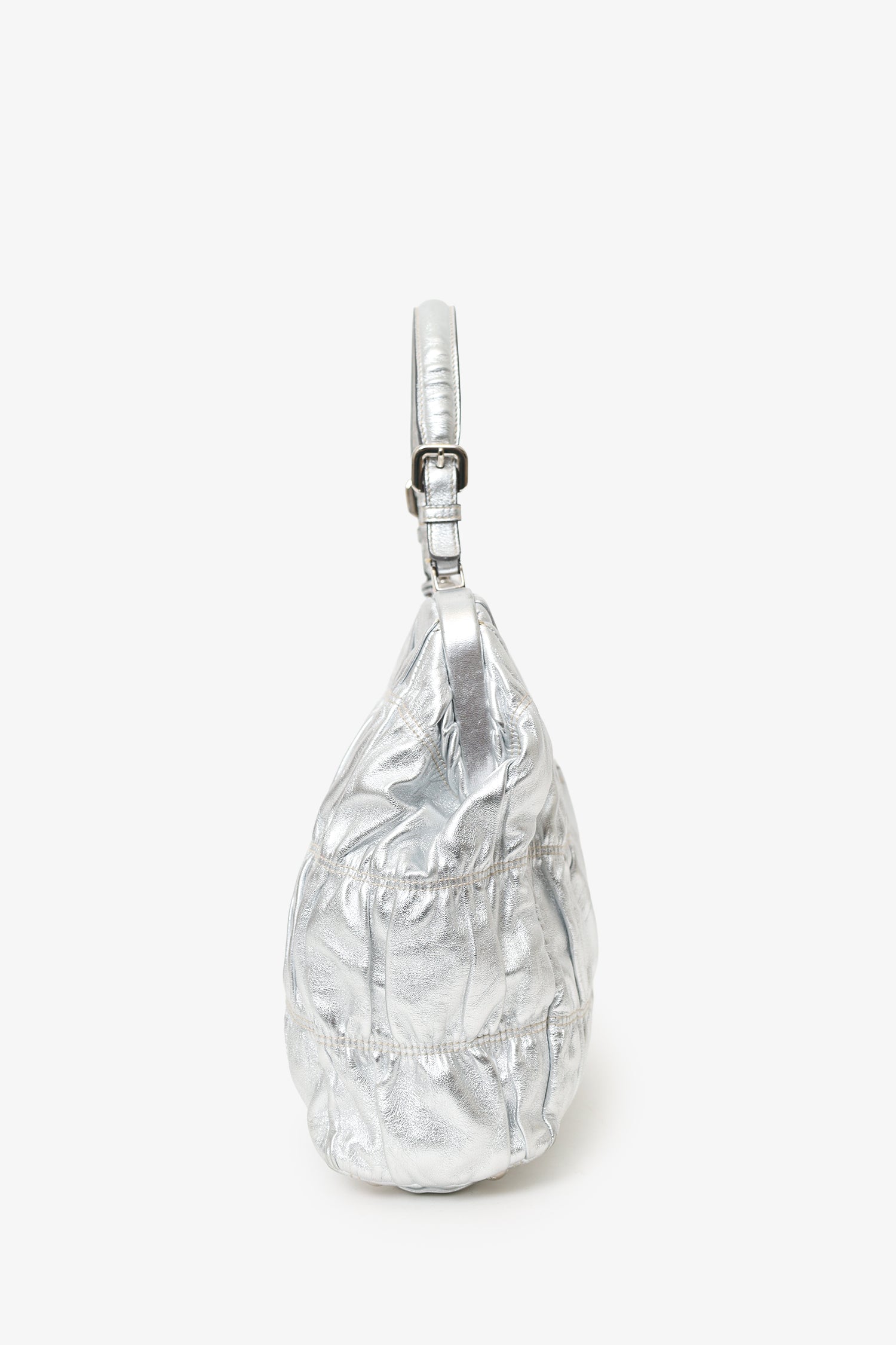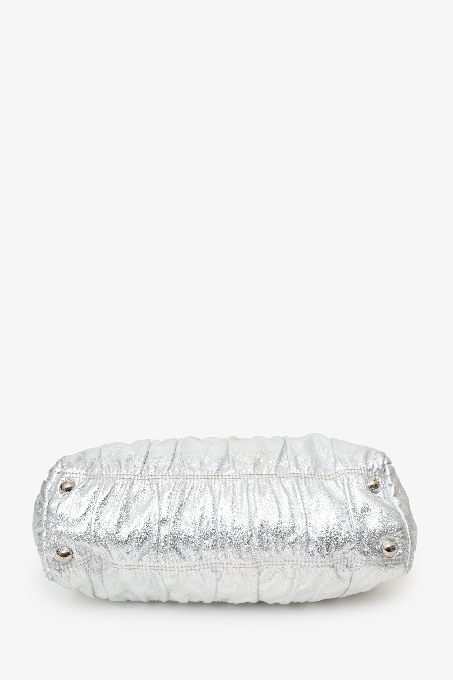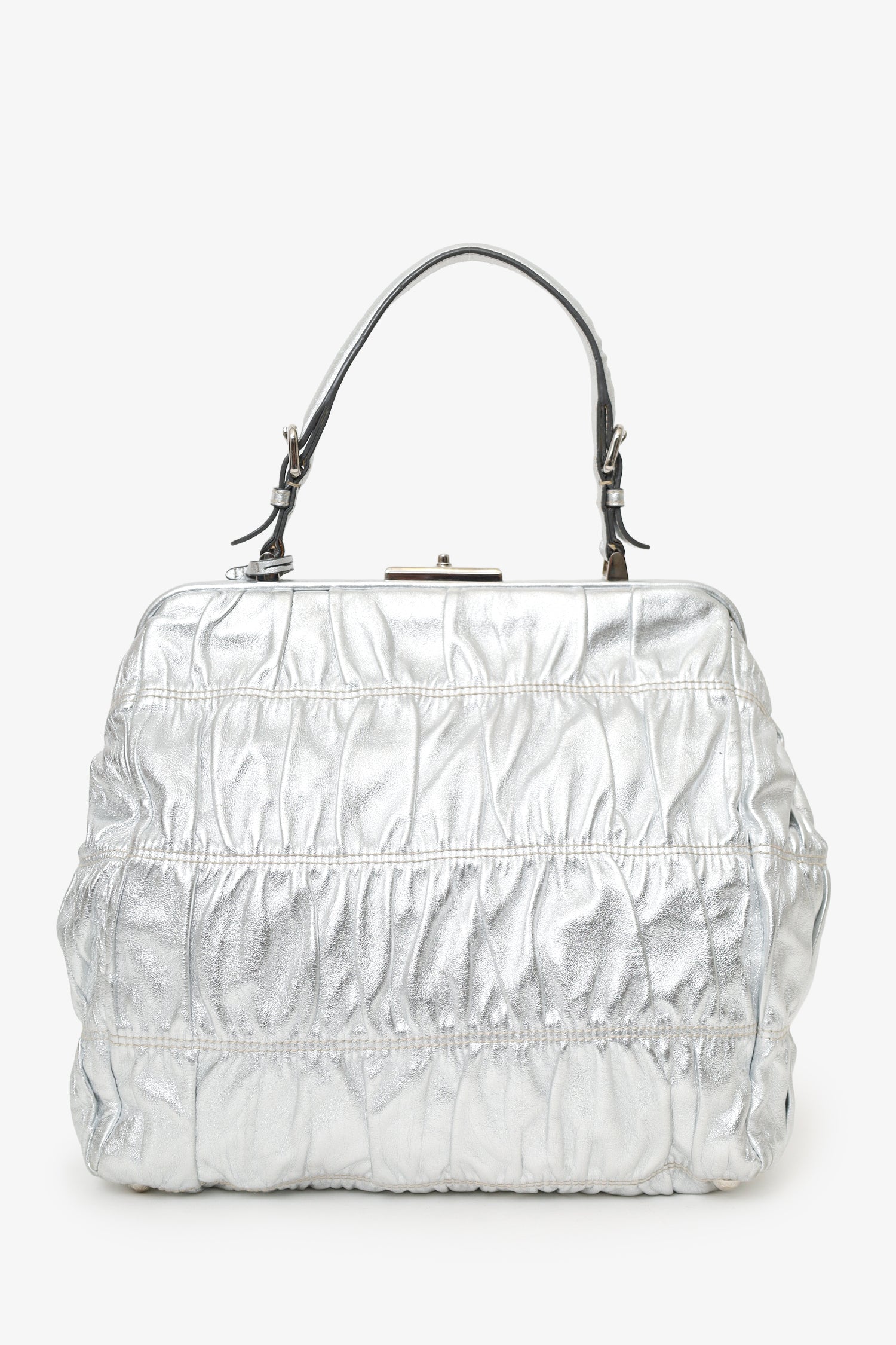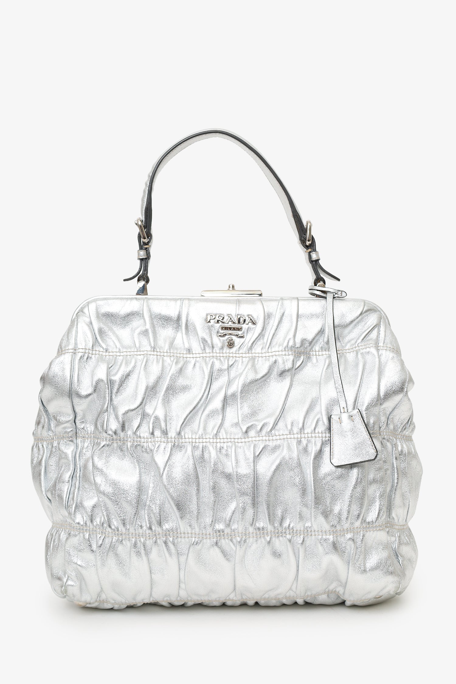 Refresh availabilityPrada Silver Leather Dressy Gaufre Bag. Top push-lock closure. Top handle with buckle-up closure. Protective base studs. Lined interior with single zip-up pocket. Removable bag tag. Silver-tone hardware. Tonal stitching.