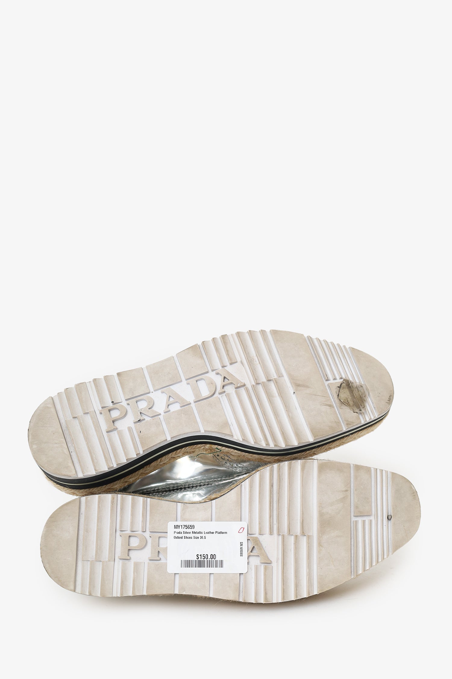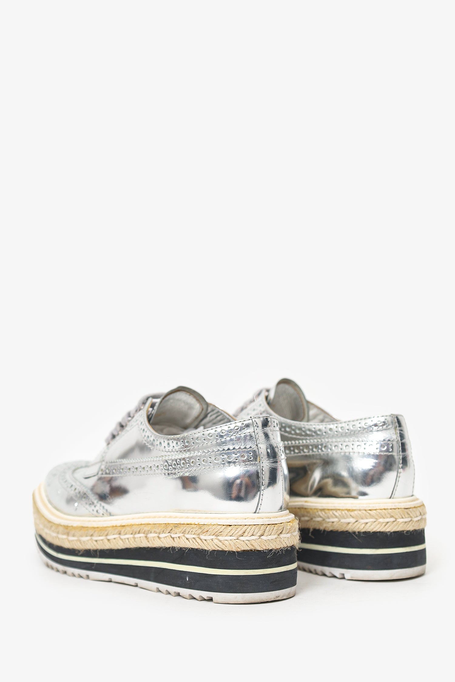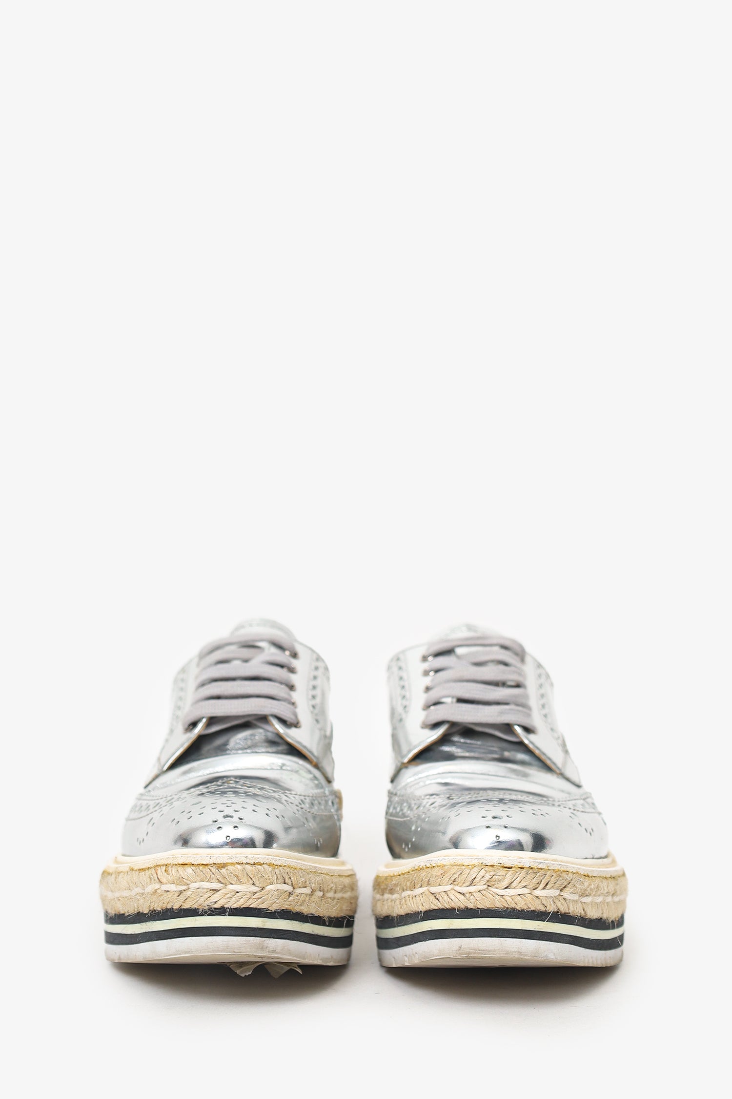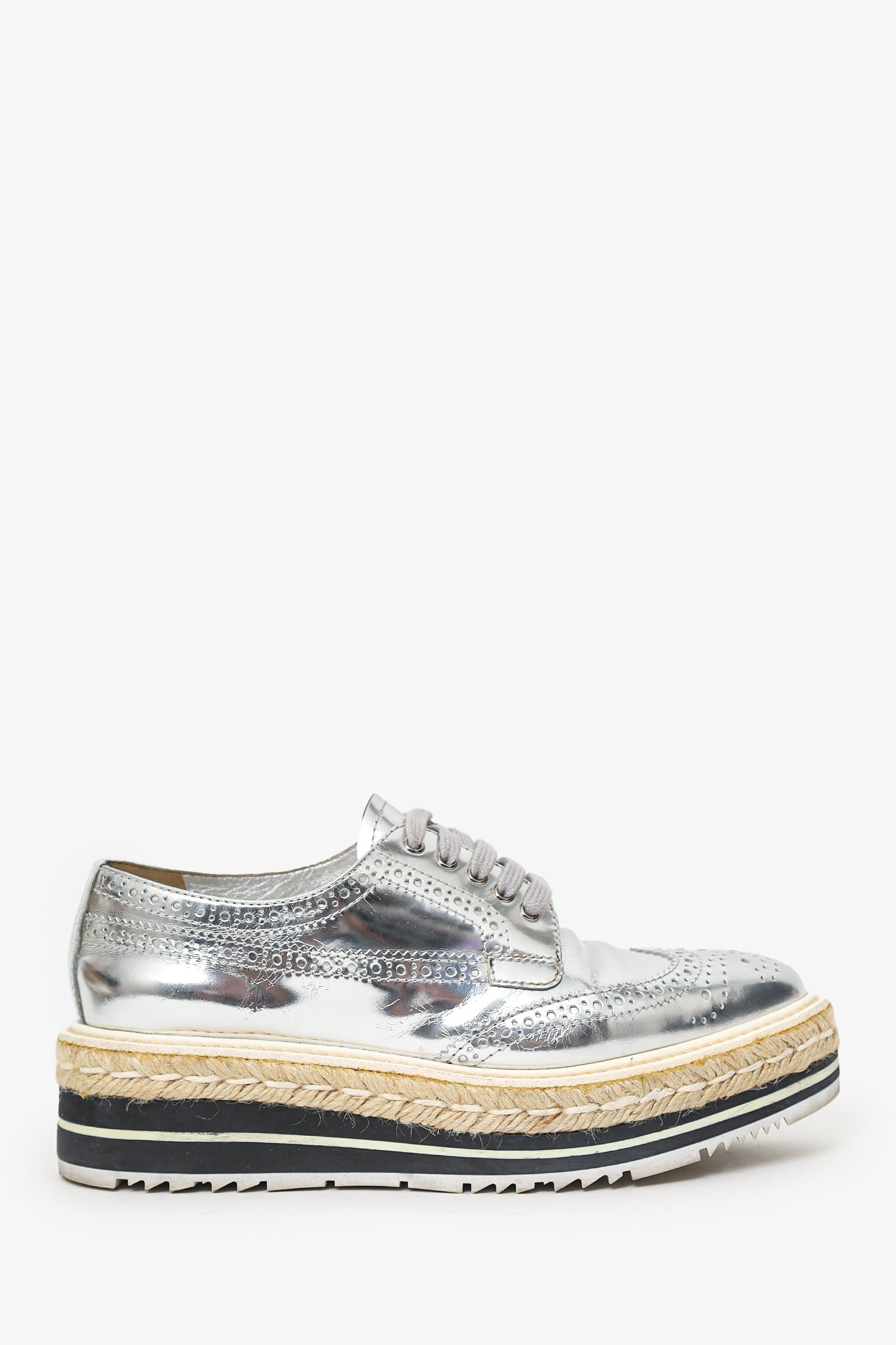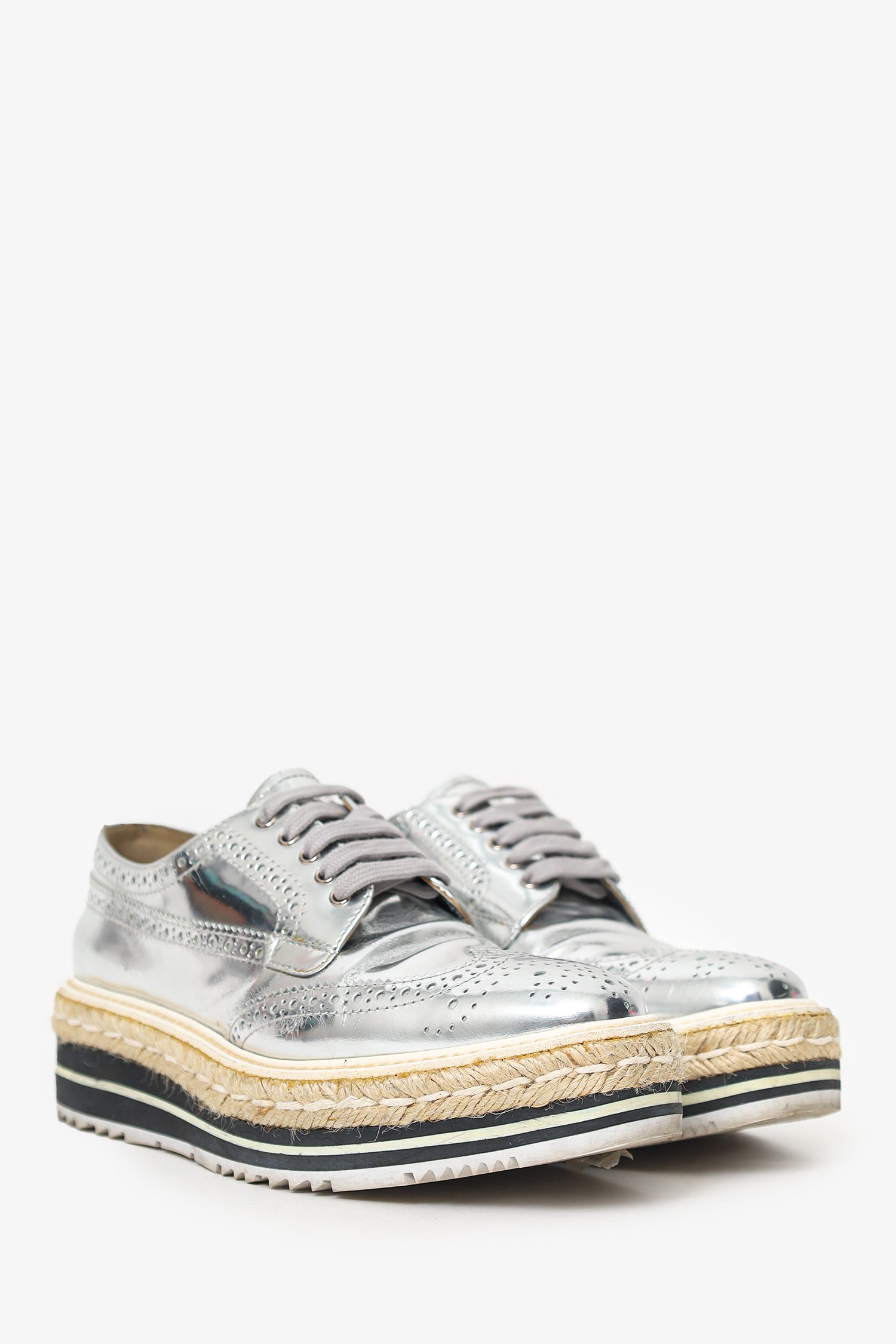 Refresh availabilityPrada Silver Metallic Leather Platform Oxford Shoes. Slip-on. Round toe. Front lace-up closure. Contrast and tonal stitching.