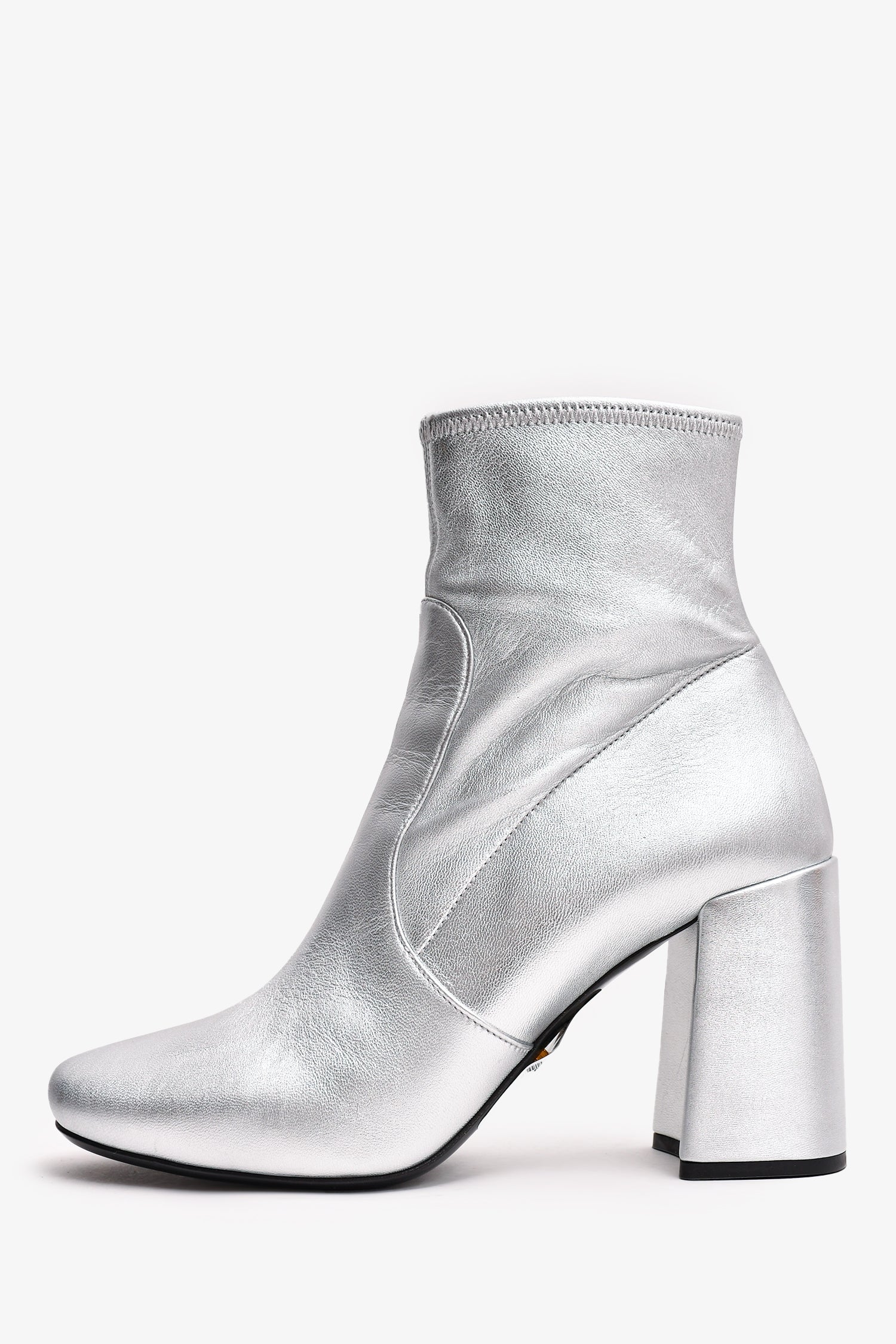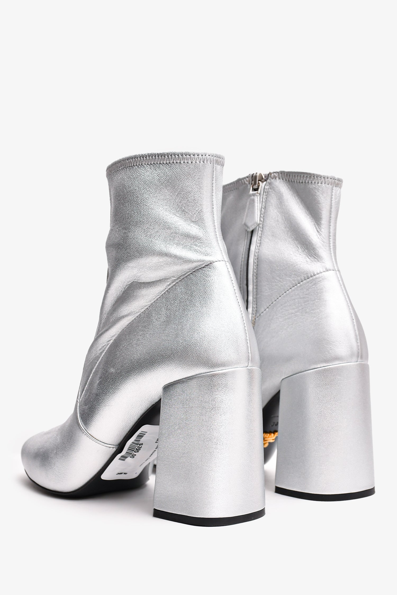Refresh availabilityPrada Silver Metallic Square Toed Ankle Boots. Side zip closure. Block heel.