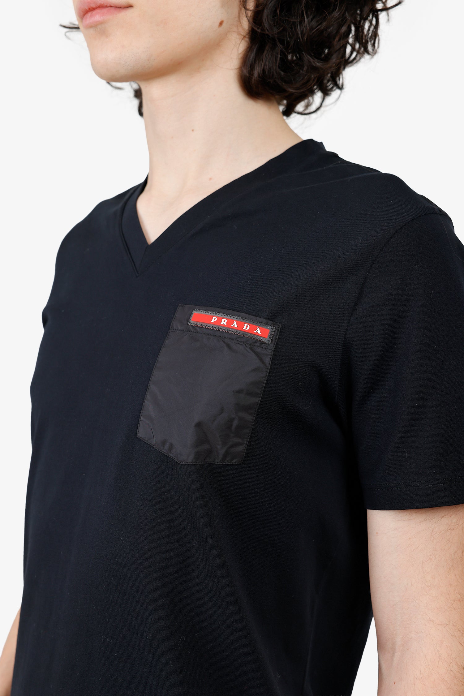 Refresh availabilityPrada Sport Black V-Neck T-Shirt. Pull-on. V-neckline. Single front chest slip pocket. Tonal stitching.