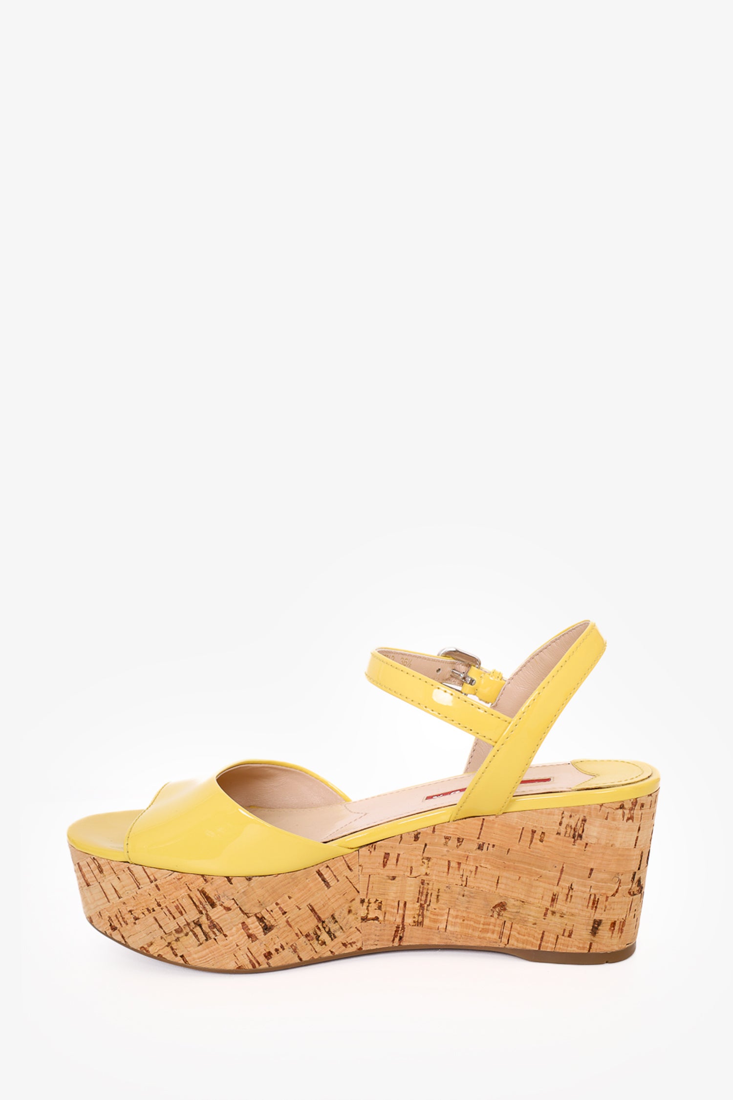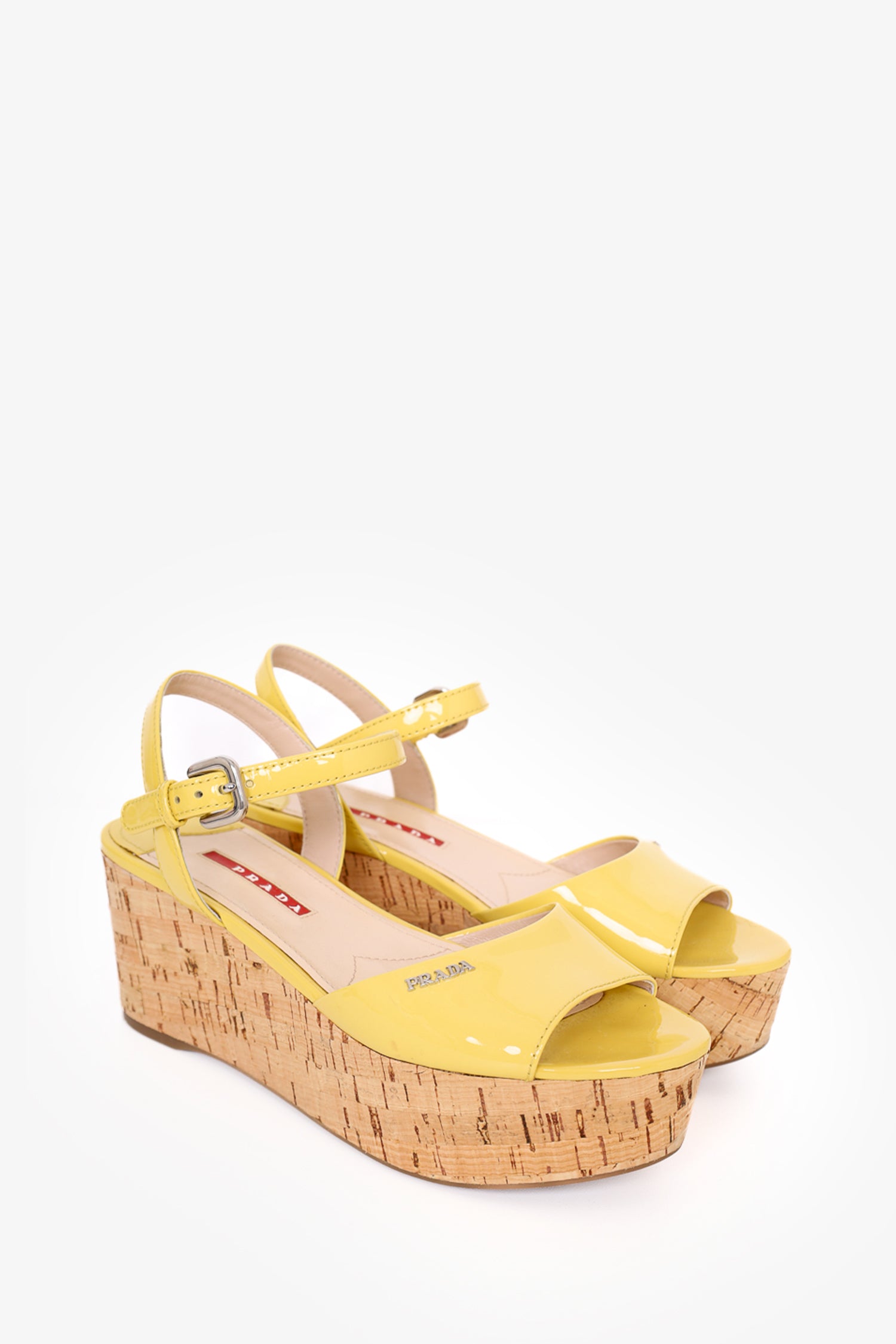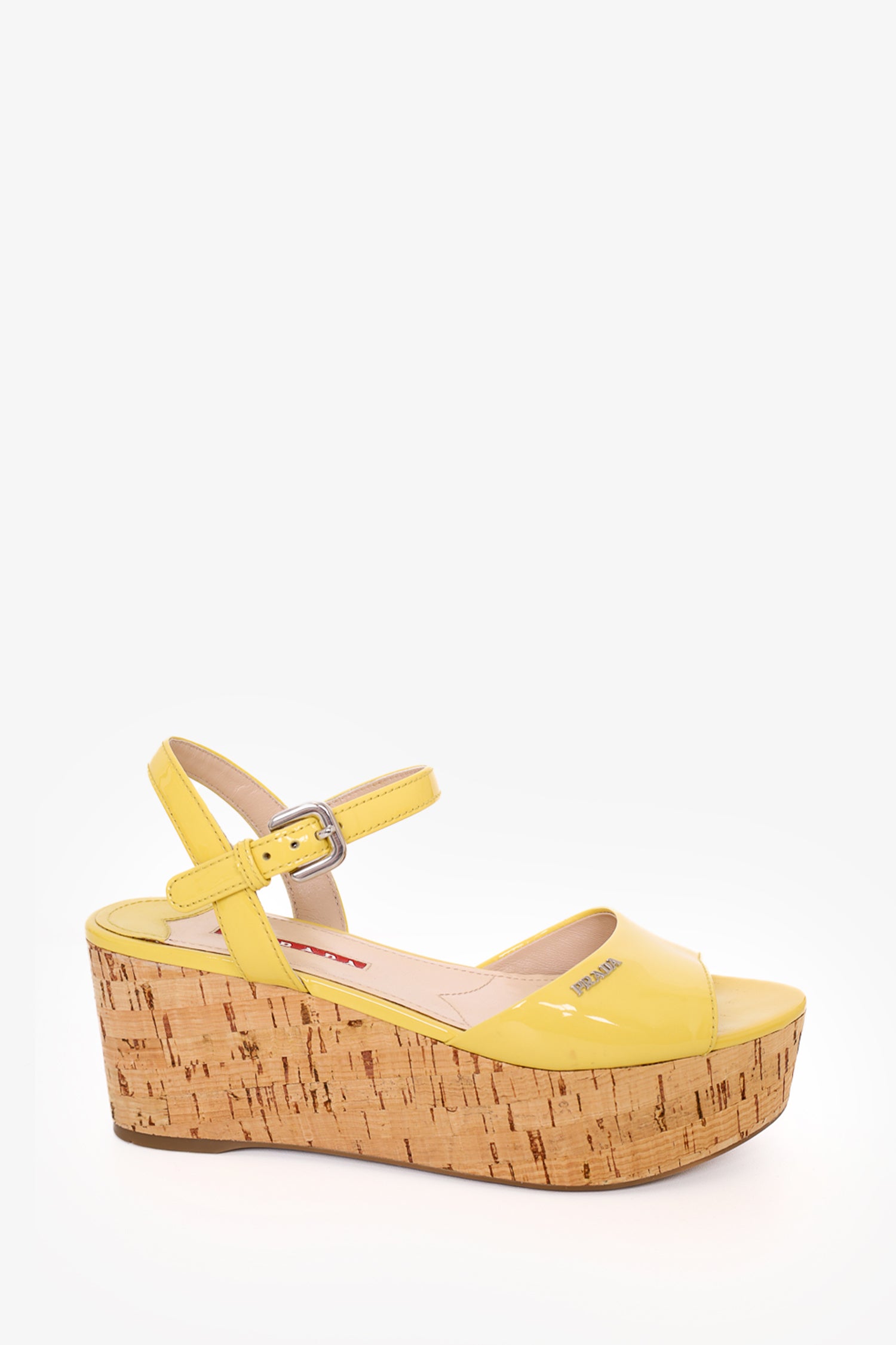 Refresh availabilityPrada Sport Yellow Patent Cork Platform Sandals. Adjustable ankle straps with buckle closure. Tonal stitching. Silver-tone hardware.