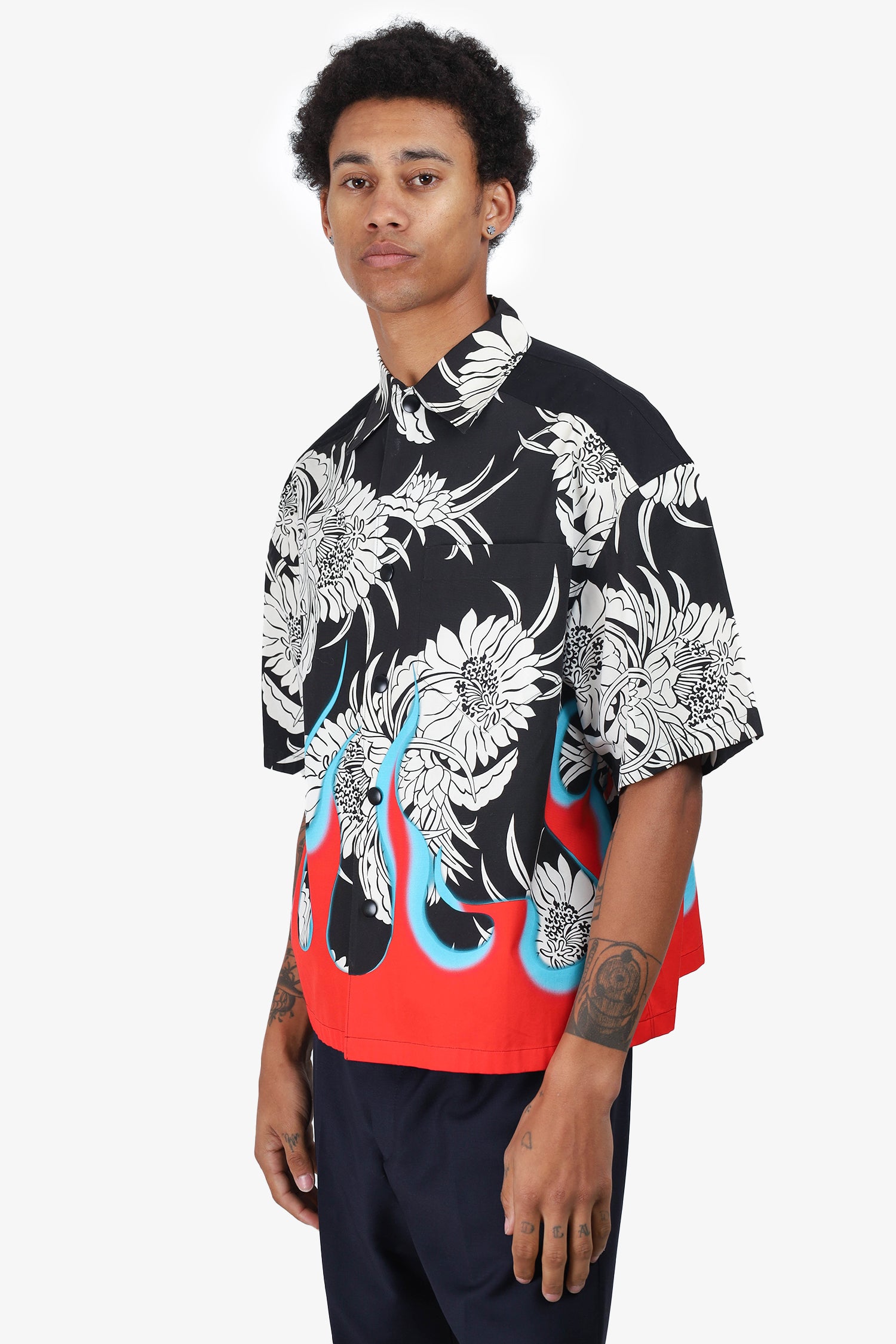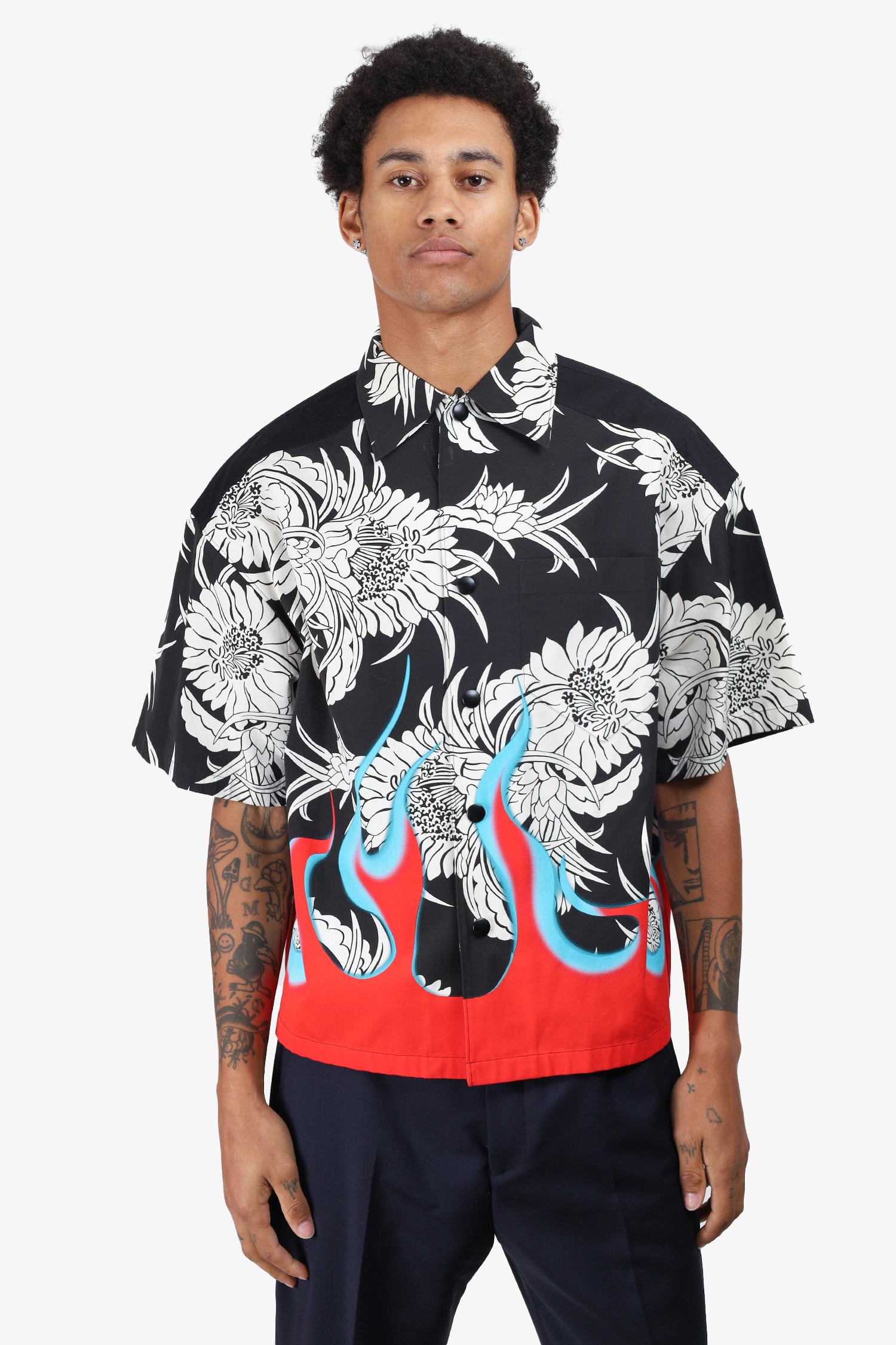 Refresh availabilityPrada SS18 Black/Red Dahlia Flame Bowling Shirt. Collared neckline. Front snap-button closure. Single left chest slip pocket. Tonal stitching.