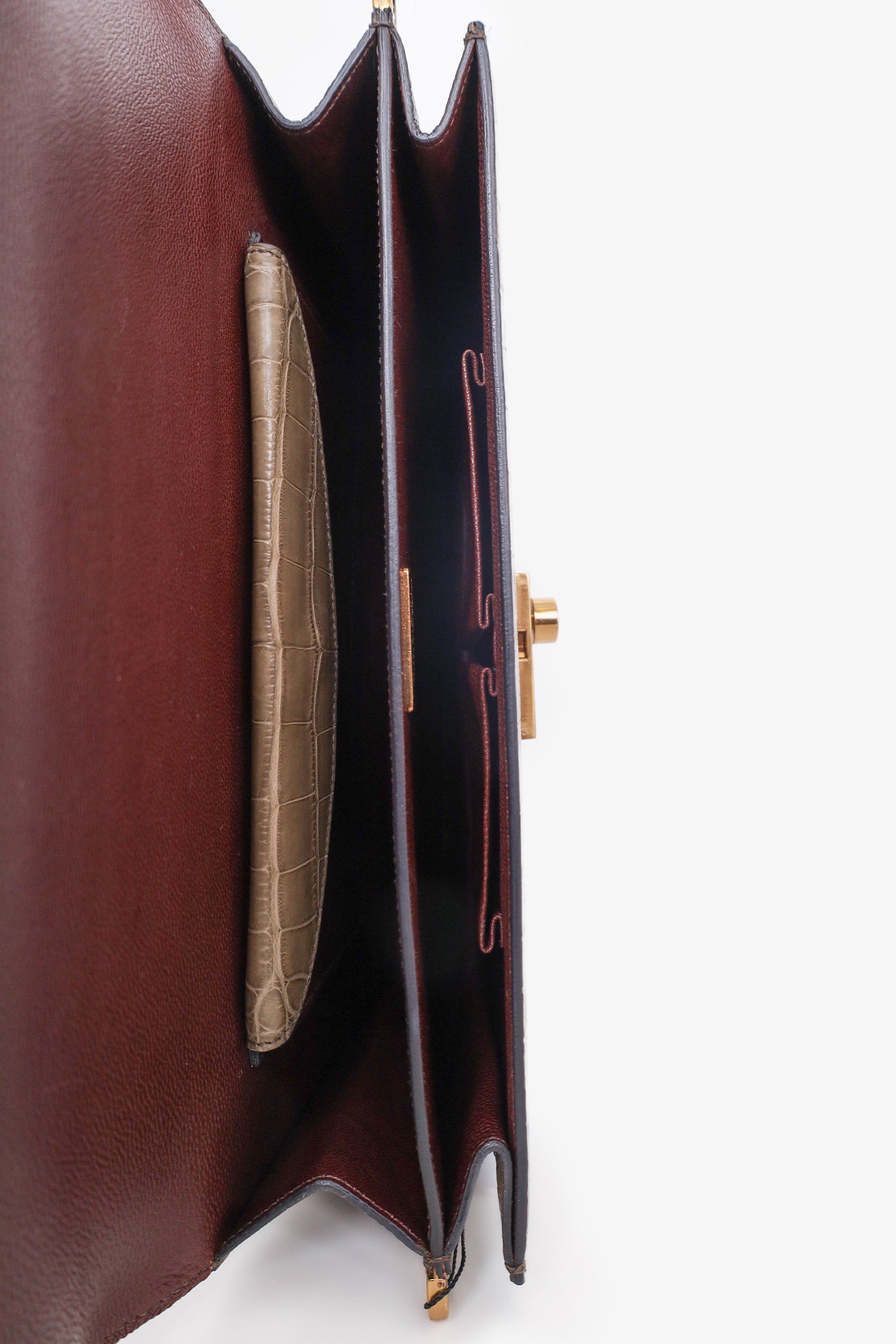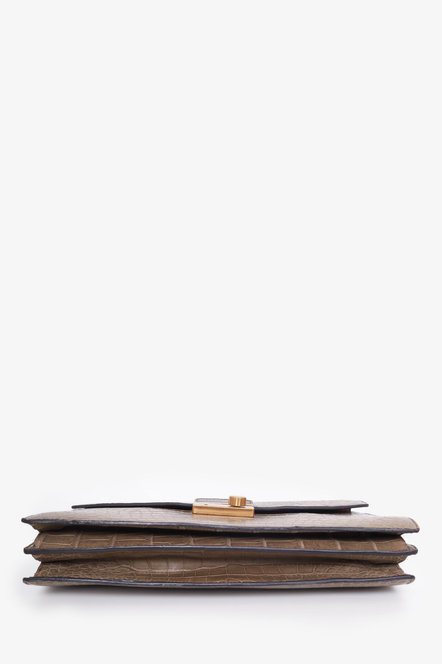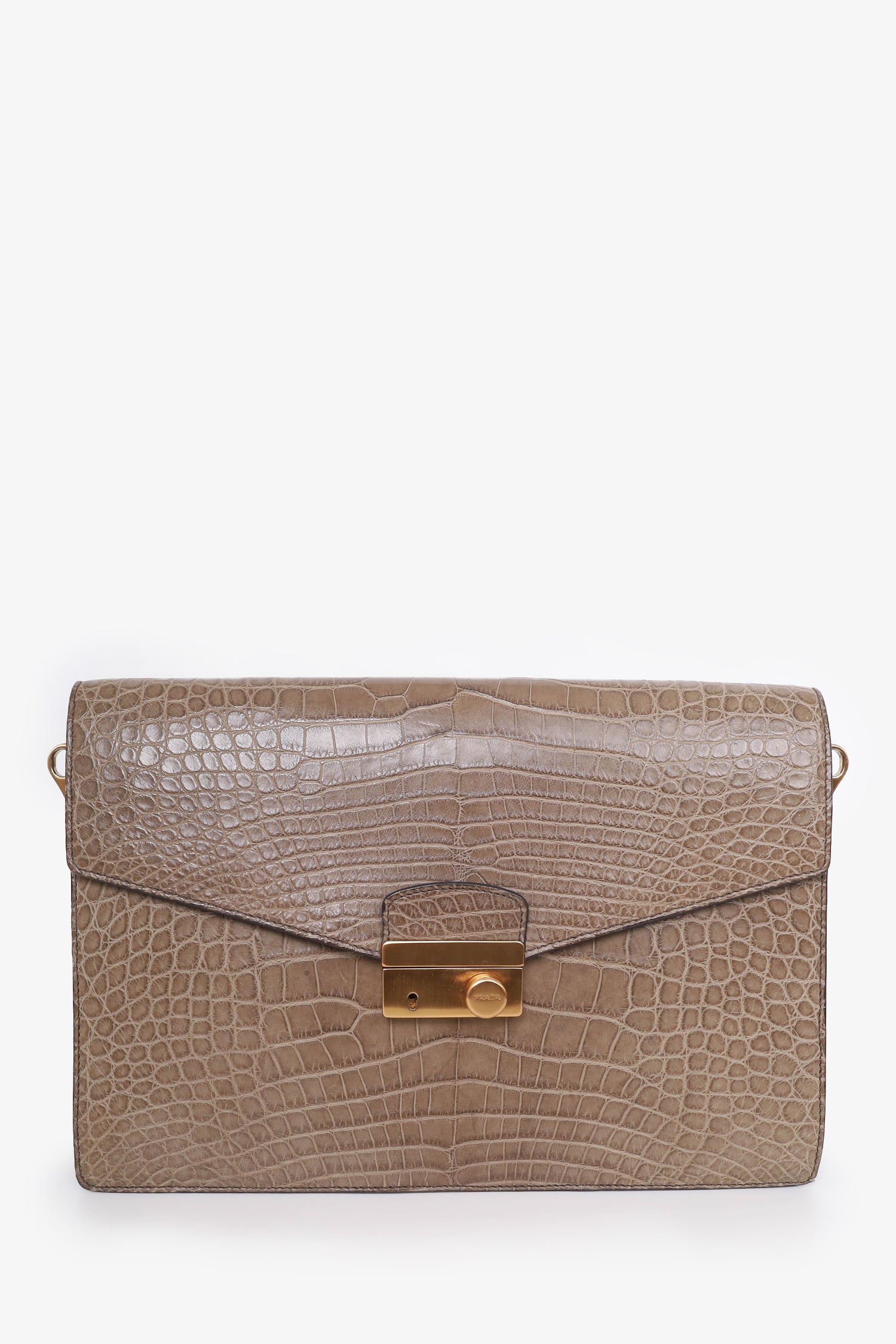 Refresh availabilityPrada Taupe Crocodile Exotic Sound Bag with Strap. Push lock closure. 2 Interior wall slip pocket. 1 interior wall pocket with snap button closure. Removable adjustable closure. Gold tone hardware. Tonal stitching.