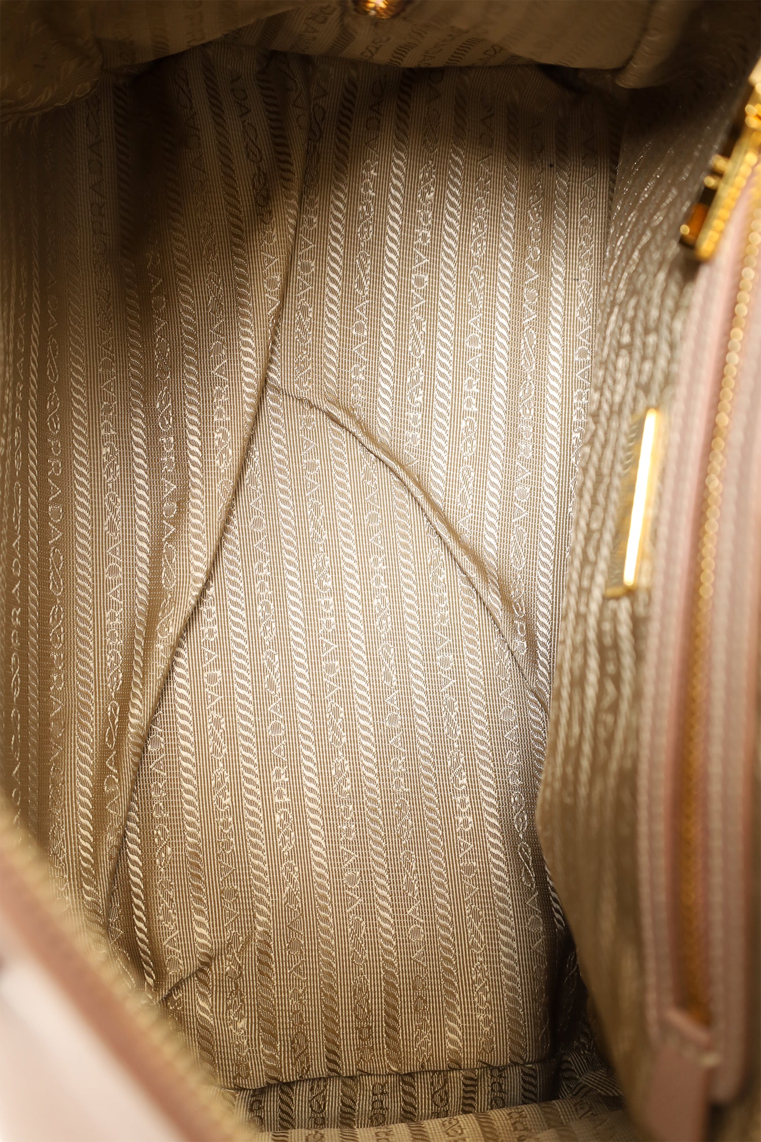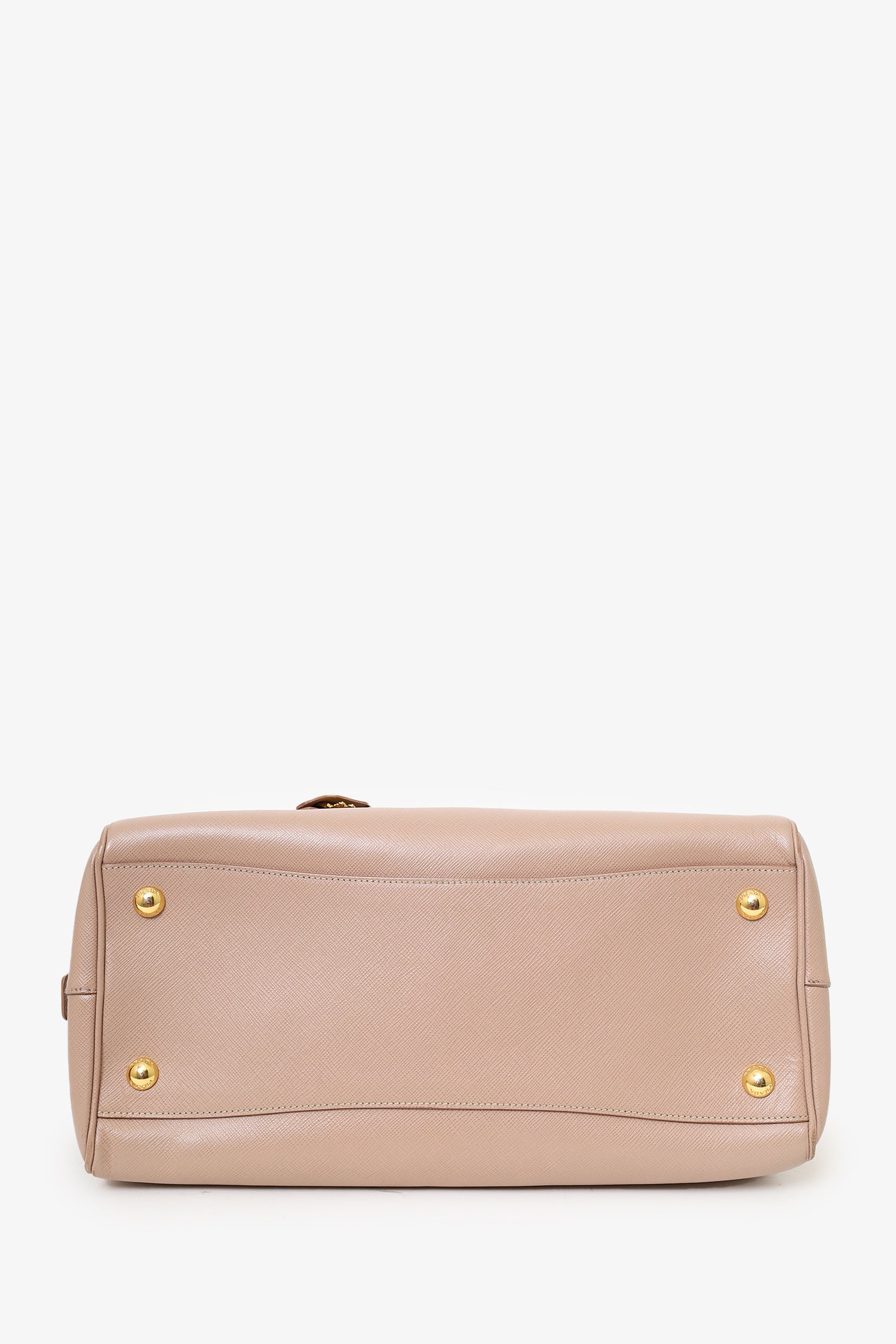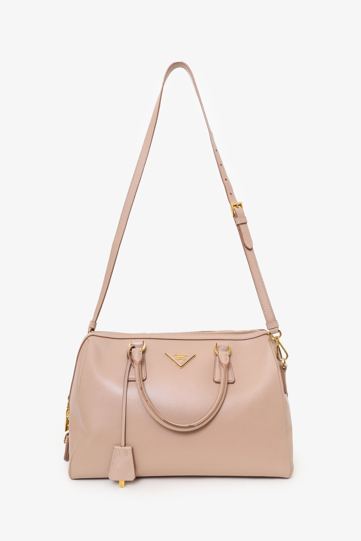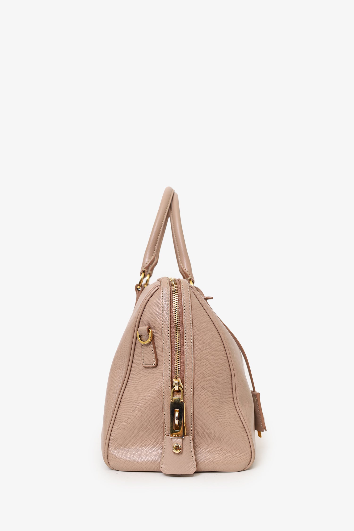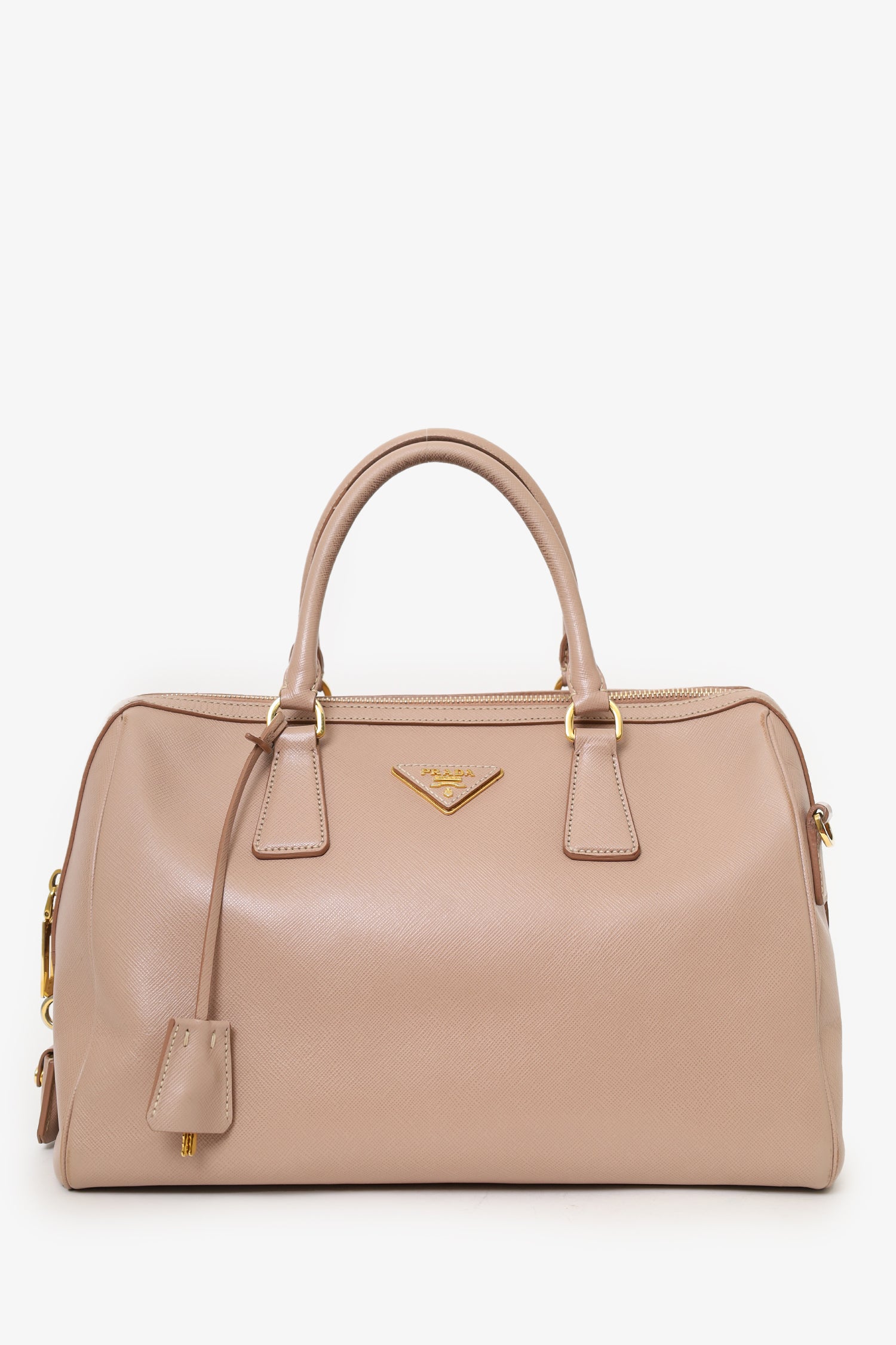 Refresh availabilityPrada Taupe Saffiano Leather Bowler Bag With Strap. Top zip closure. Twin handles. Removable strap with adjustable buckle closure. Protective studs on bottom. Lined interior. 2 interior pockets; 1 zip and 1 slip. Includes clochette. Gold-tone hardware. Tonal stitching.