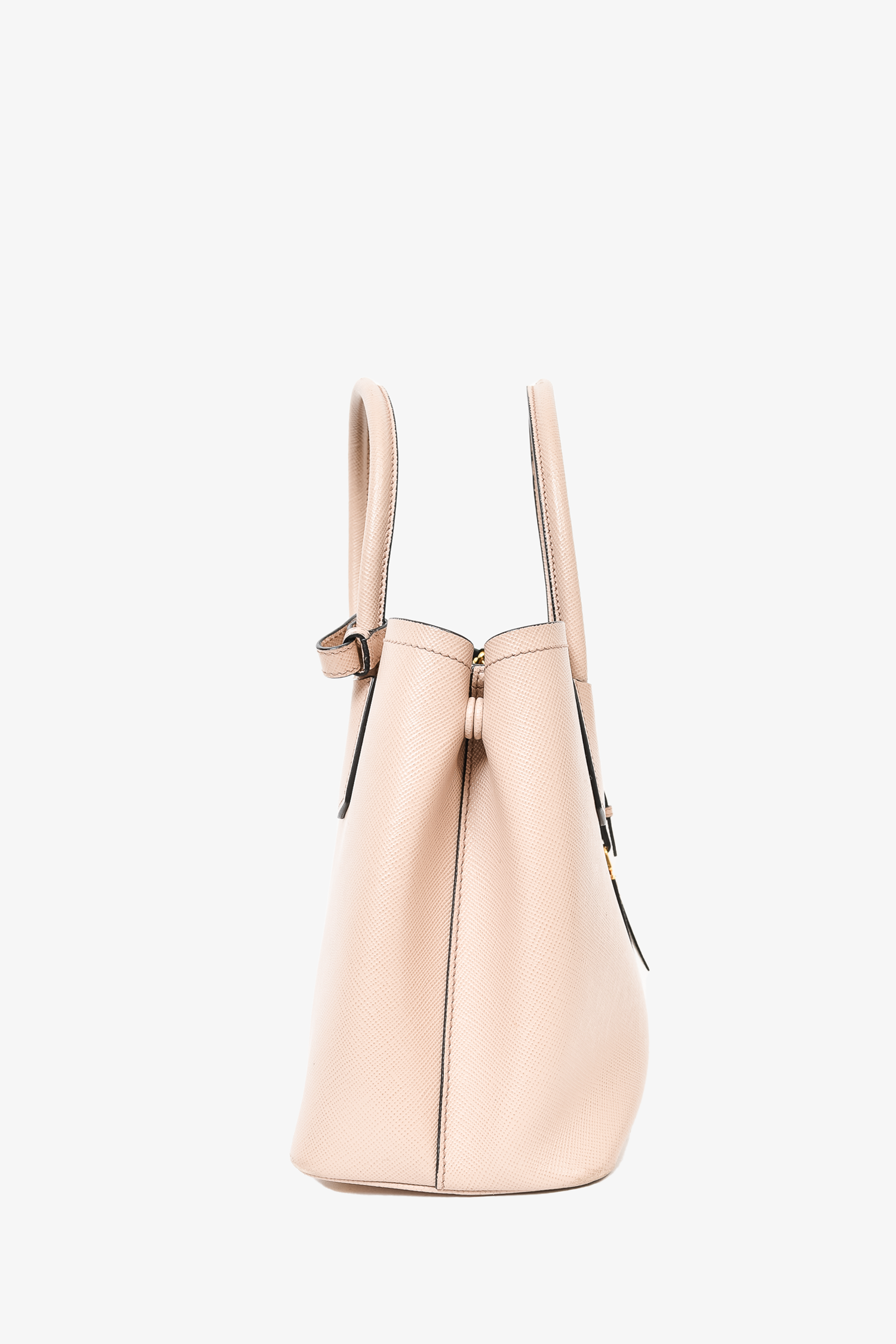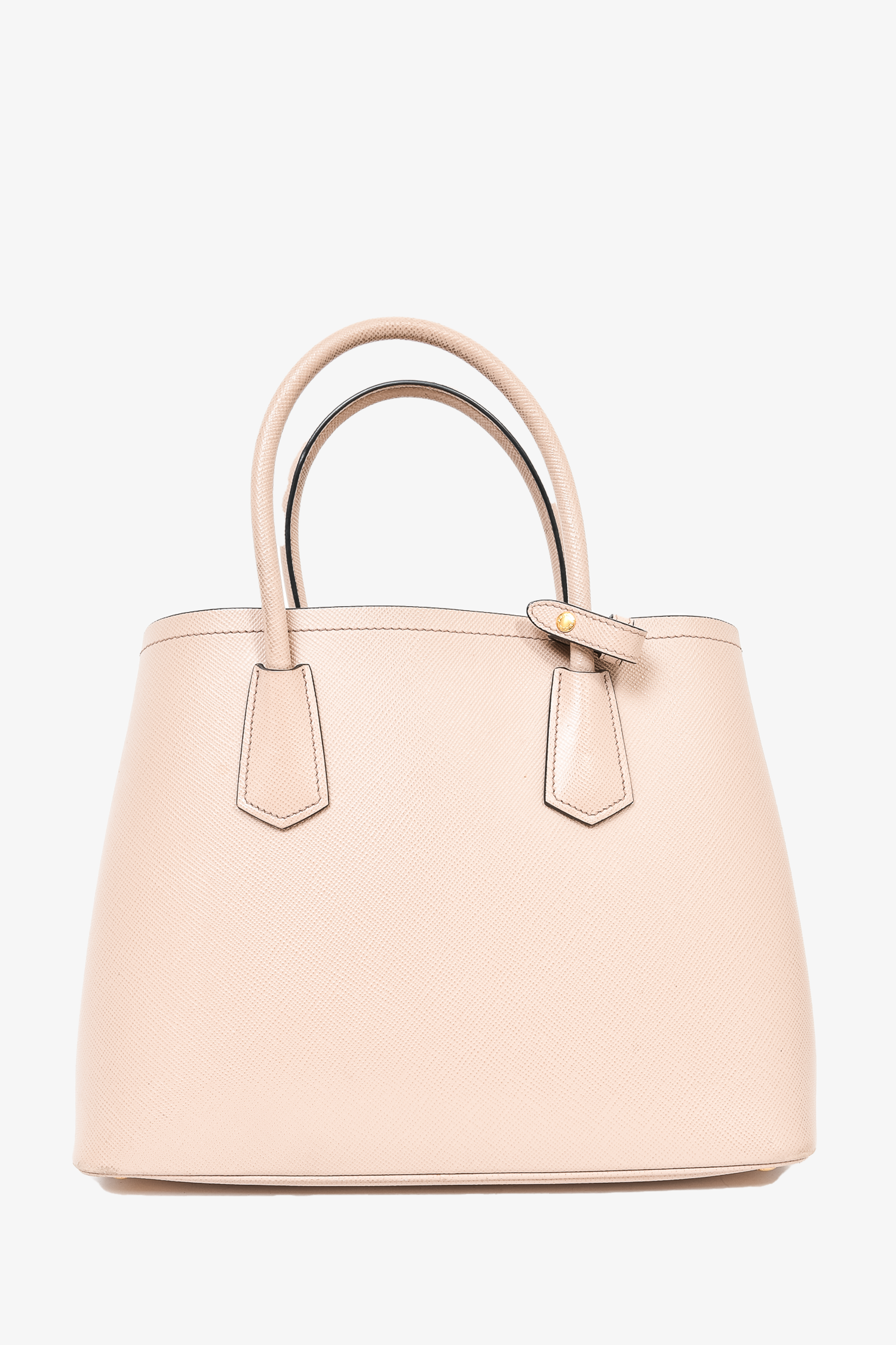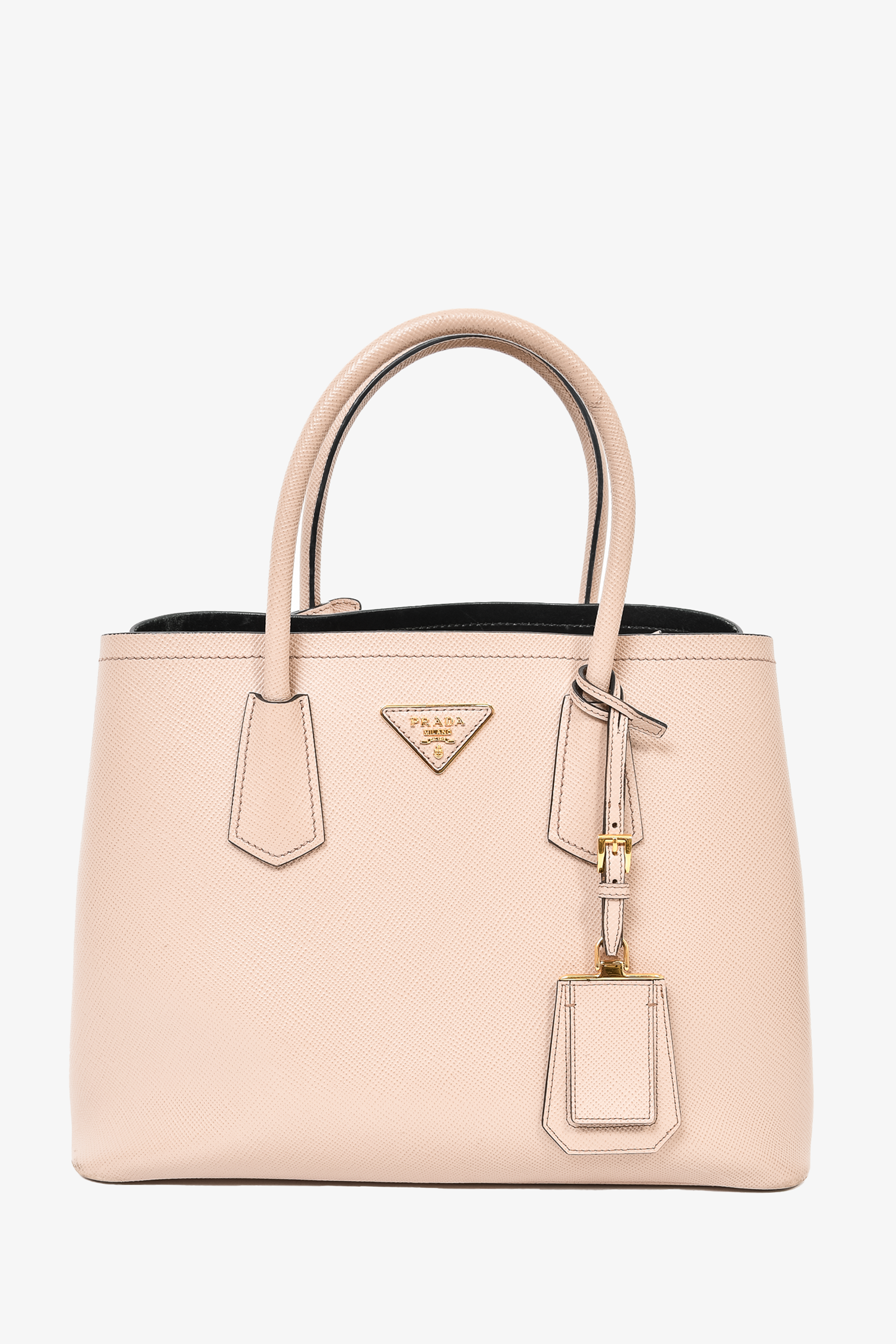 Refresh availabilityPrada Taupe Saffiano Leather Double Tote With Strap. Twin handles. 2 open interior compartments. 1 interior pocket with magnetic closure. Detachable and adjustable crossbody strap. Gold-toned hardware. Tonal stitching.