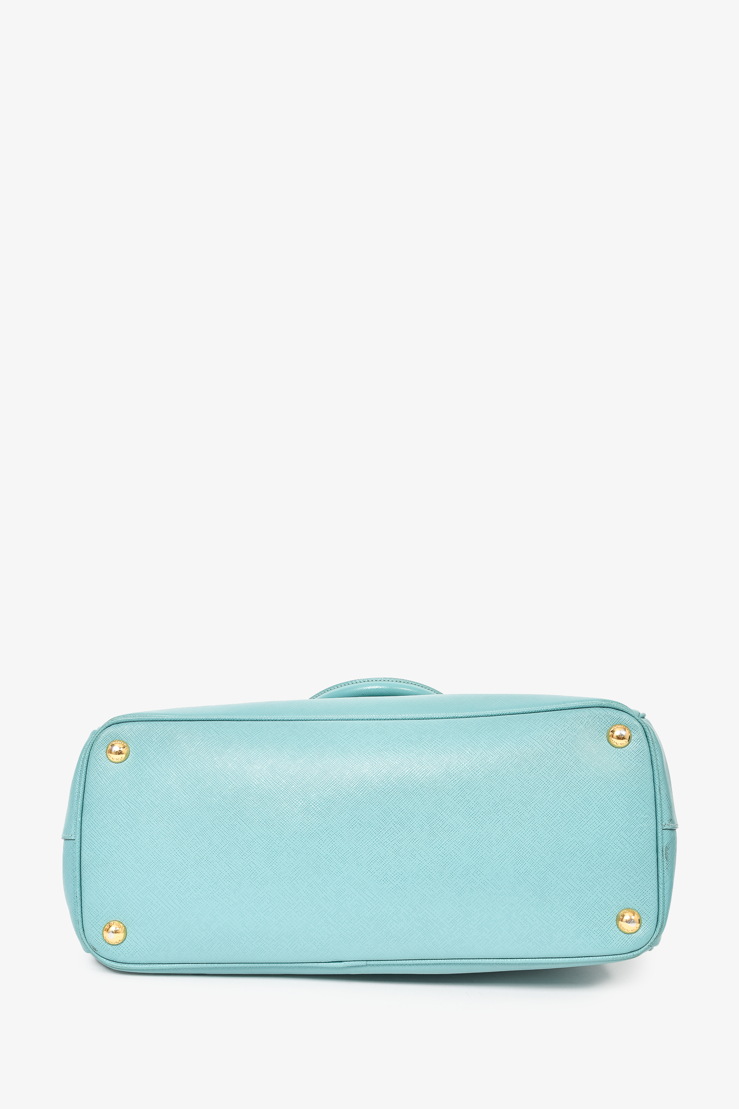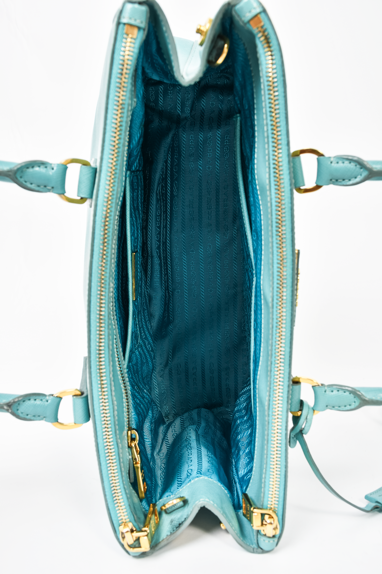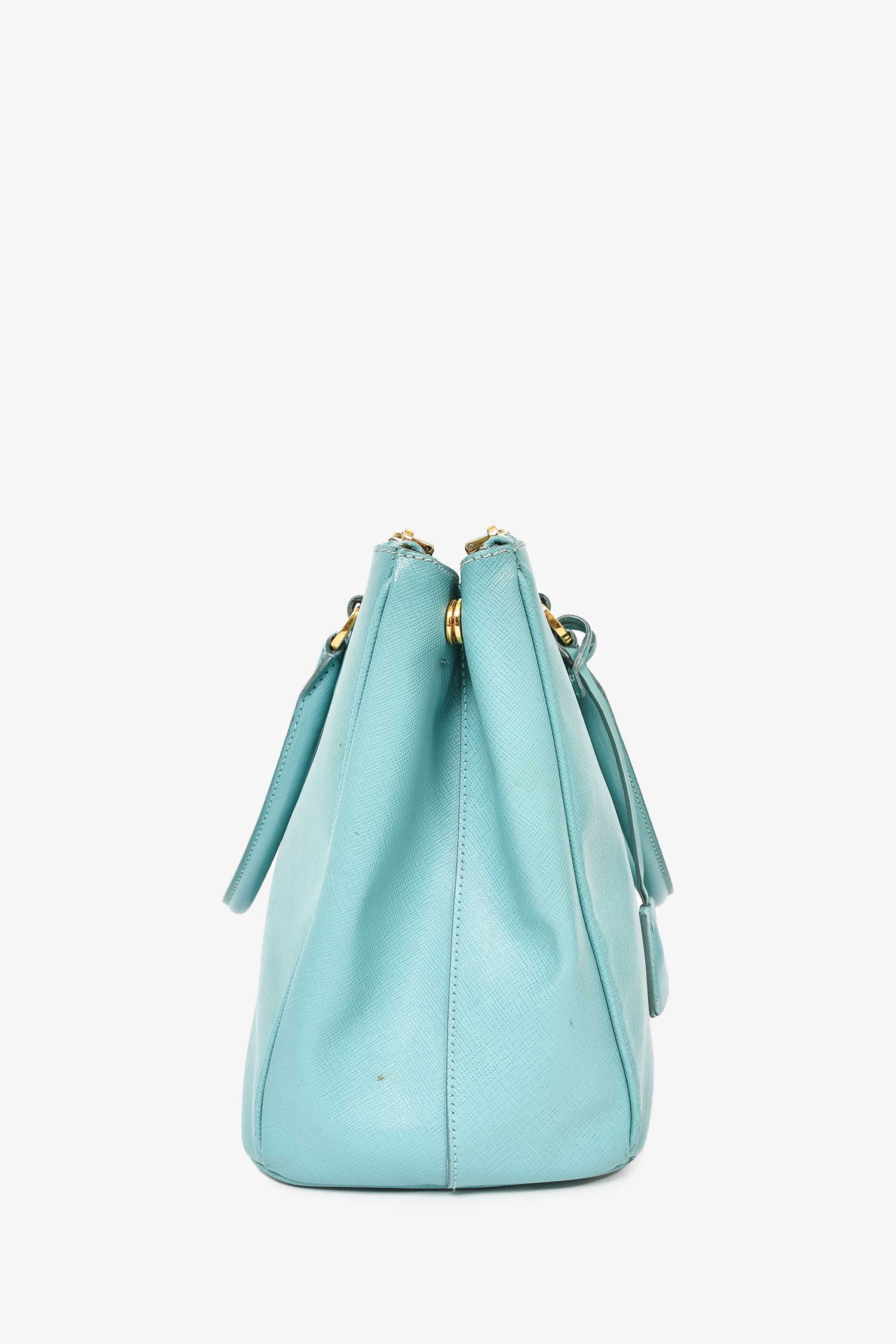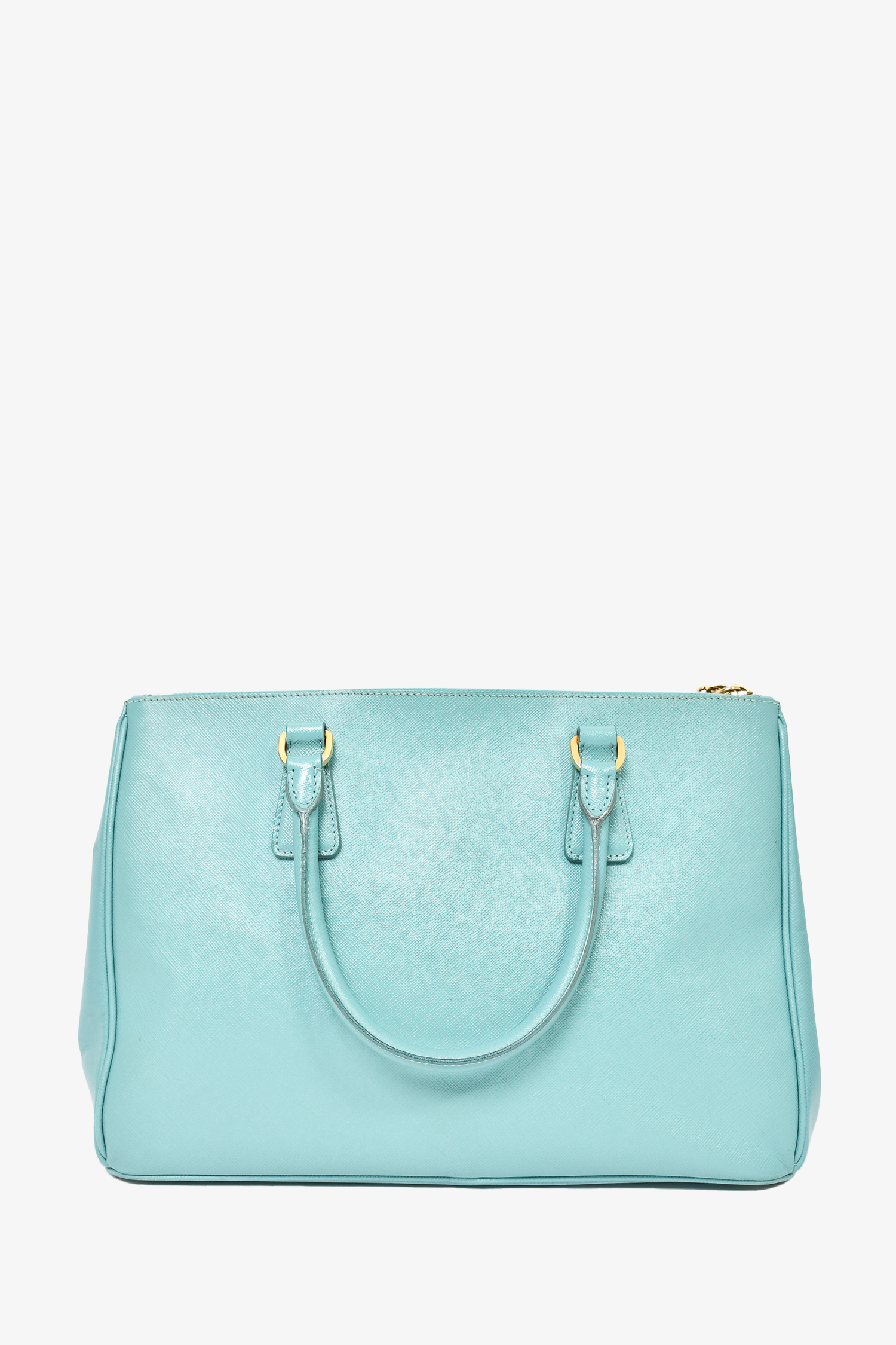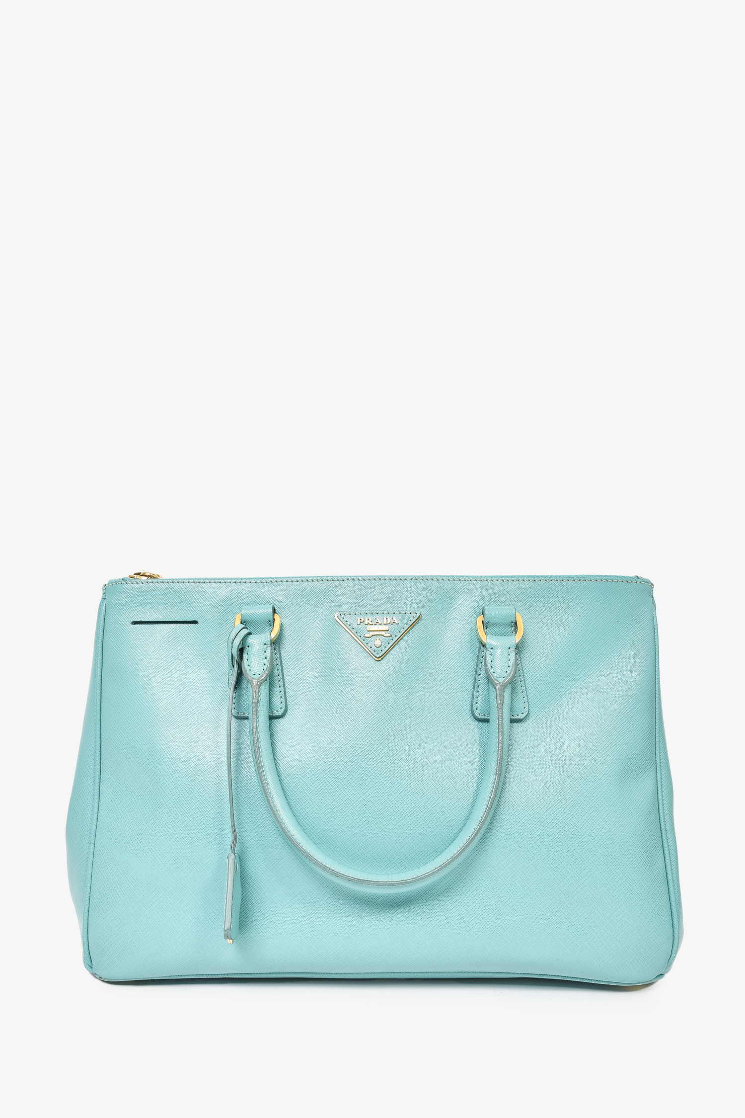 Refresh availabilityPrada Teal Saffiano Leather Double Zip Large Galleria Tote With Strap. Top zip closures. Twin handles. 4 interior wall pockets; 3 slip, 1 with zip closure. Gold-tone hardware. Tonal stitching.