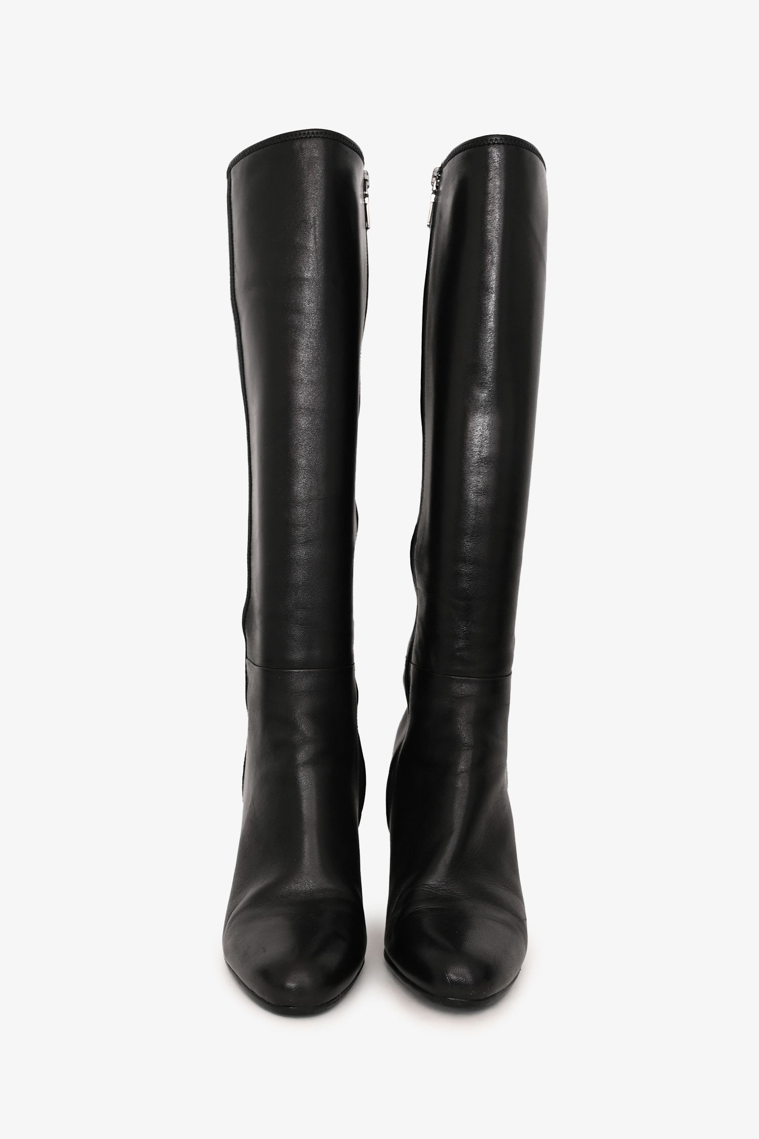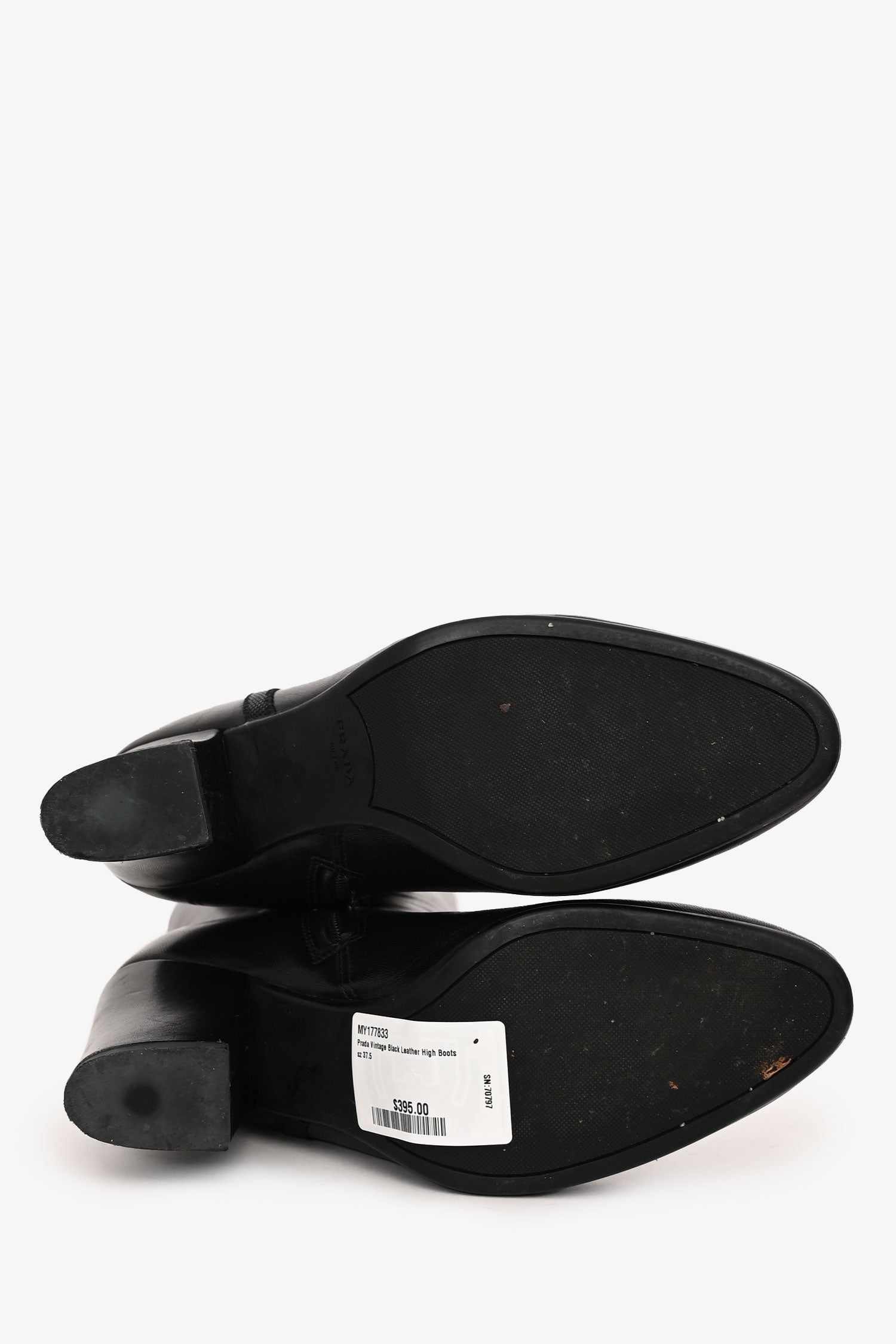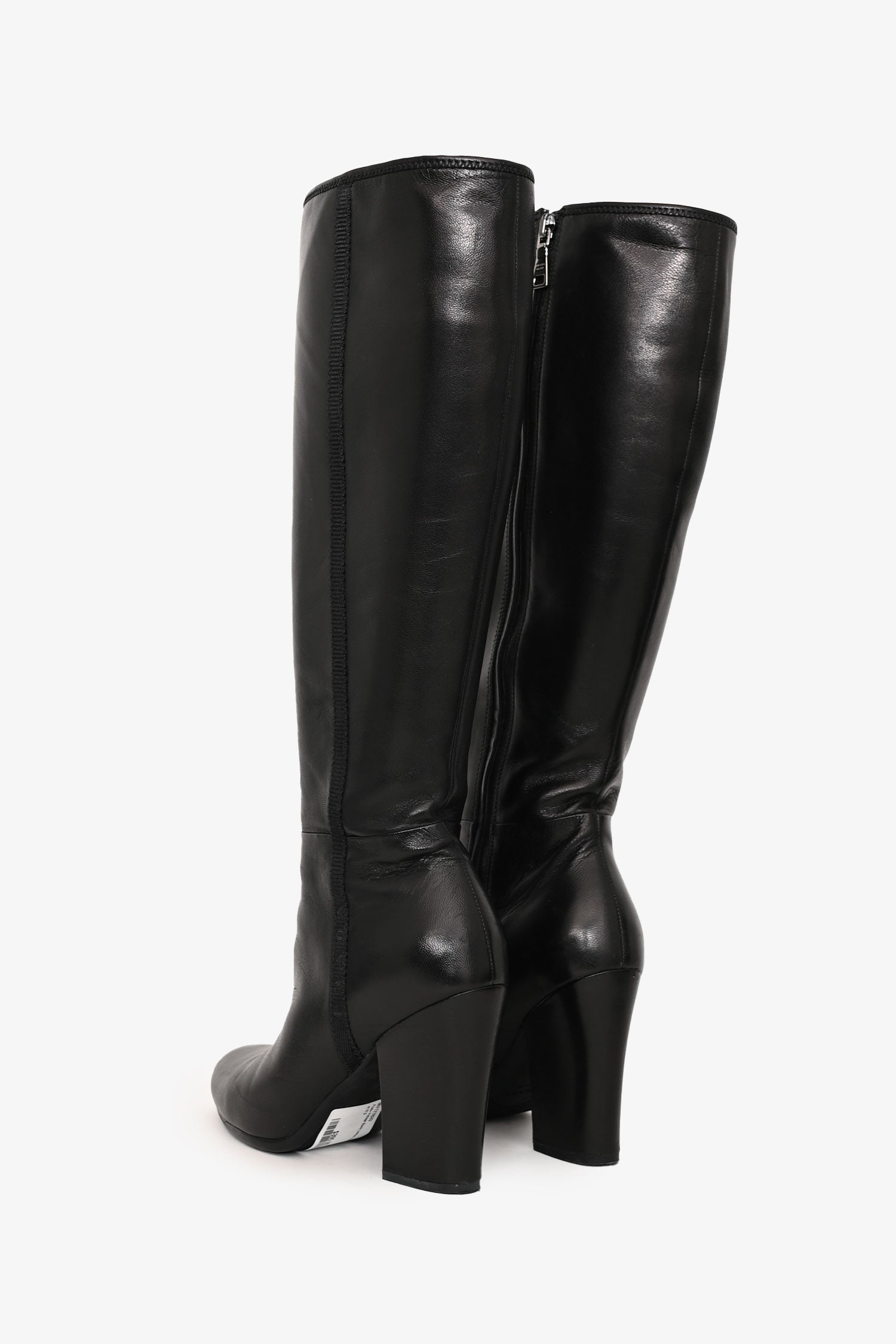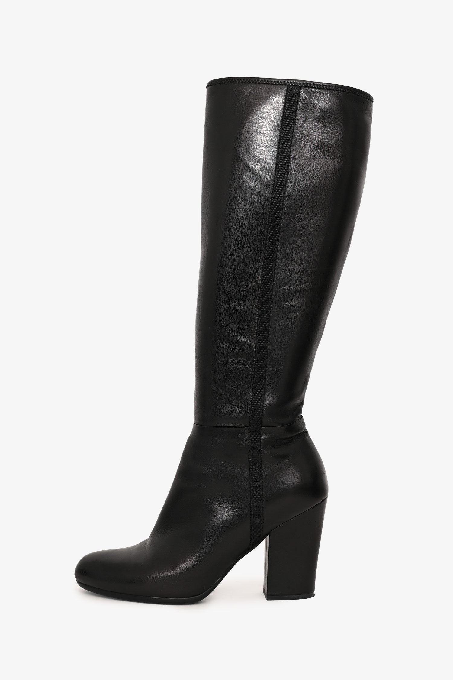 Refresh availabilityPrada Vintage Black Leather High Boots. Pull-on. Side zip closure. Round toe. Silver hardware. Tonal stitching.