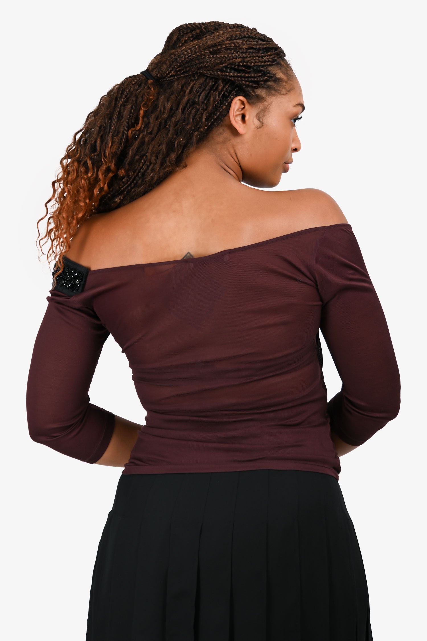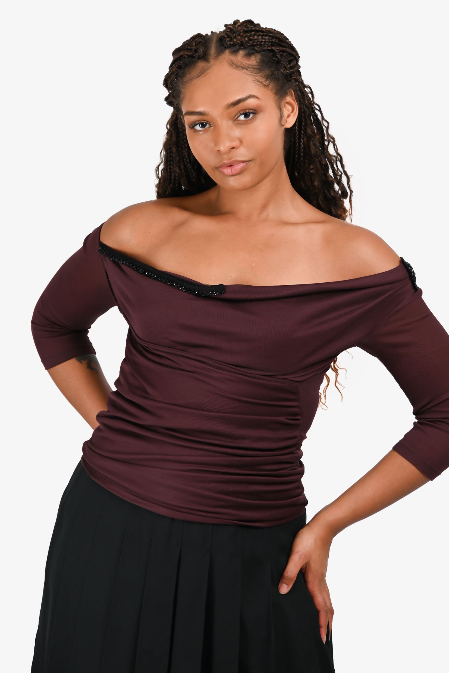 Refresh availabilityPrada Vintage Burgundy Silk Bead Embellished One-Shoulder Top. Slip-on. One-shoulder or off-the-shoulder neckline. Unlined. Tonal stitching.