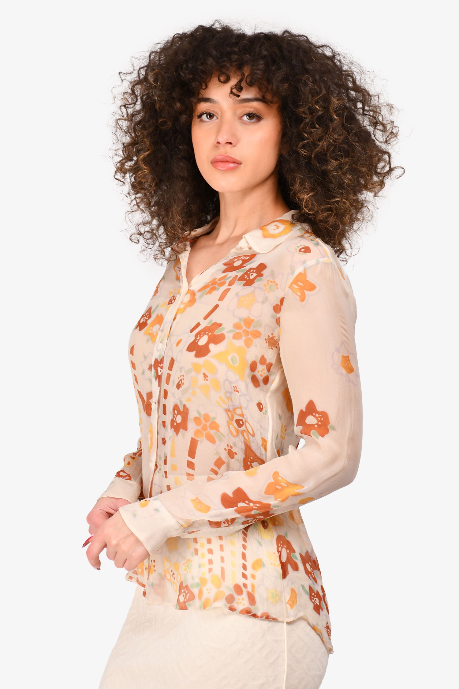 Refresh availabilityPrada Vintage Cream/Burnt Orange Floral Sheer Silk Button Down. Front button-up closure. Button closure on the cuffs. Unlined. Tonal stitching.