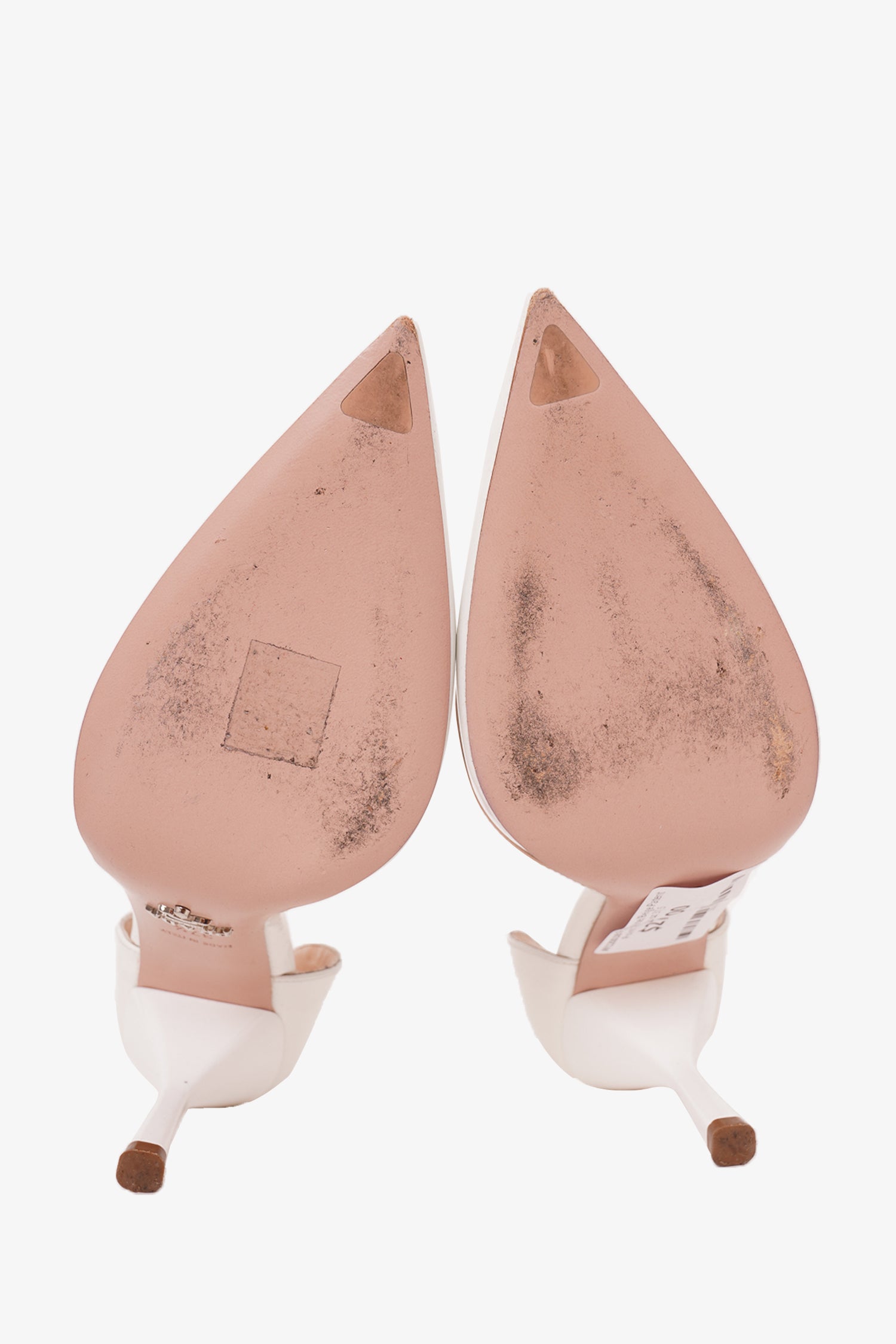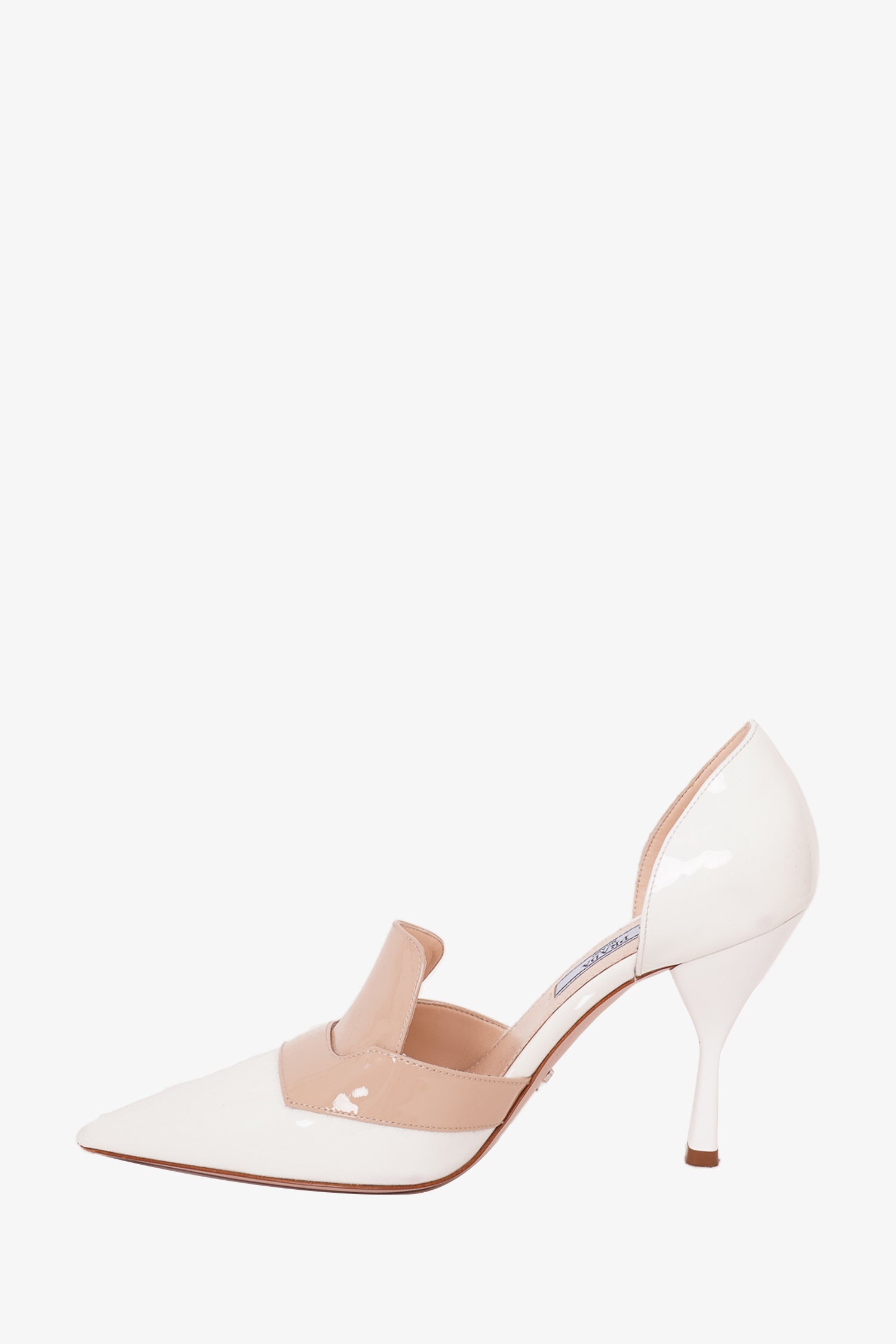 Refresh availabilityPrada White/Beige Patent Point Toe Heels. D'orsay style. Tonal stitching.