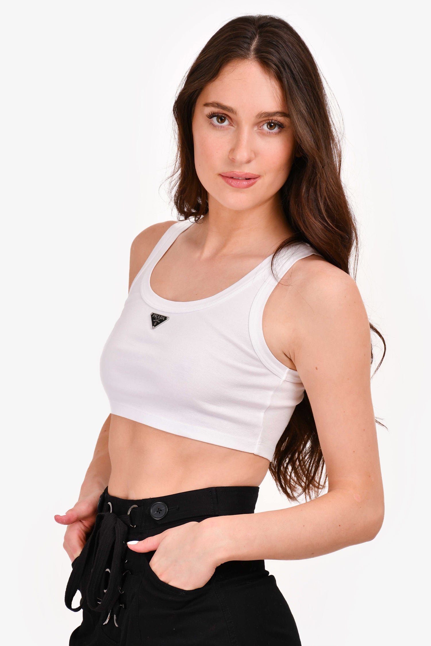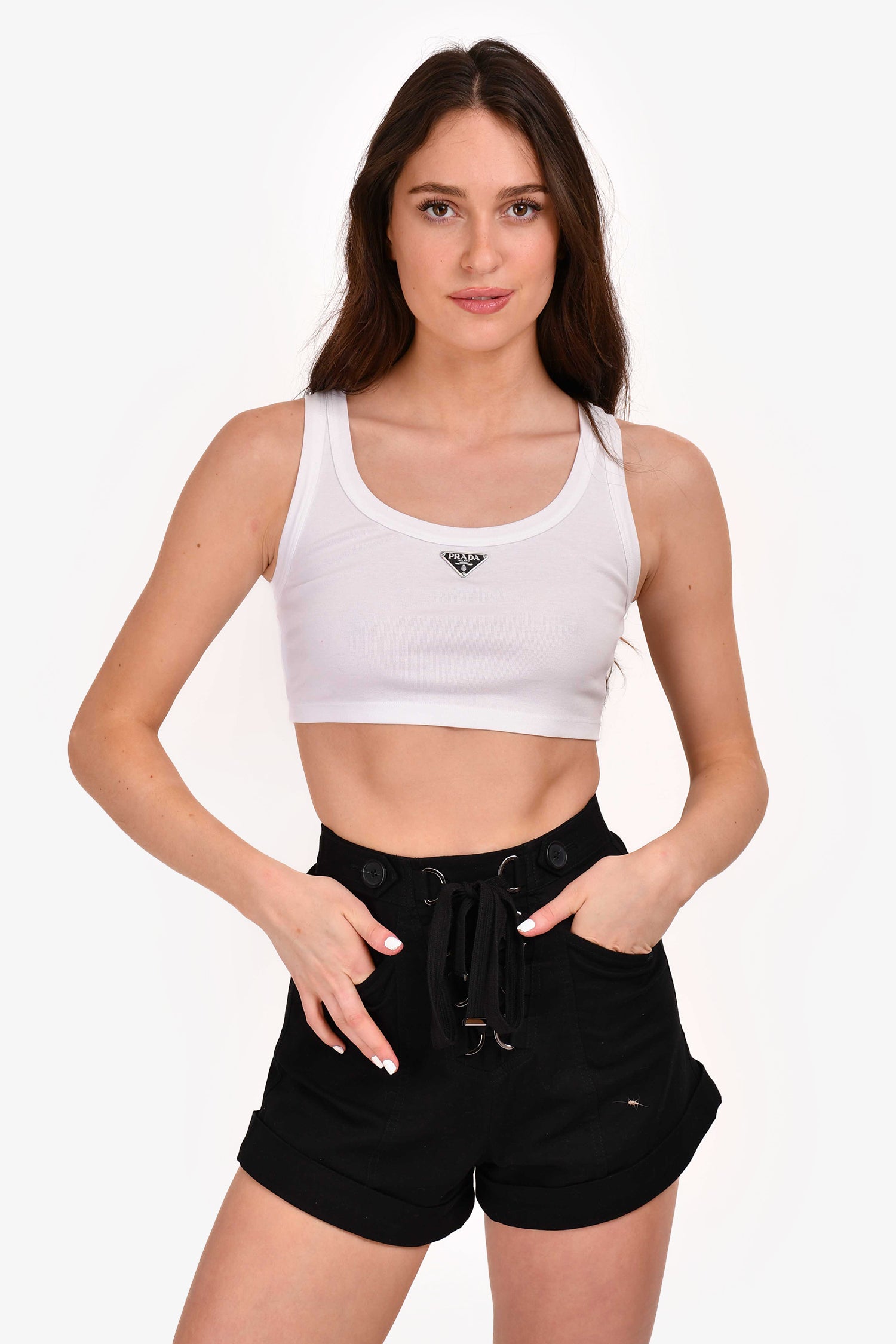 Refresh availabilityPrada White Cotton Cropped Racerback Logo Tank Top. Sleeveless. Scoop neckline. Logo detail at chest. Pull-on. Tonal stitching.