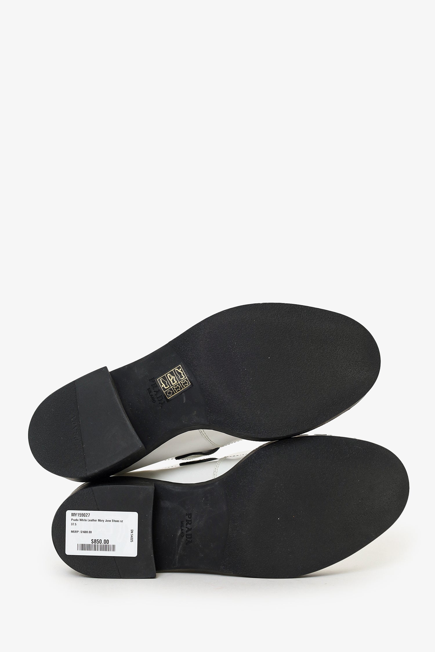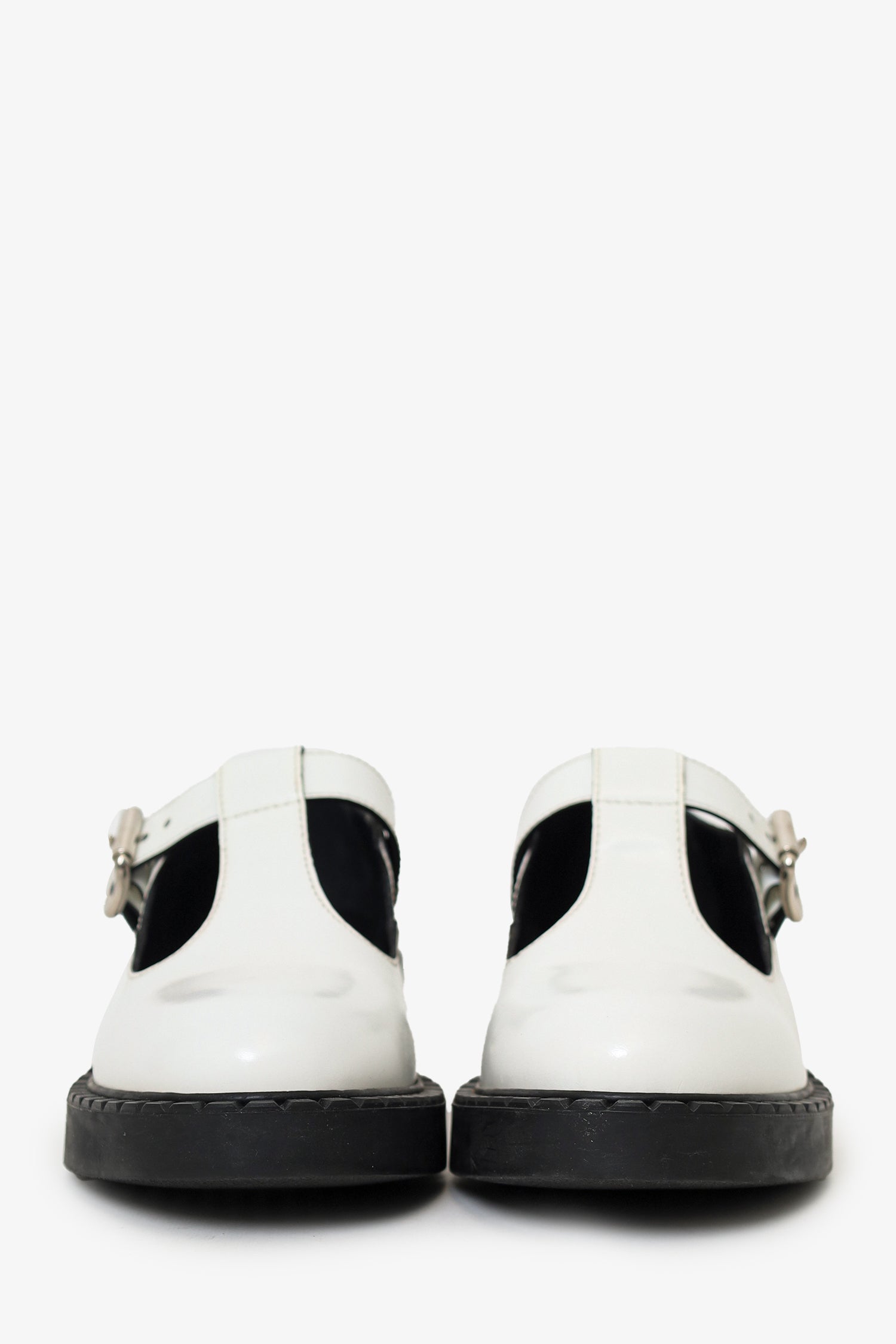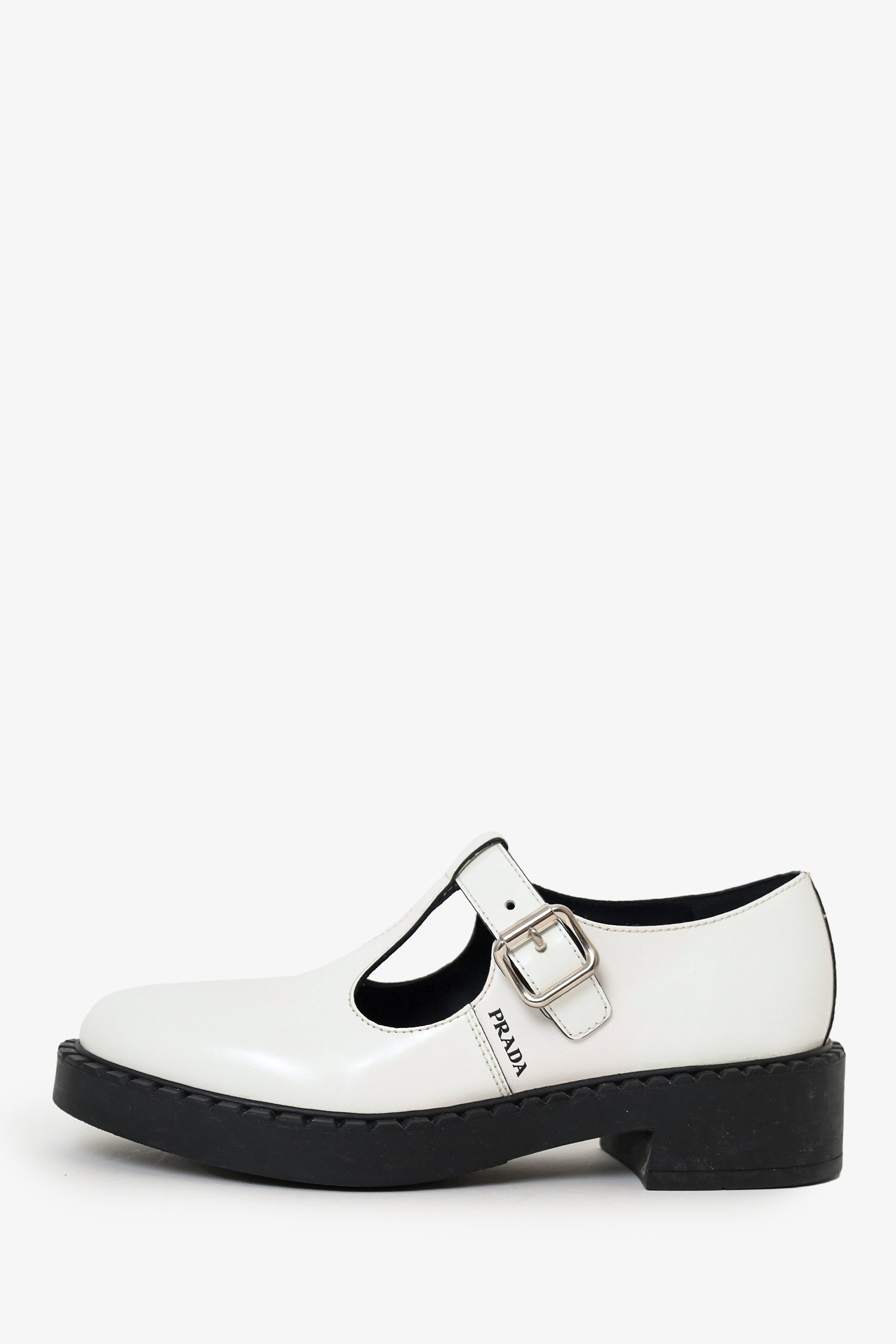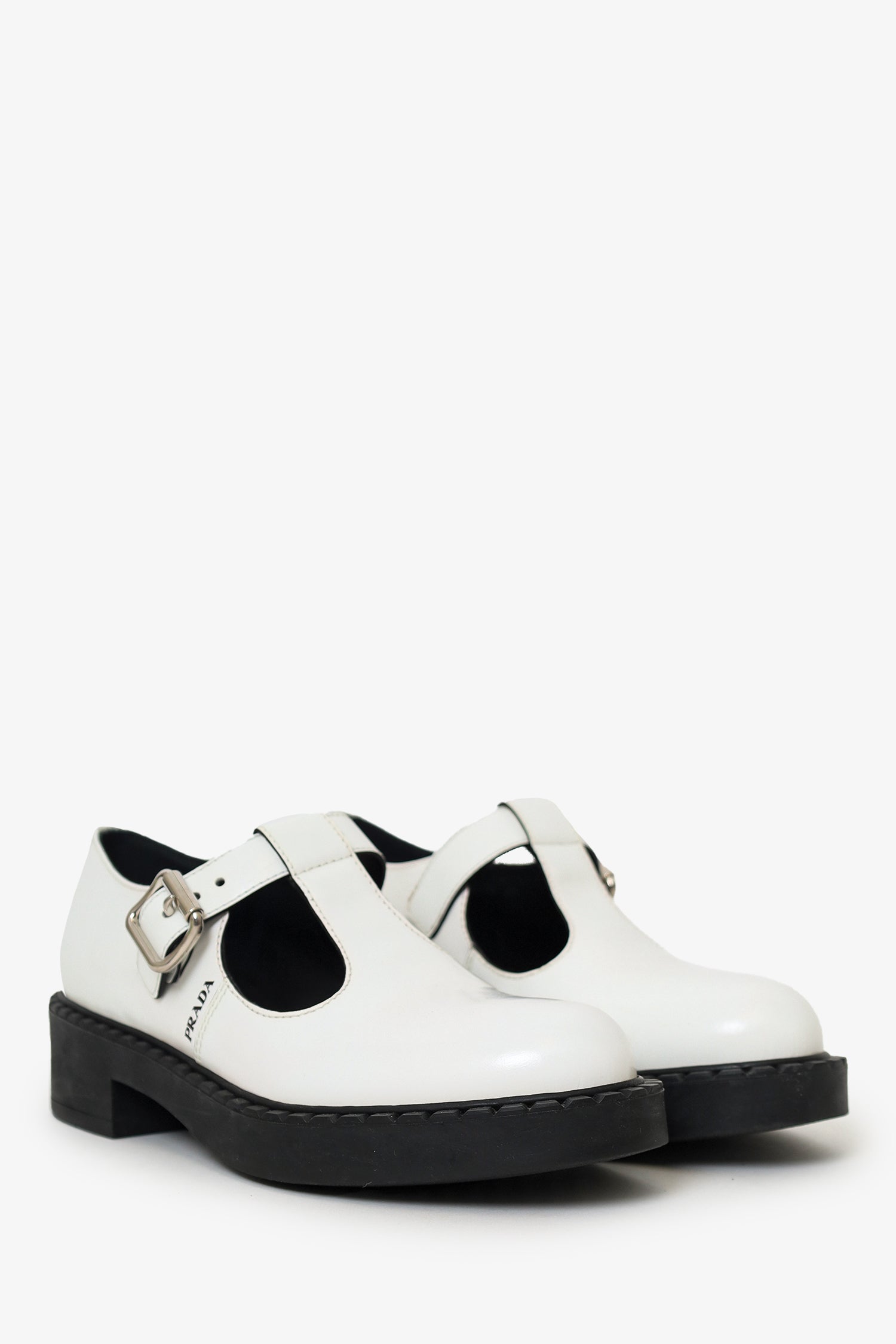 Refresh availabilityPrada White Leather Mary Jane Shoes. Slip-on. Top strap with adjustable buckle closure. Silver-tone hardware. Tonal stitching.