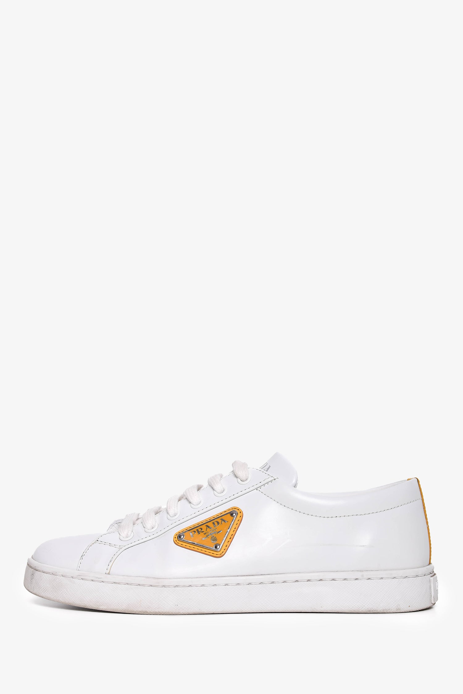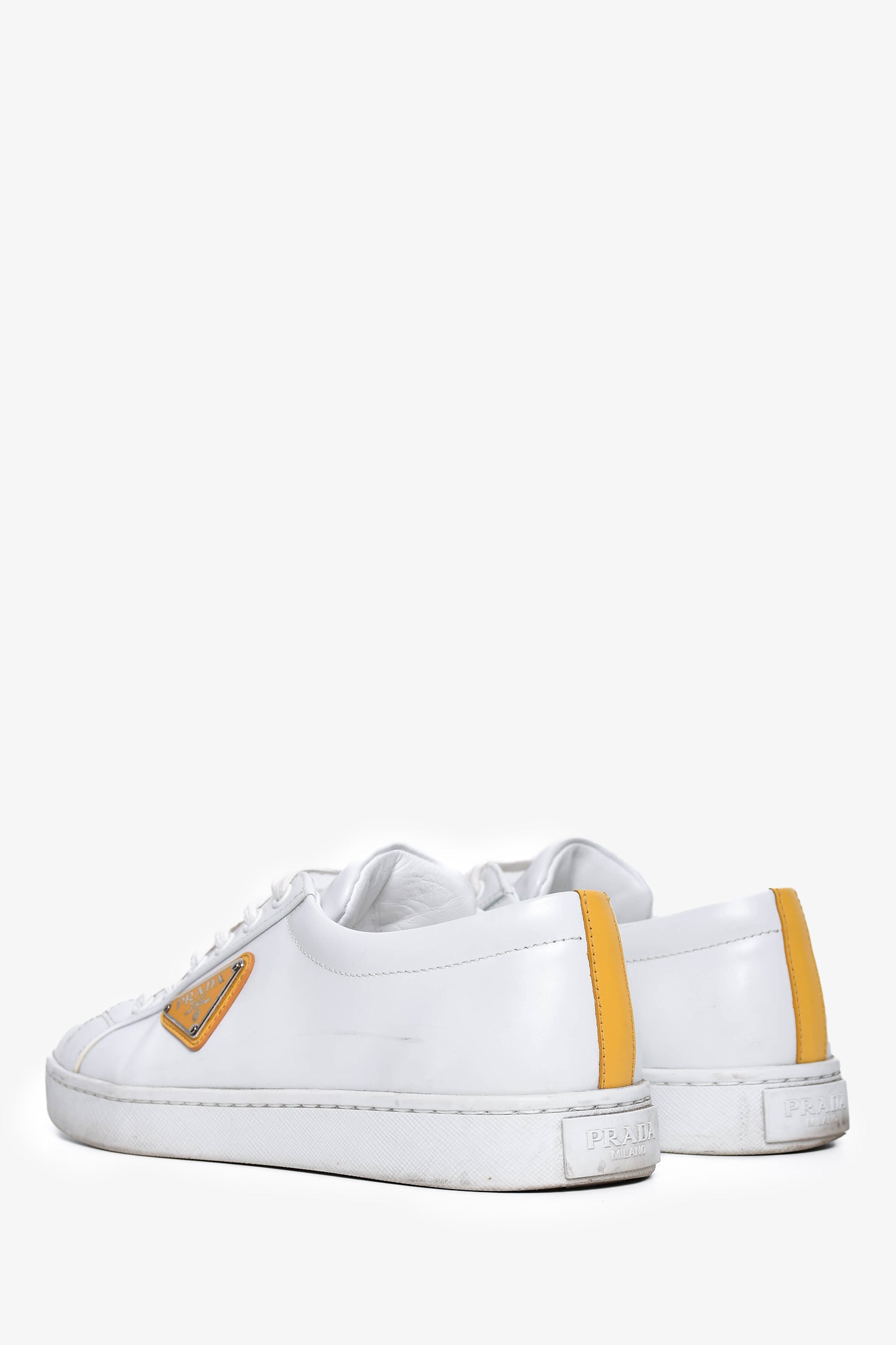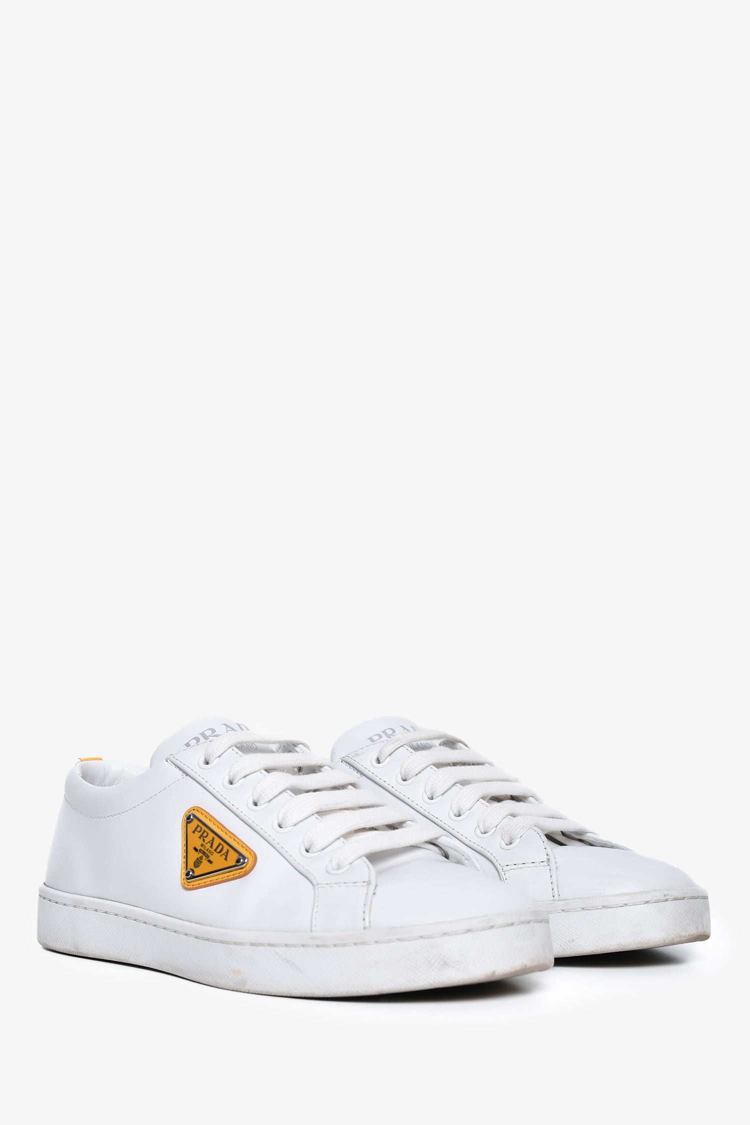 Refresh availabilityPrada White Leather Yellow Triangle Logo Sneakers. Top lace up closure. Round toe. Tonal Stitching.