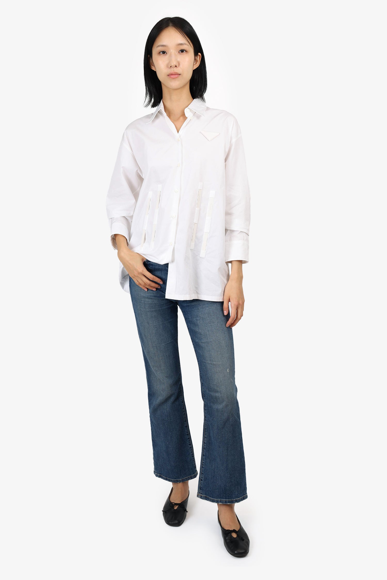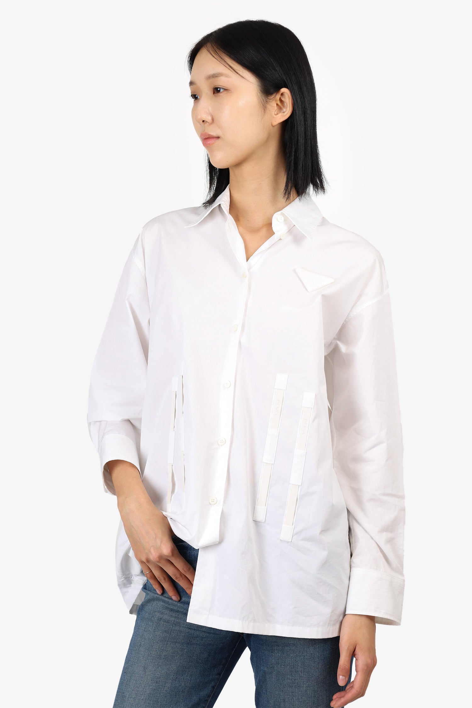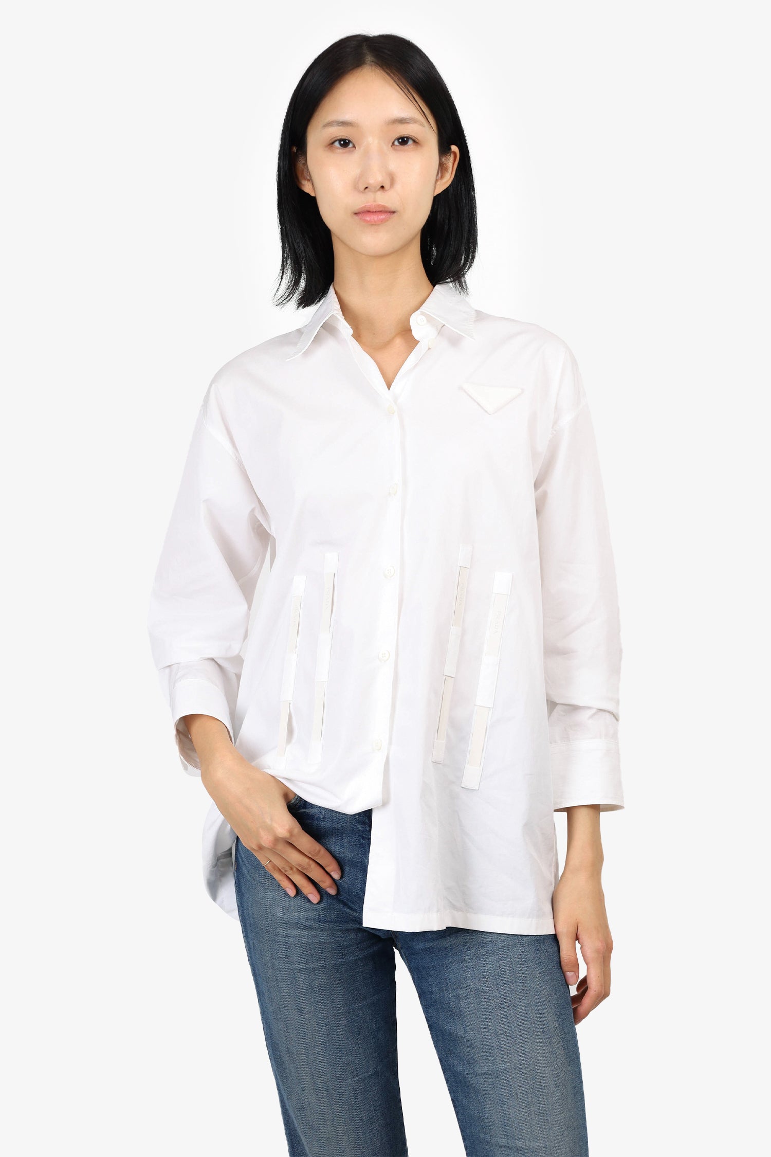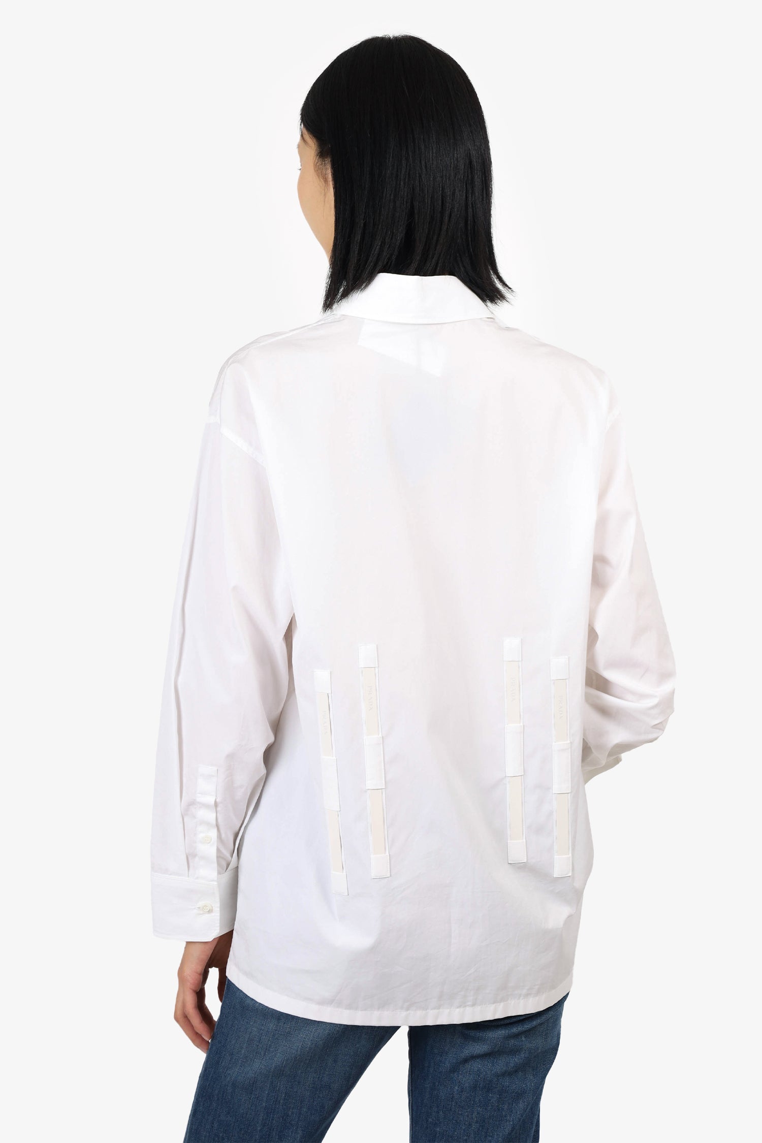 Refresh availabilityPrada White Logo Tape Detailed Shirt. Collared neckline. Button-up closure on front and sleeve cuffs. Exposed boning on front and back. Unlined. Tonal stitching.