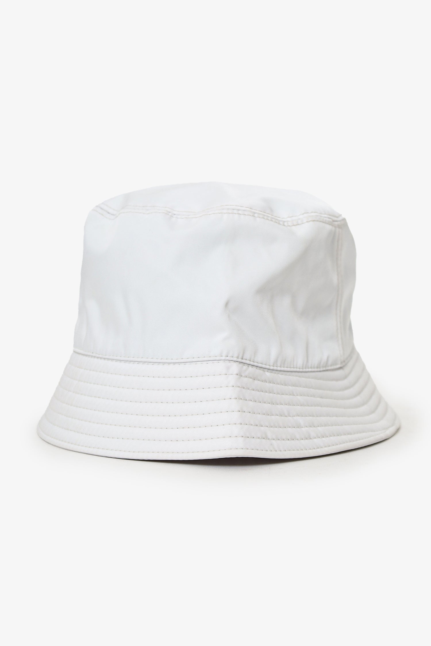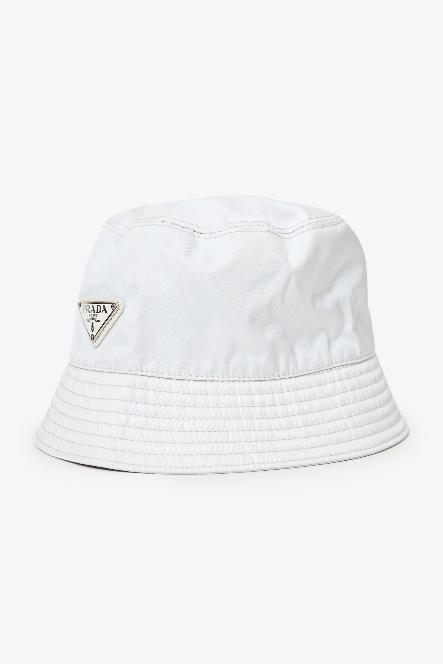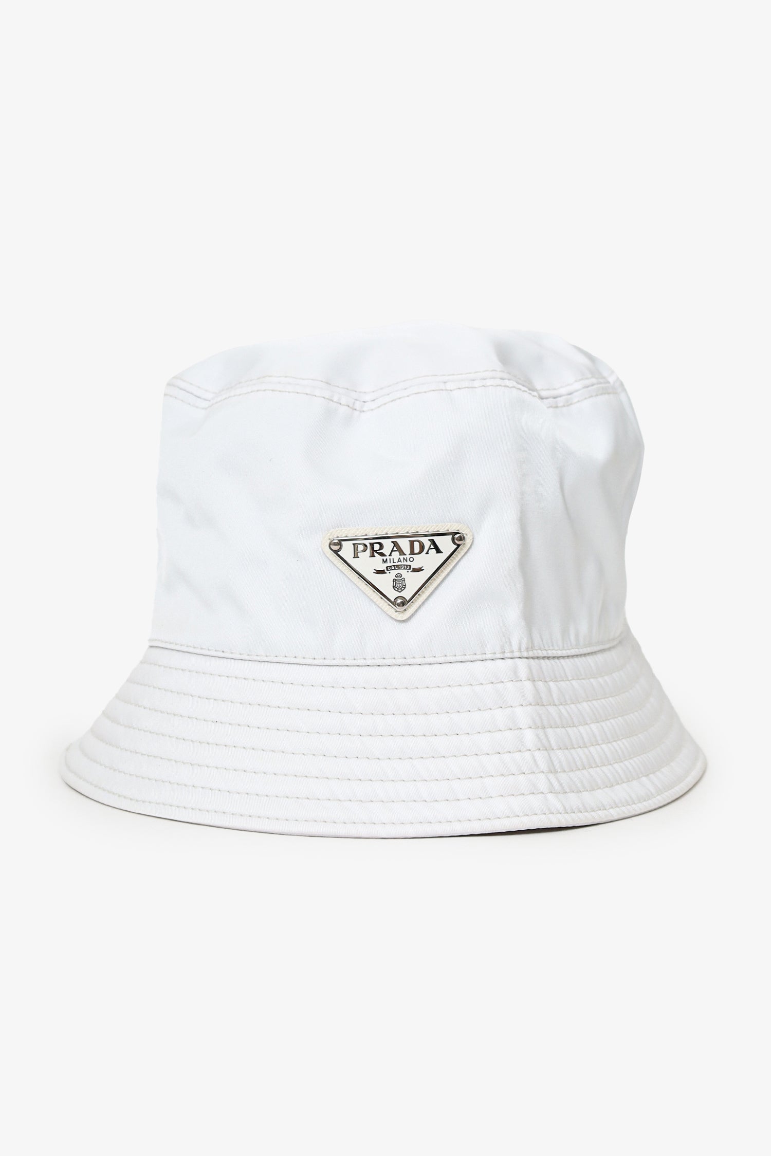 Refresh availabilityPrada White Nylon Bucket Hat. Logo embellishment at front. Lined interior. Silver-tone hardware. Tonal stitching.
