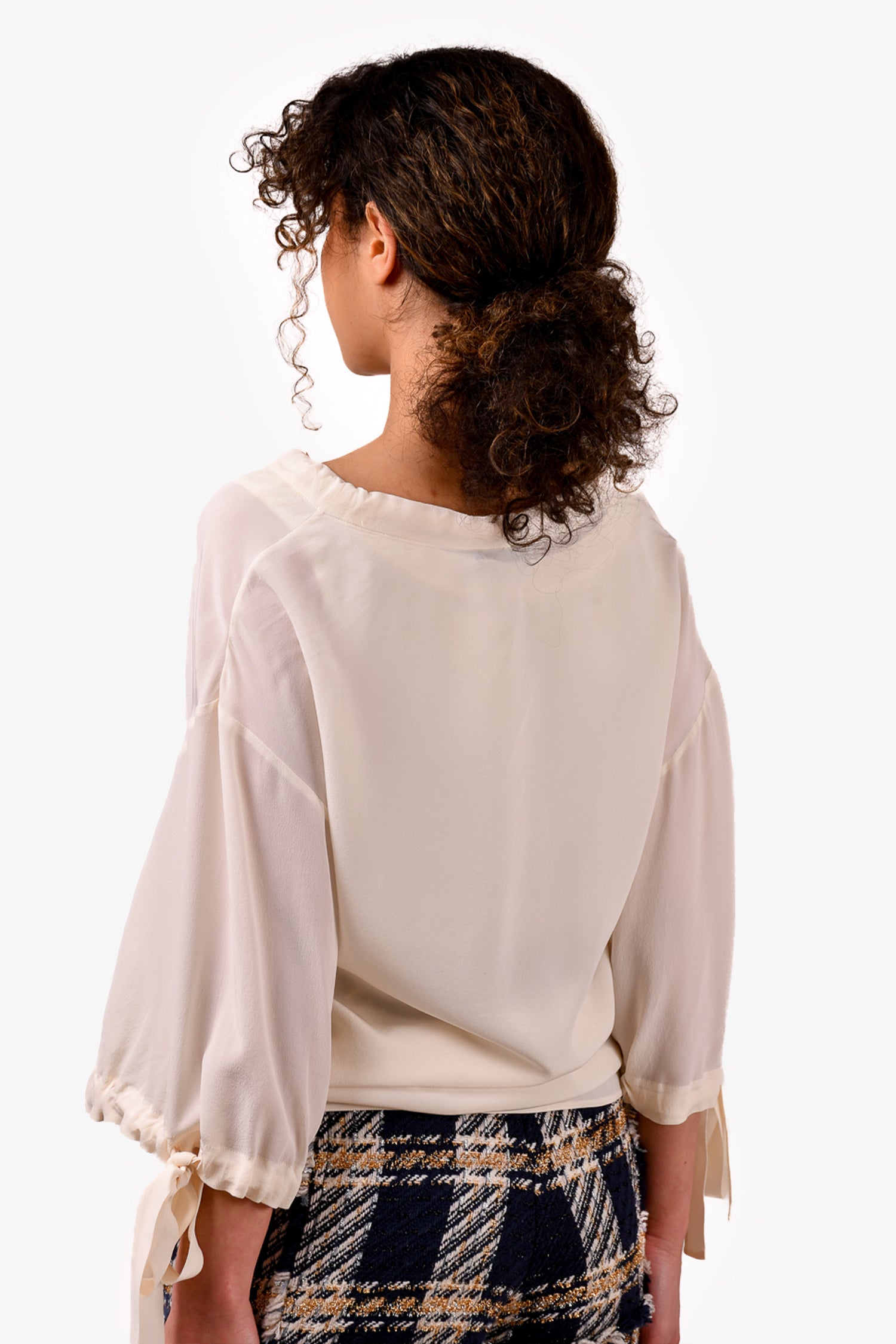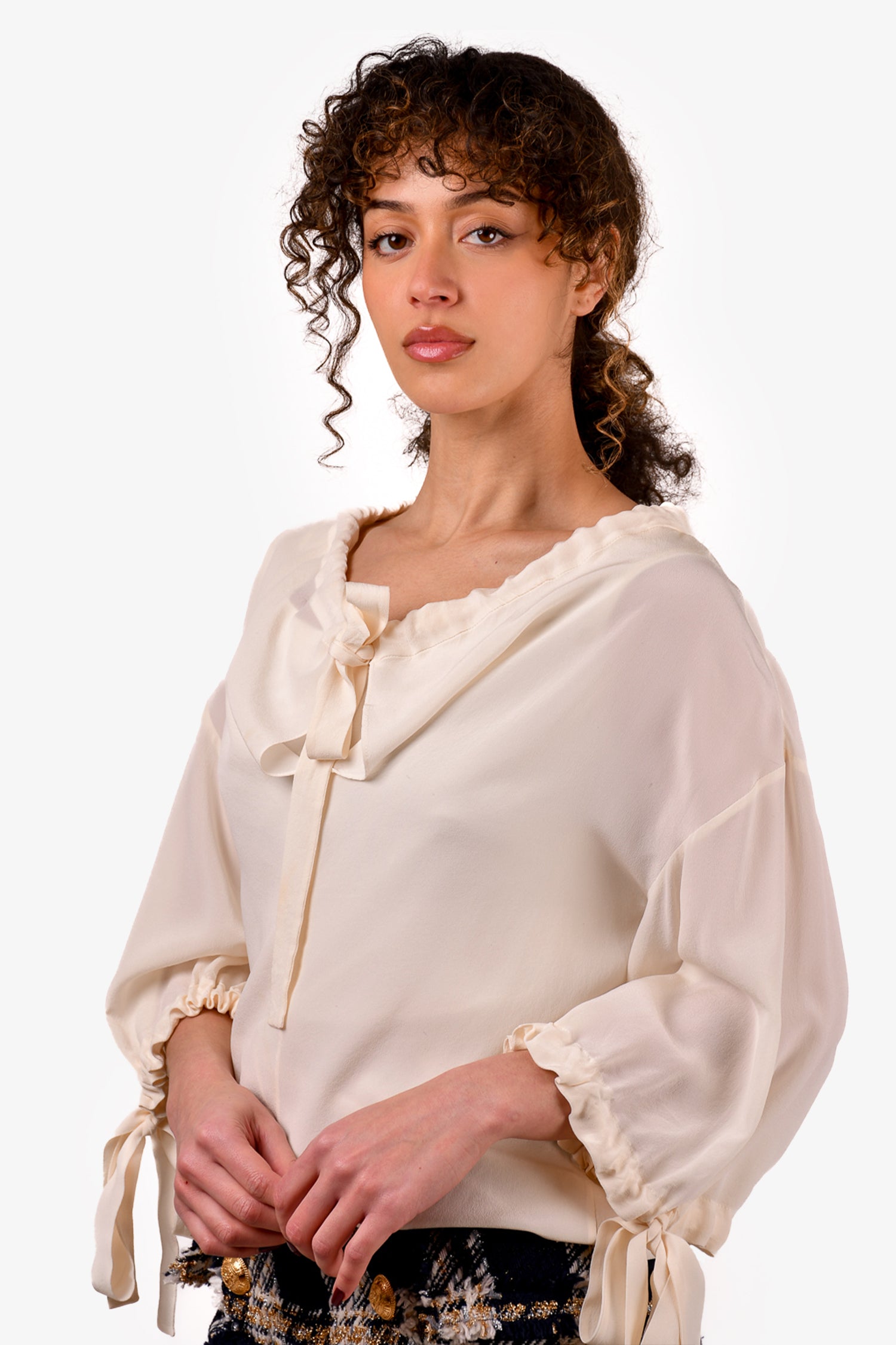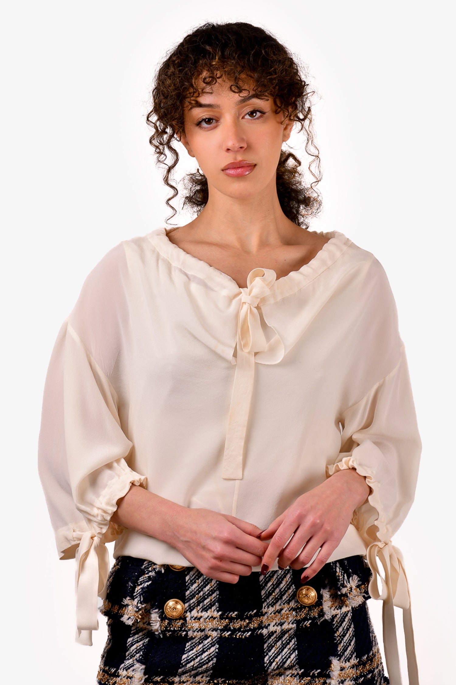 Refresh availabilityPrada White Silk Bow Front Blouse. Front tie-up closure. Tie-up closures on the cuffs. Tonal stitching.
