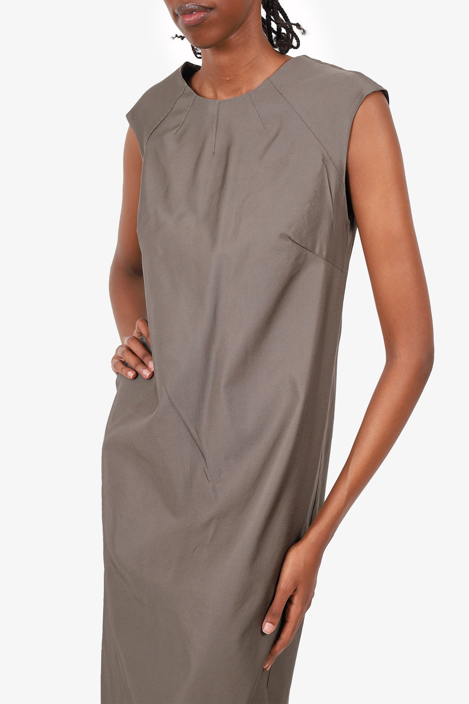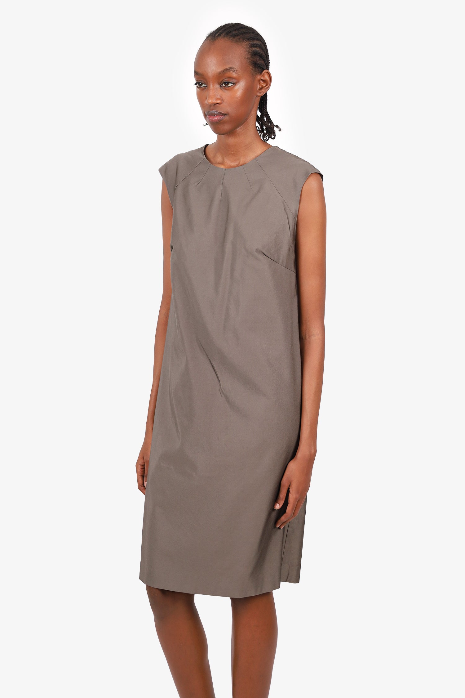 Refresh availabilityPrada Wool/Silk Grey Sleeveless Dress. Slip-on. Round-neckline. Rear zip with hook closure. Rear vent. Pleat design on rear exterior. Attached interior lining. Tonal stitching.