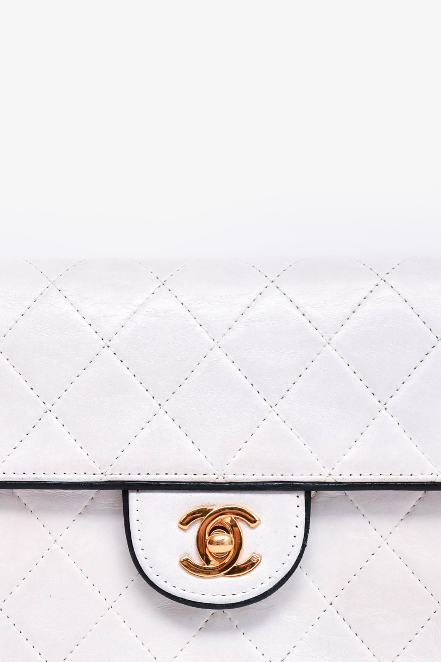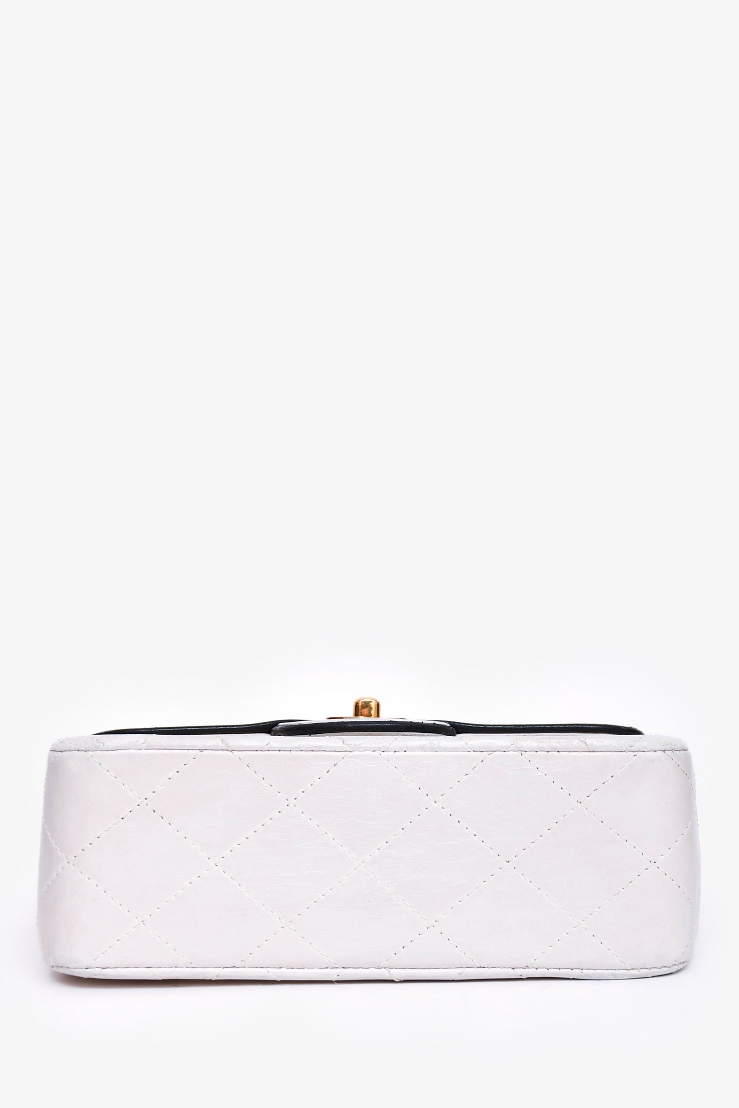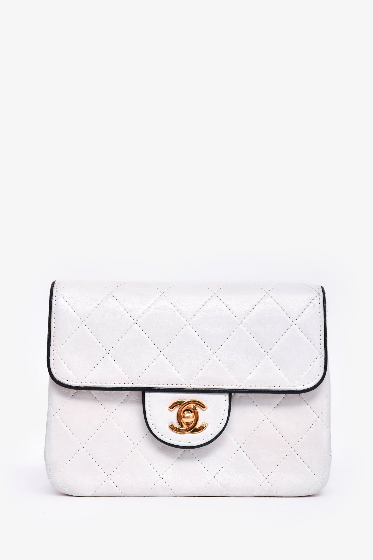 Refresh availabilityPre-Loved Chanel™ 1989-91 White/Black Lambskin Leather Mini Square Flap Bag. Front fold-over flap with turn-lock closure. Single exterior slip pocket. Single interior slip pocket. Single interior zip pocket. Gold-toned hardware. Tonal stitching.