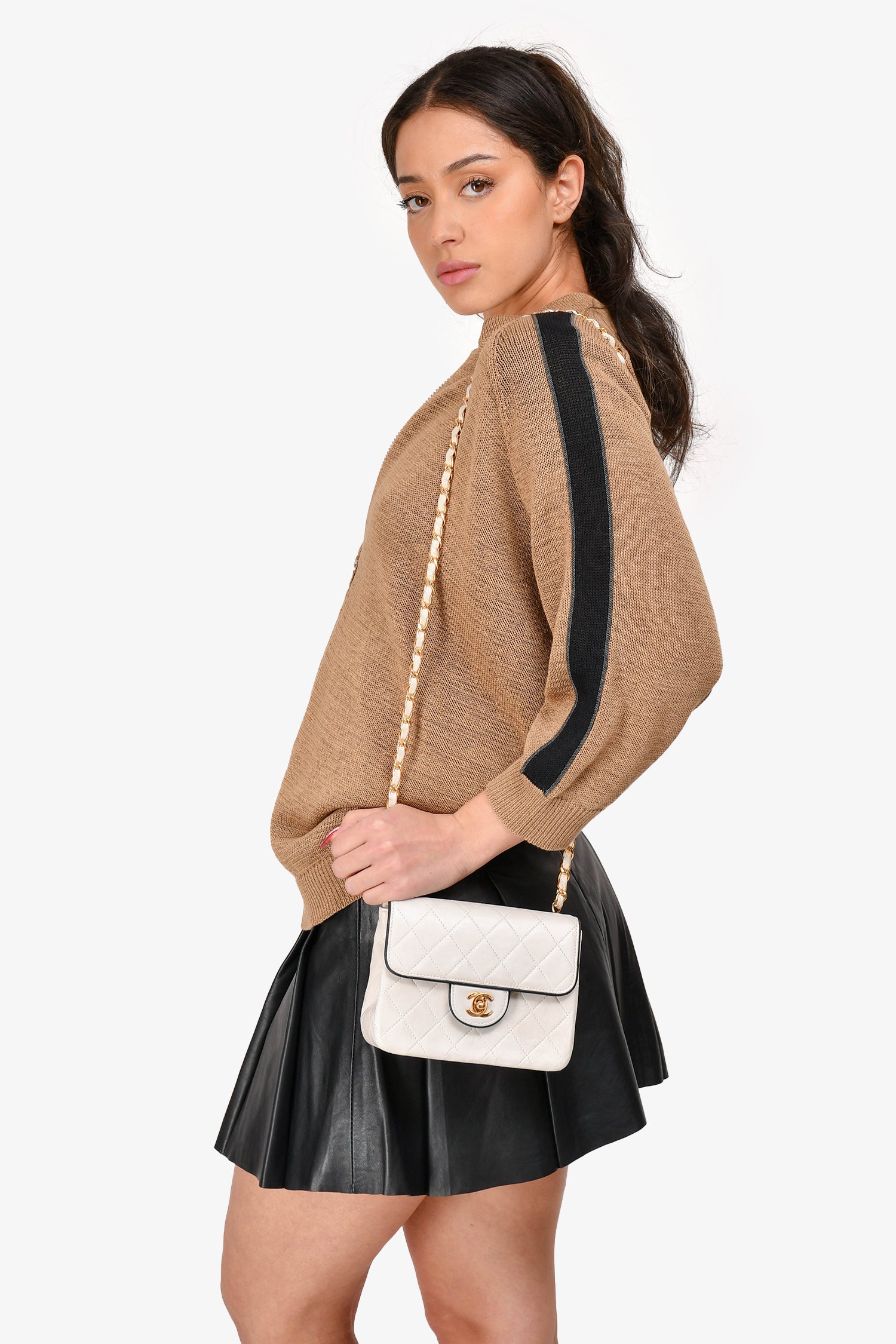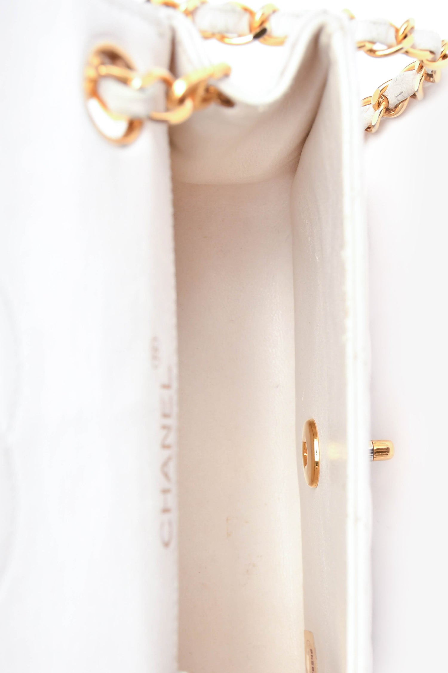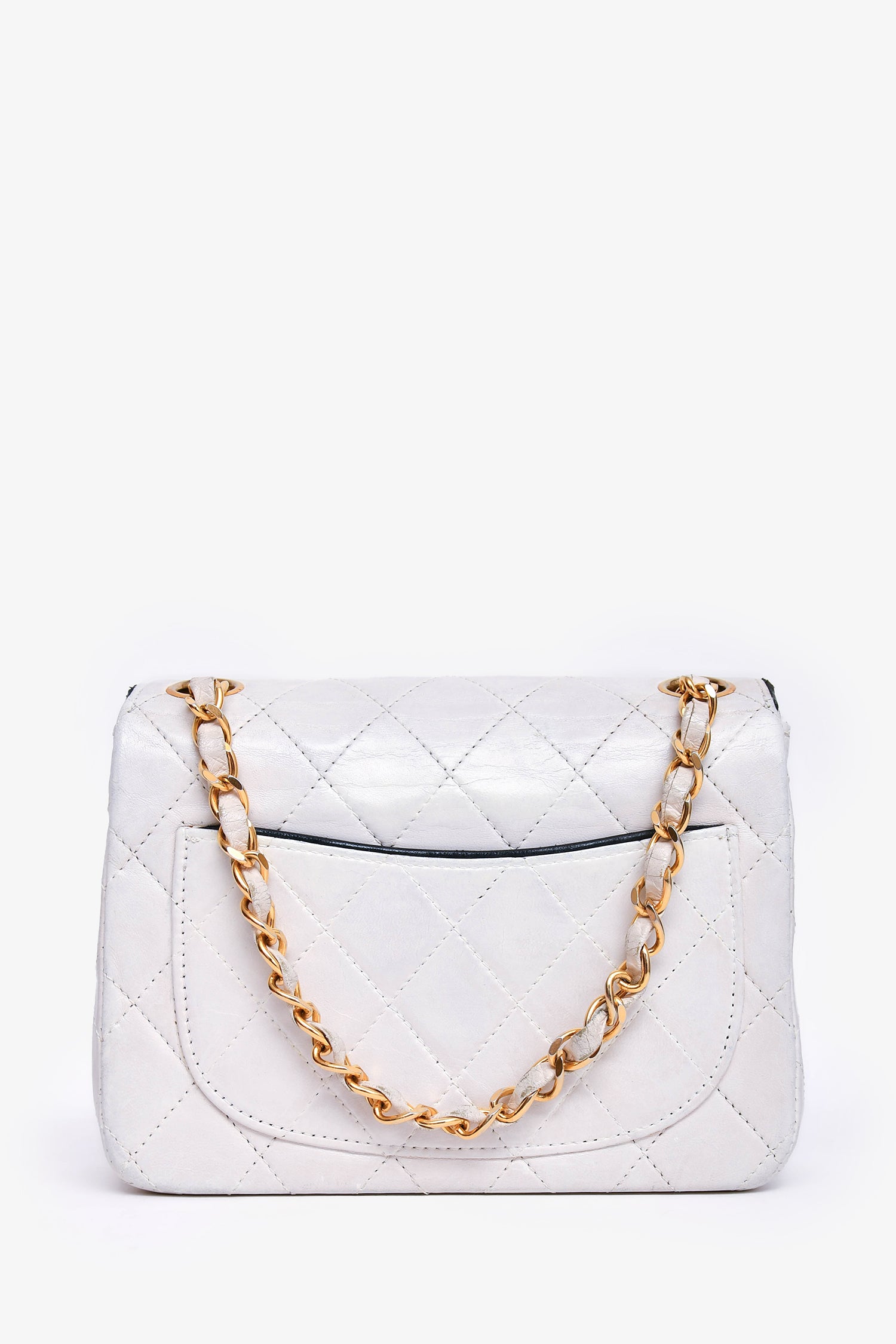Refresh availabilityPre-Loved Chanel™ 1989-91 White/Black Lambskin Leather Mini Square Flap Bag. Front fold-over flap with turn-lock closure. Single exterior slip pocket. Single interior slip pocket. Single interior zip pocket. Gold-toned hardware. Tonal stitching.