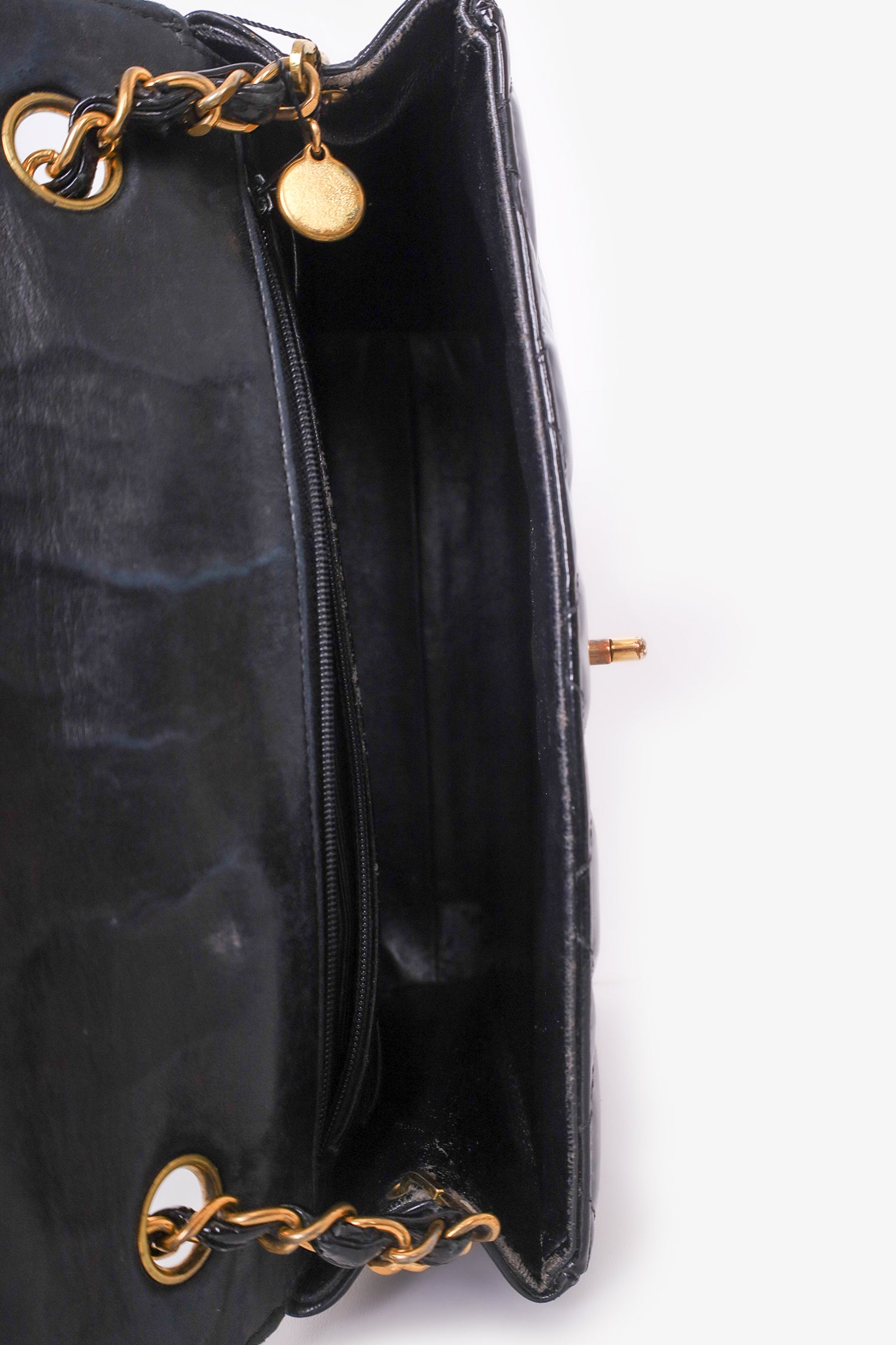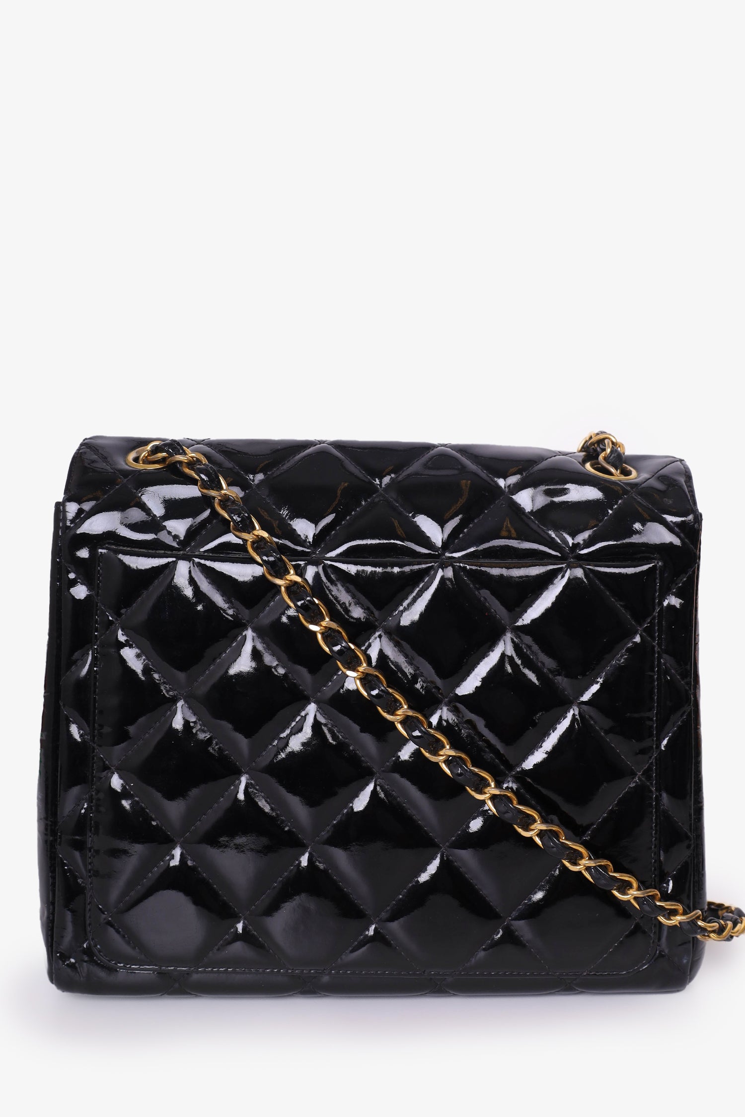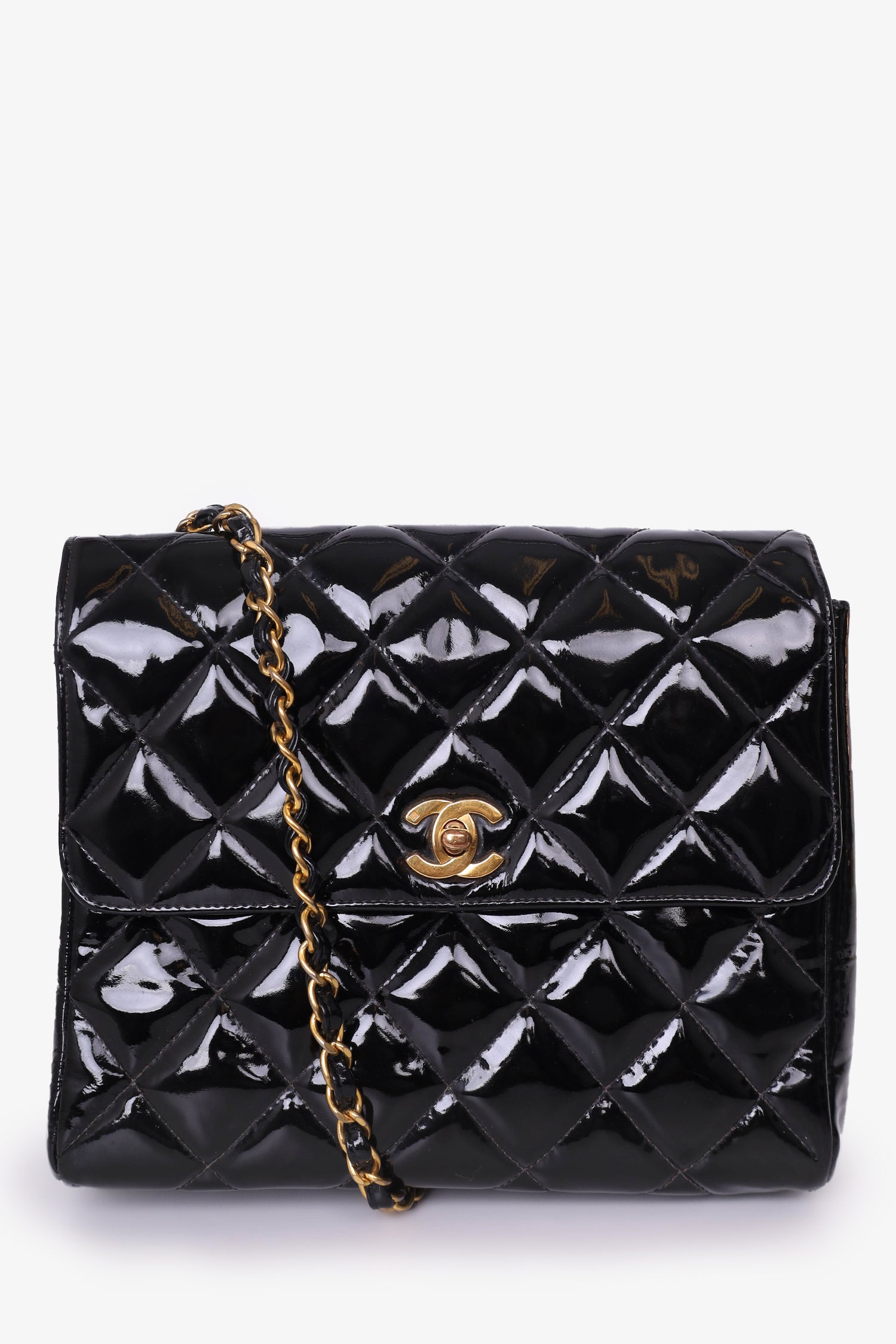 Refresh availabilityPre-Loved Chanel™ 1994 Quilted Patent Leather CC Flap Bag. Front fold-over flap with turn lock closure. Open interior. 2 wall pockets; 1 slip and 1 with zip closure. Single exterior slip pocket on rear. Tonal stitching. Gold-tone hardware.