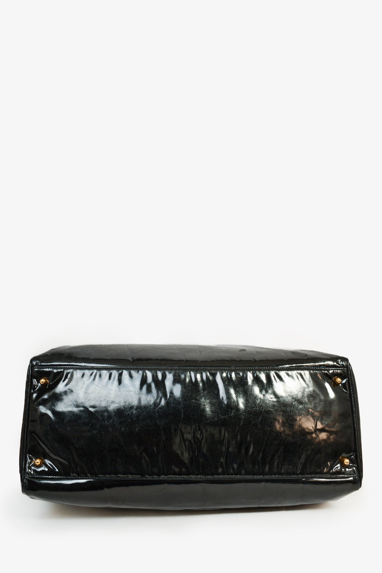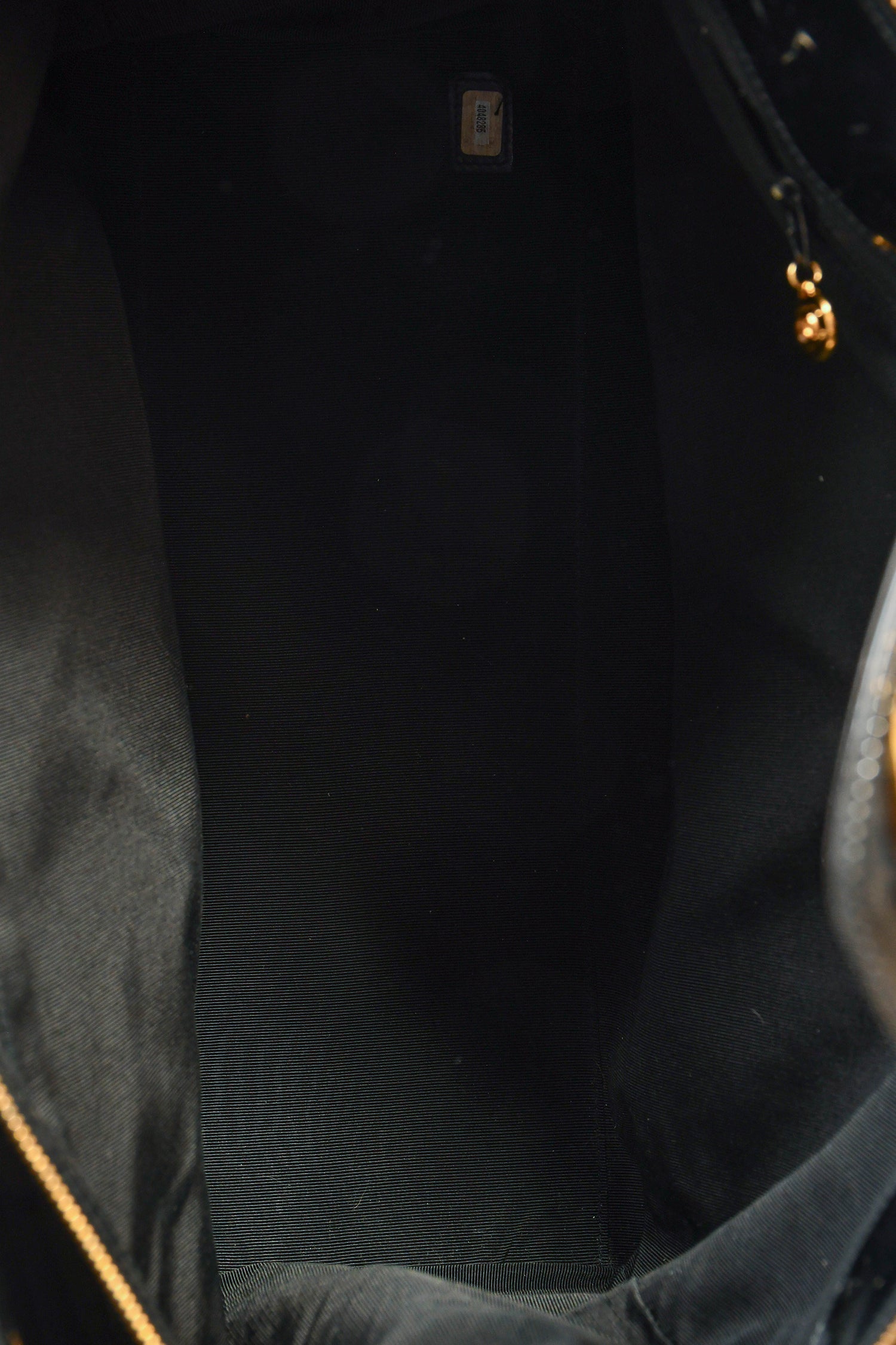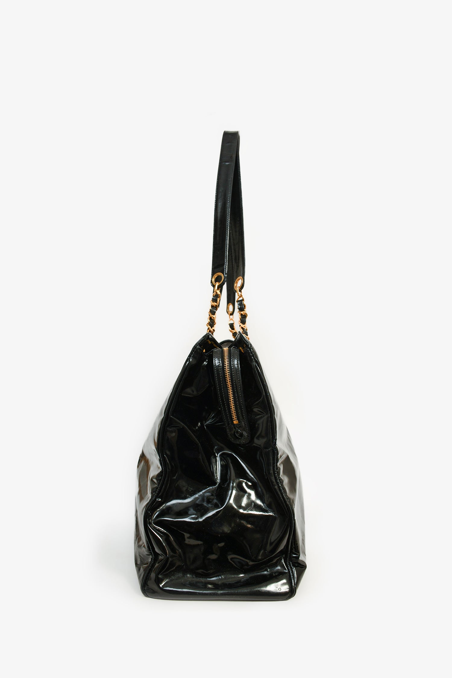 Pre-Loved Chanel™ 1996-97 Black Patent CC XL Supermodel Tote. Gold-tone hardware. Dual handles. Front fold-over strap with turn-lock closure. Top zip closure. Tonal textile interior lining. Two interior wall zip pockets. Glossy finish. Protective metal bottom.