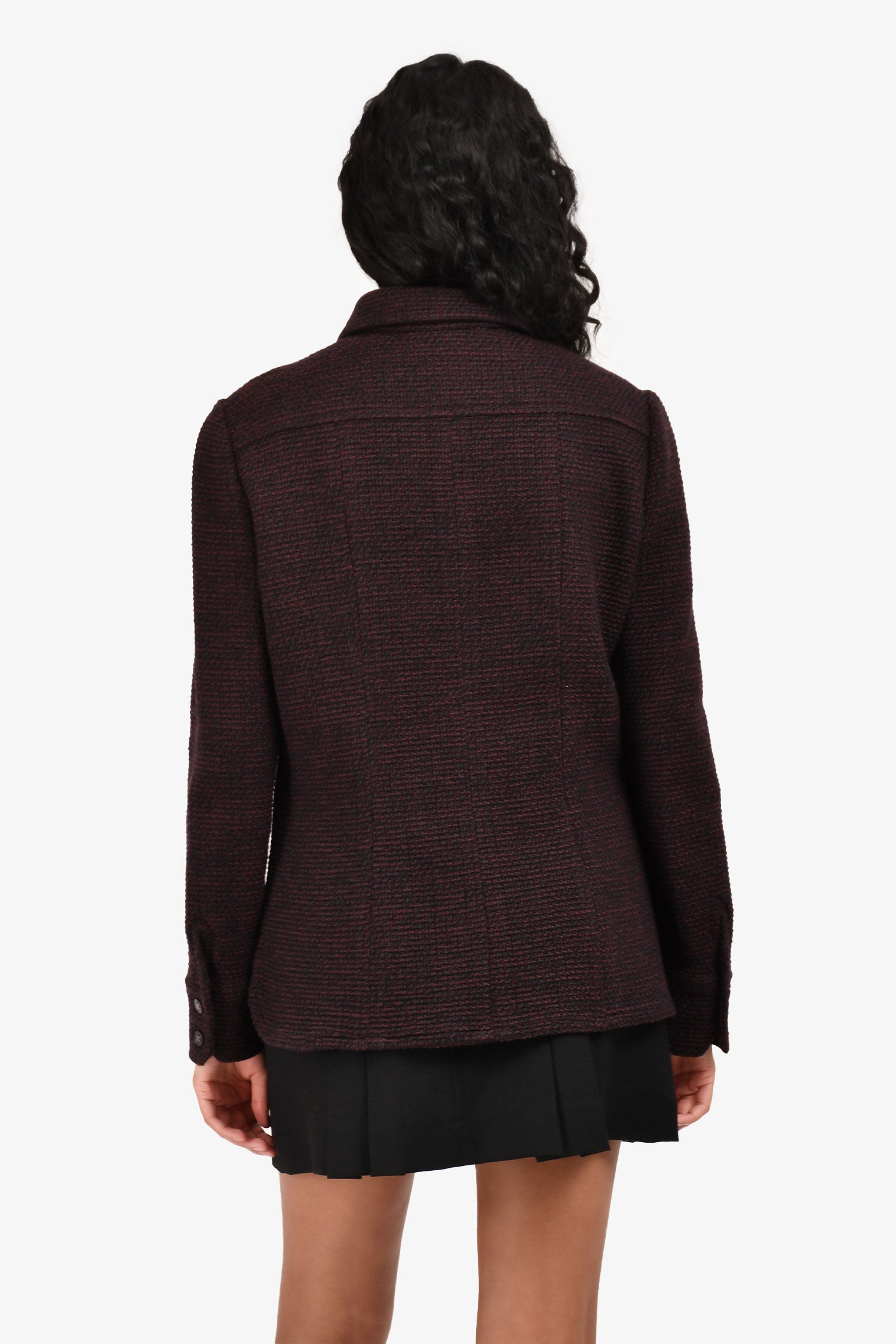 Refresh availabilityPre-Loved Chanel™ 2002 Burgundy Wool Shirt Jacket. Front button-up closure. Buttoned cuffs. Two front slip pockets. Tonal stitching.