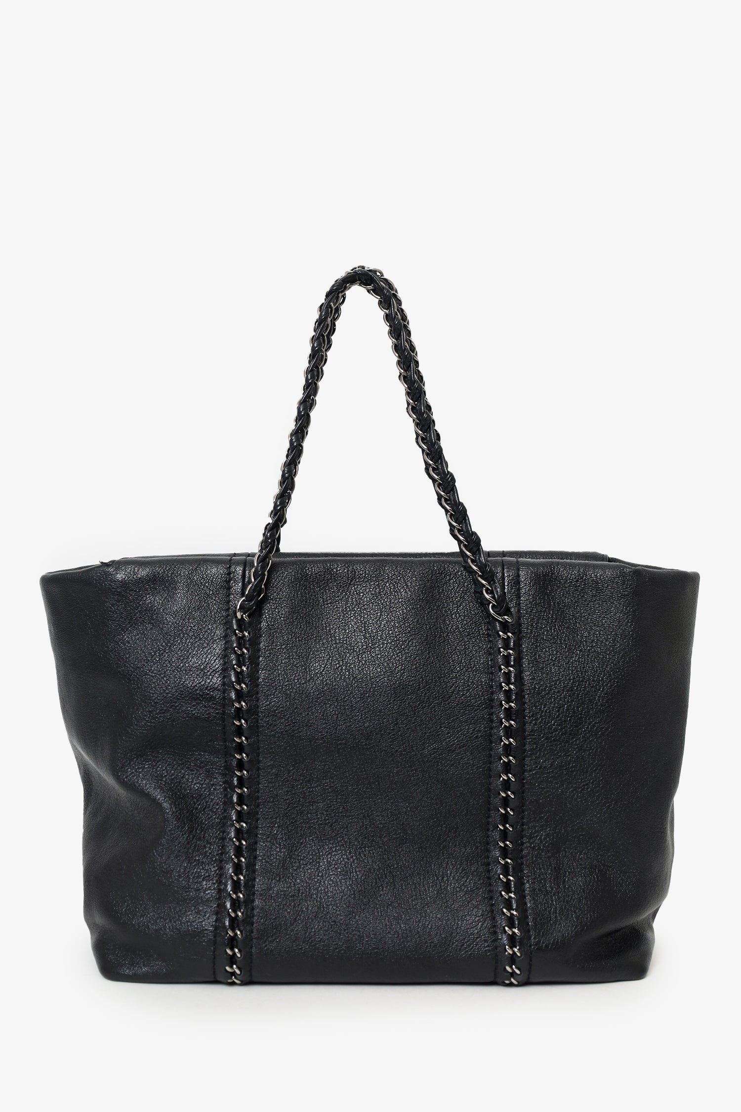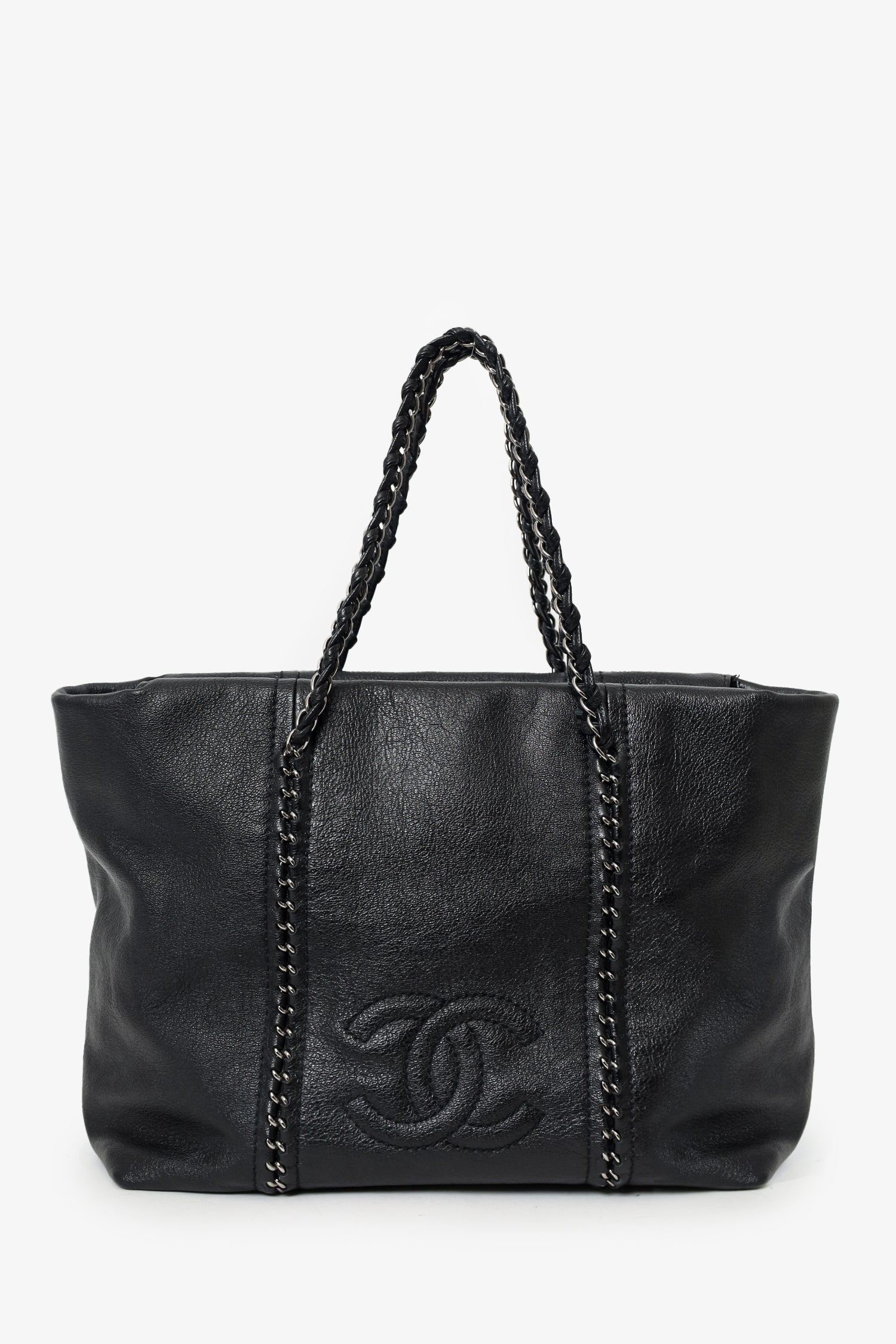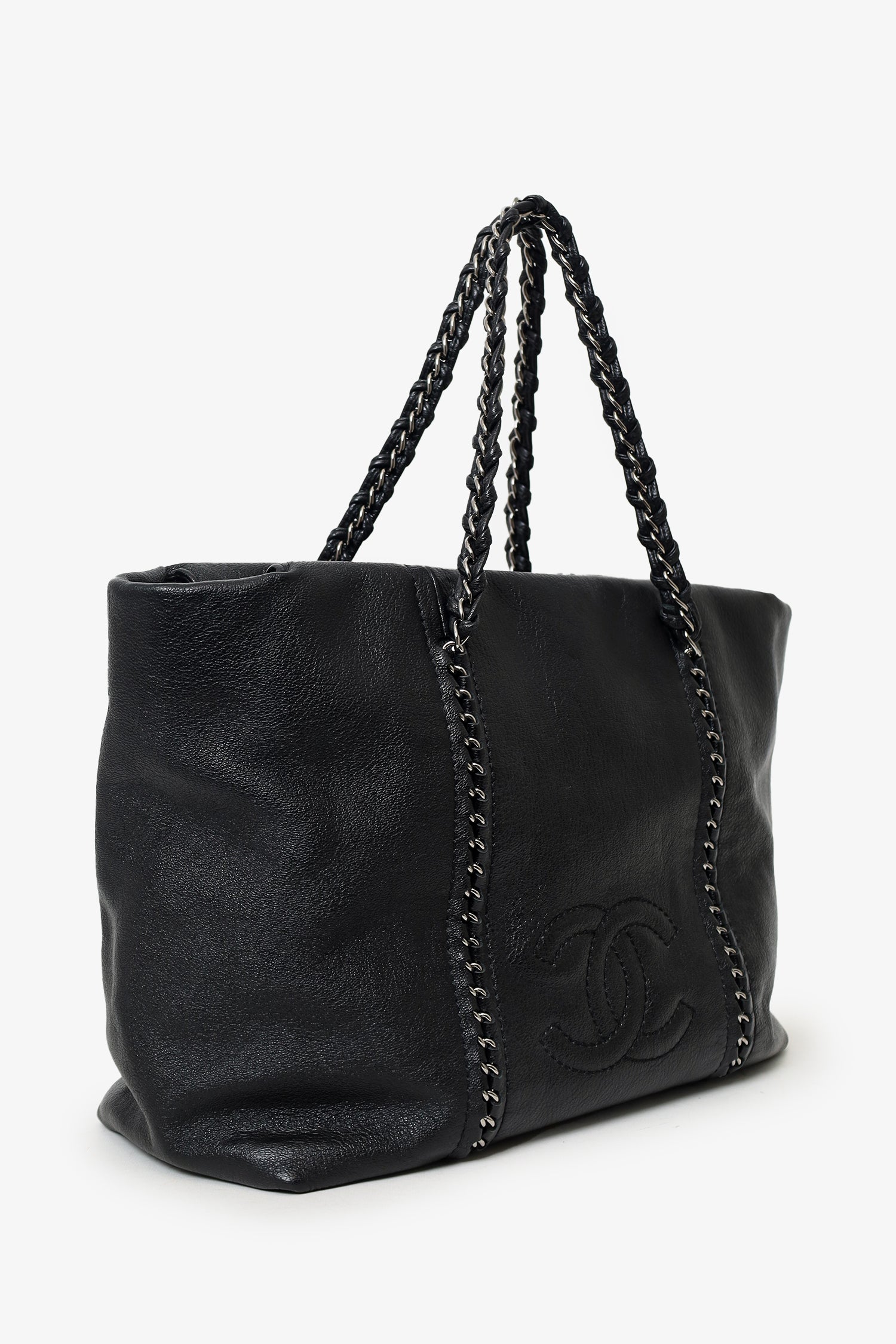 Refresh availabilityPre-Loved Chanel 2005/06 Black Leather Luxe Ligne Tote. Top zip closure. Twin chainlink/leather shoulder straps. Protective studs on bottom. Leather-lined interior. 3 interior pockets; 2 slip and 1 zip. Silver-tone hardware. Tonal stitching.