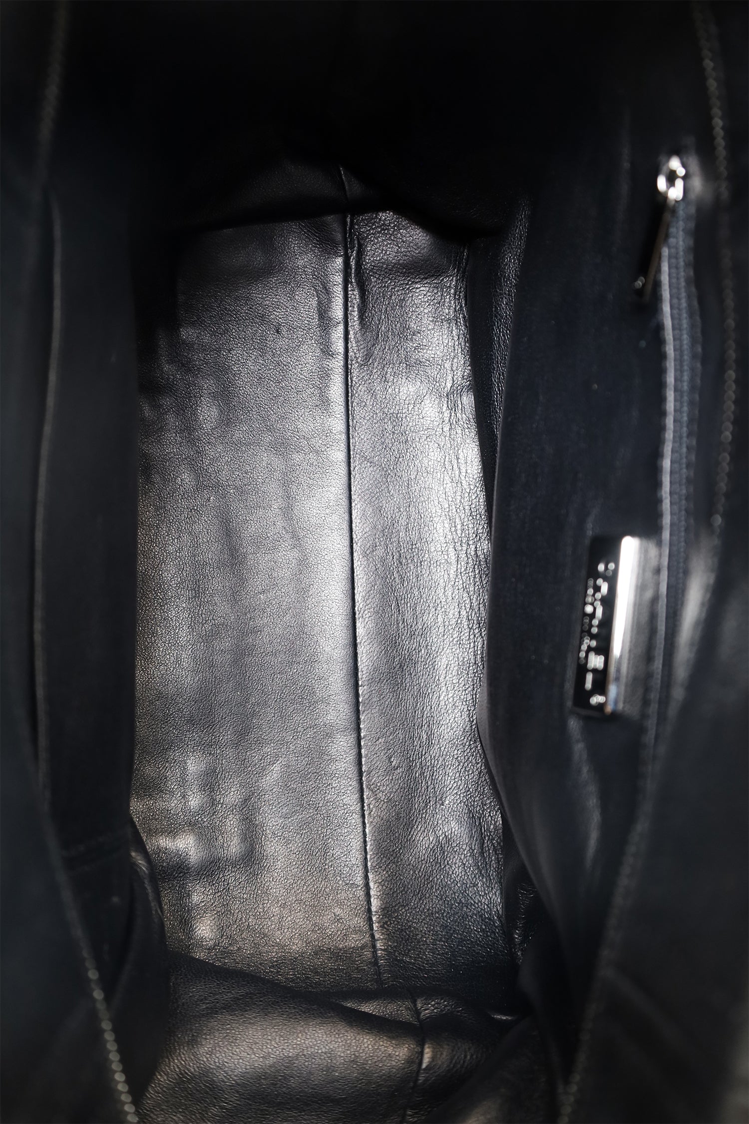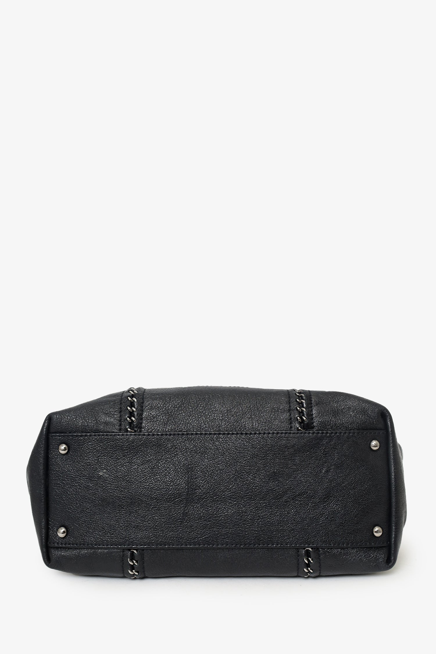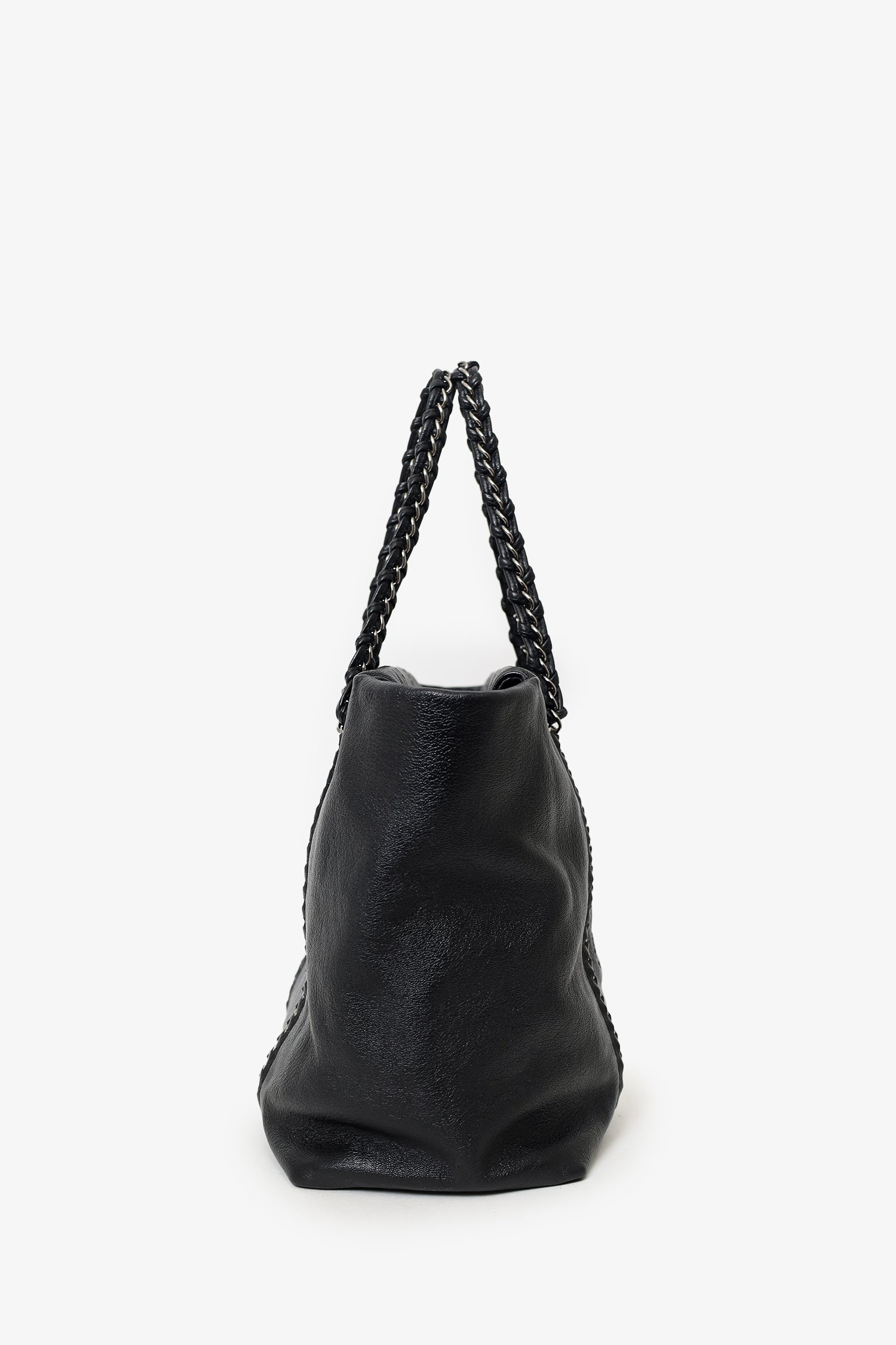 Refresh availabilityPre-Loved Chanel 2005/06 Black Leather Luxe Ligne Tote. Top zip closure. Twin chainlink/leather shoulder straps. Protective studs on bottom. Leather-lined interior. 3 interior pockets; 2 slip and 1 zip. Silver-tone hardware. Tonal stitching.