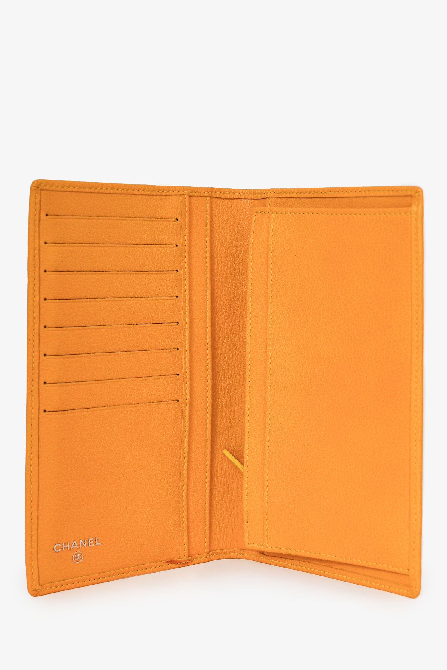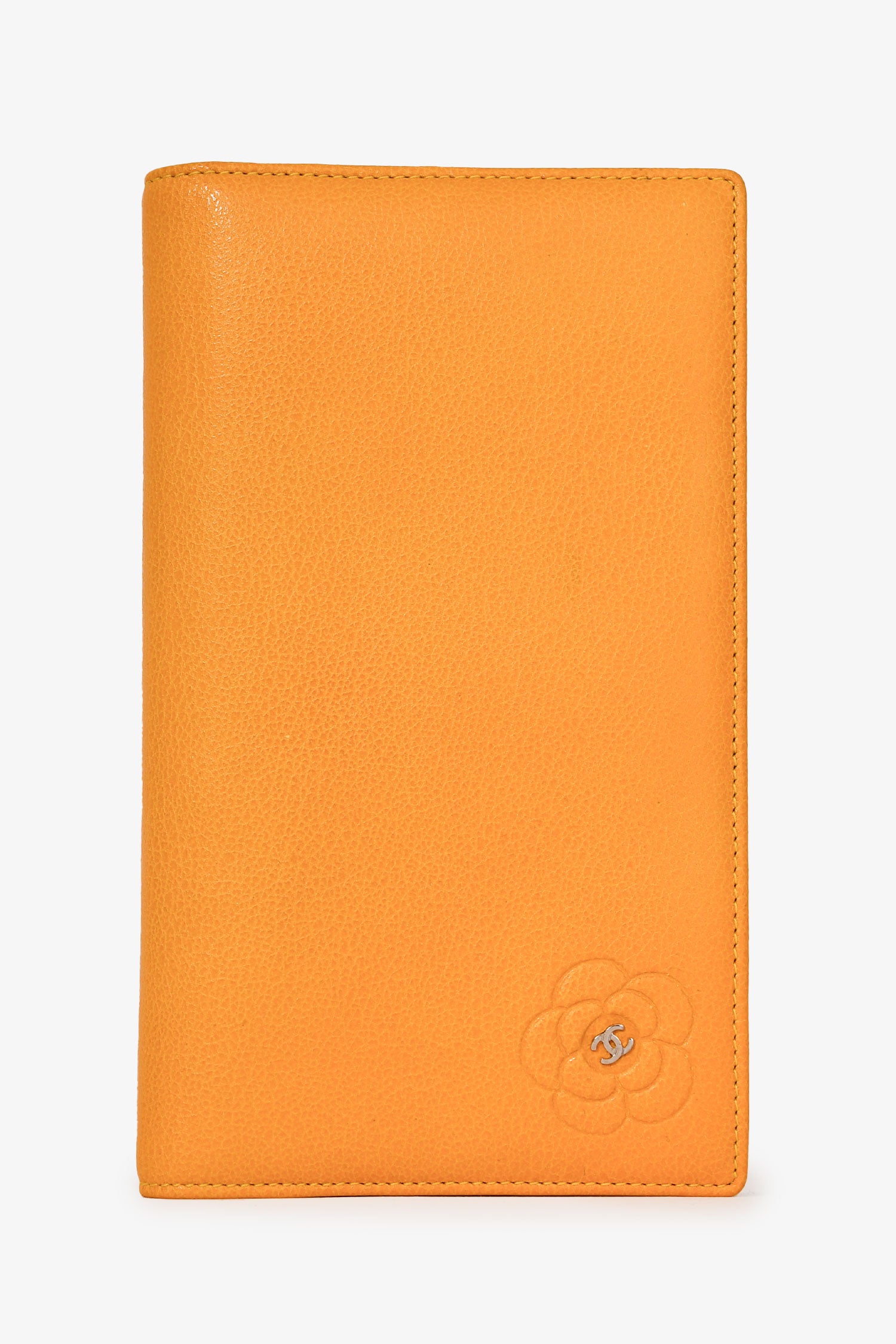 Refresh availabilityPre-Loved Chanel™ 2009-2010 Yellow Leather Camilla Logo Long Wallet. Bi-fold opening. Silver-tone hardware. 8 card slots. 4 slip compartments. 1 zipped compartment. Tonal stitching.