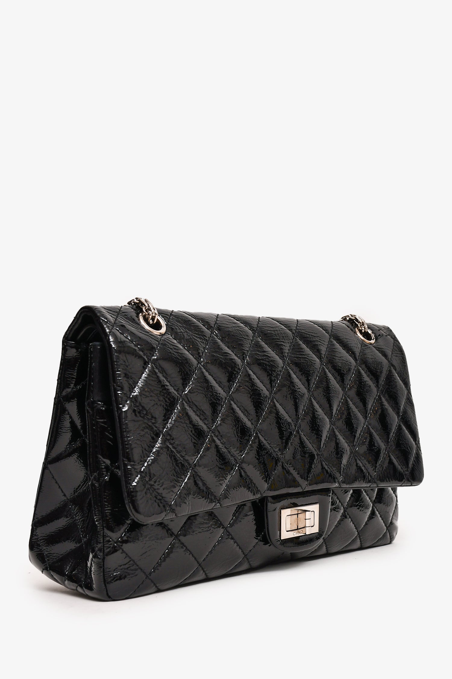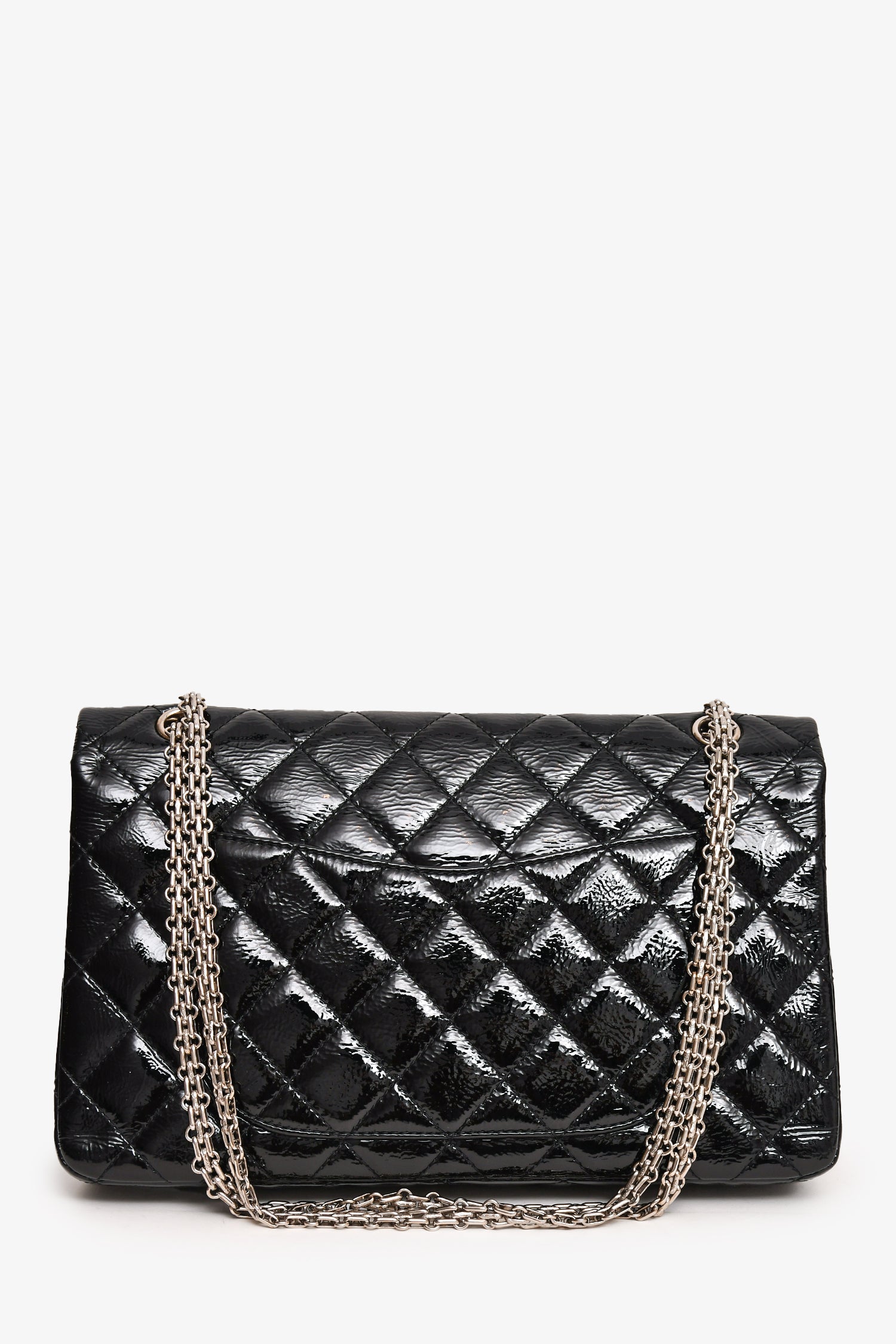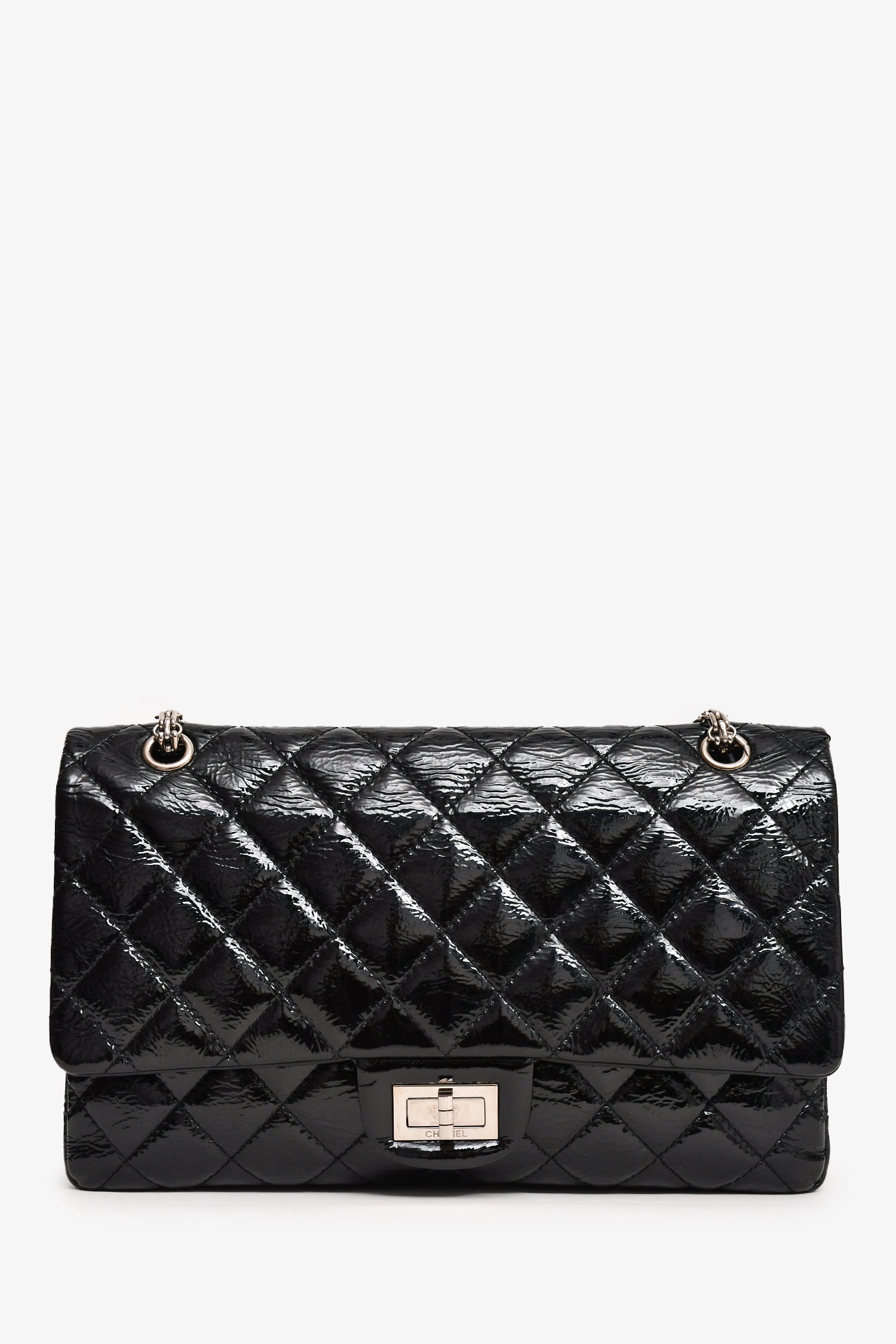 Refresh availabilityPre-Loved Chanel™ 2010-11 Black Patent Leather 2.55 Large 227 Flap Bag SHW. Fold-over flap with a turn-lock closure. Silver-tone hardware. Tonal stitching. Chain-link shoulder strap. Exterior slip pocket. Zipped compartment on the interior flap. Interior smooth leather fold-over flap. 2 pockets.