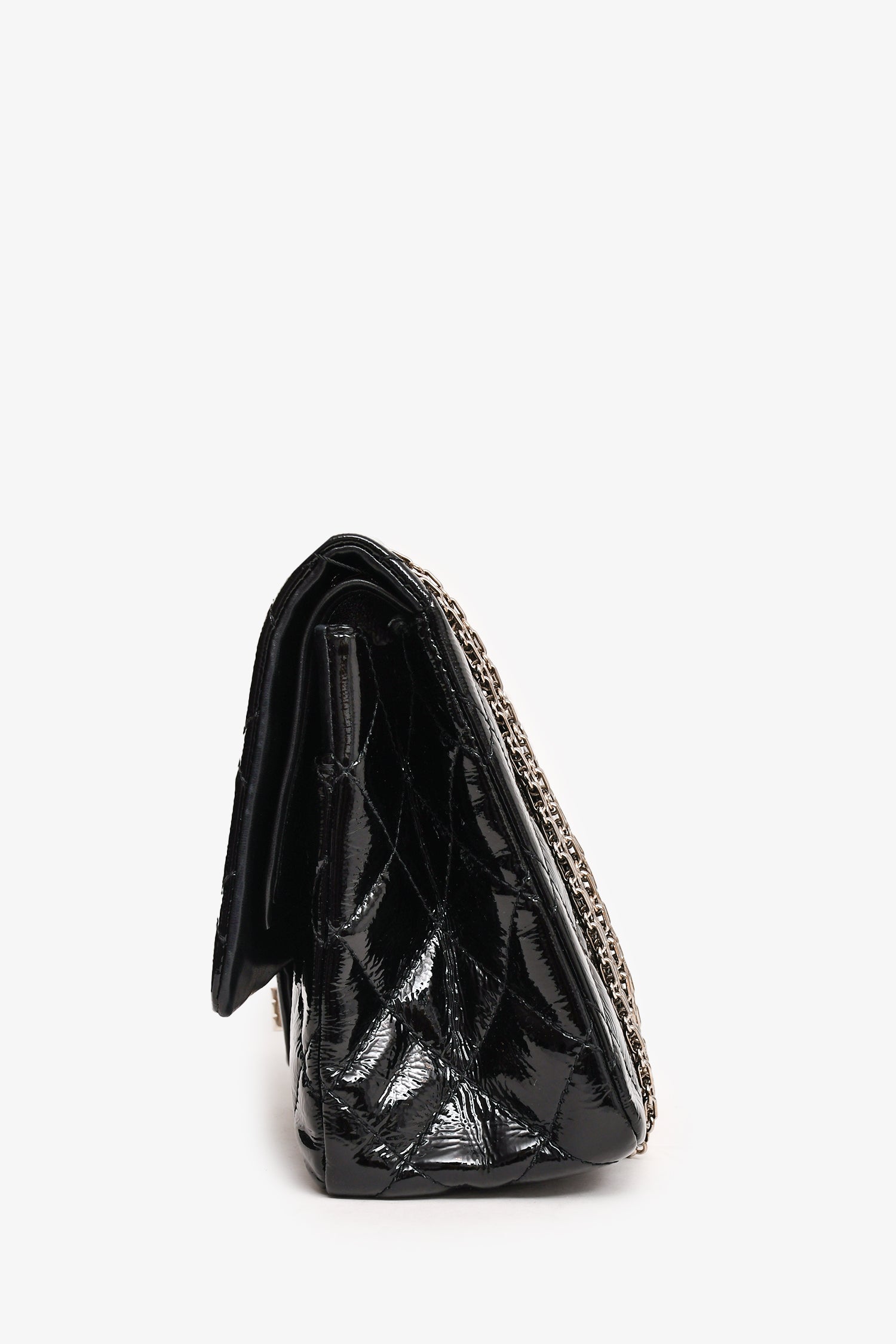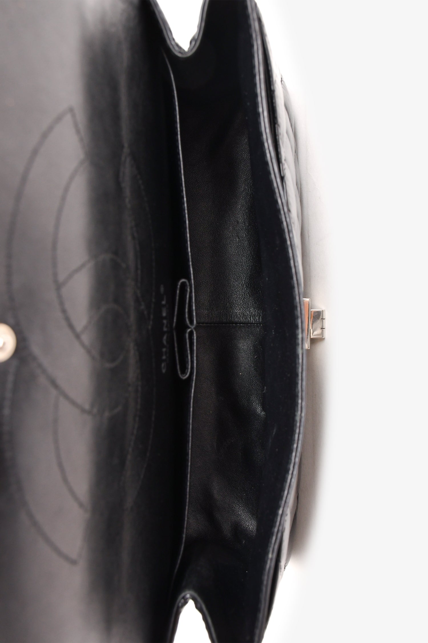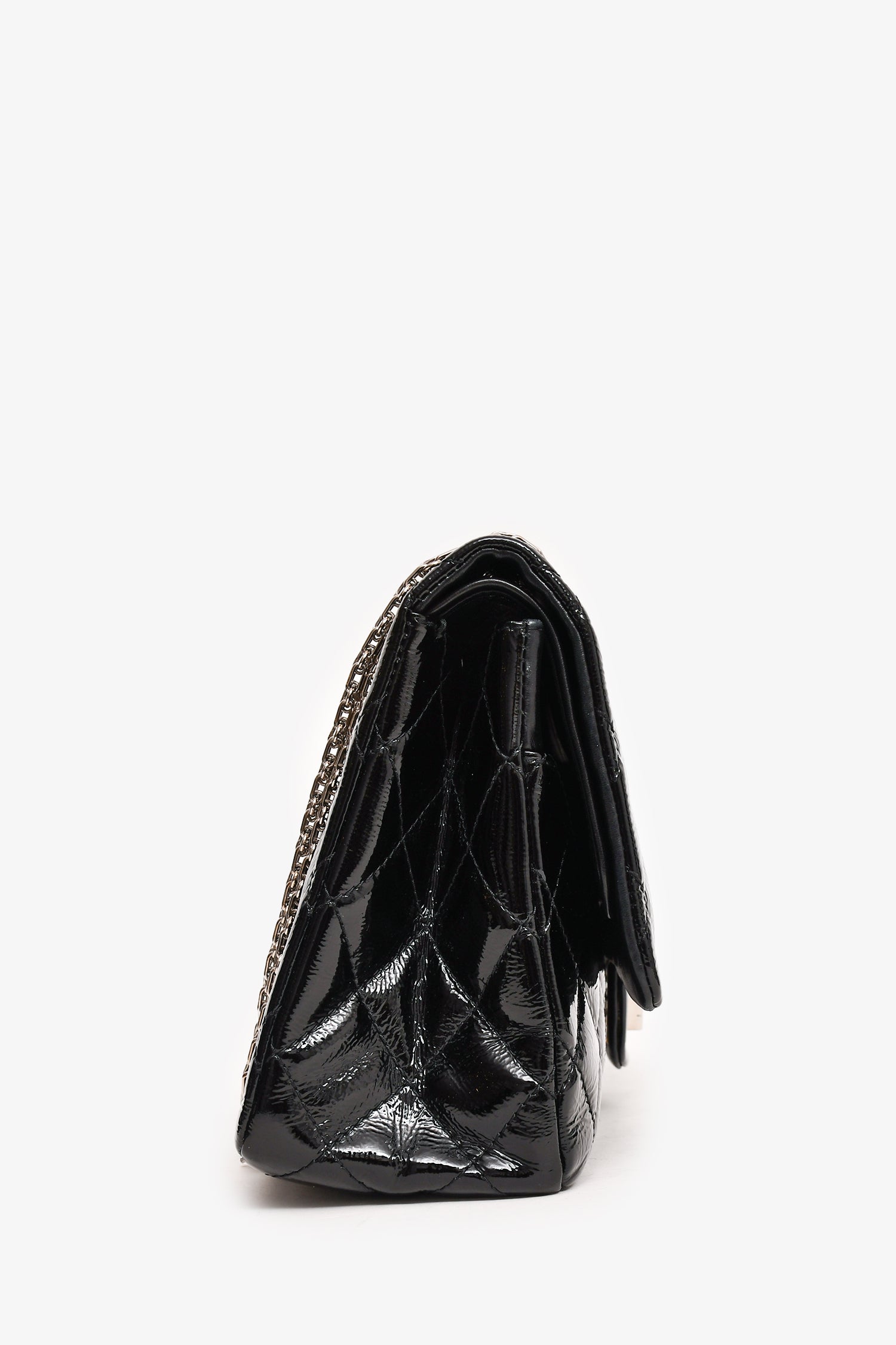 Refresh availabilityPre-Loved Chanel™ 2010-11 Black Patent Leather 2.55 Large 227 Flap Bag SHW. Fold-over flap with a turn-lock closure. Silver-tone hardware. Tonal stitching. Chain-link shoulder strap. Exterior slip pocket. Zipped compartment on the interior flap. Interior smooth leather fold-over flap. 2 pockets.