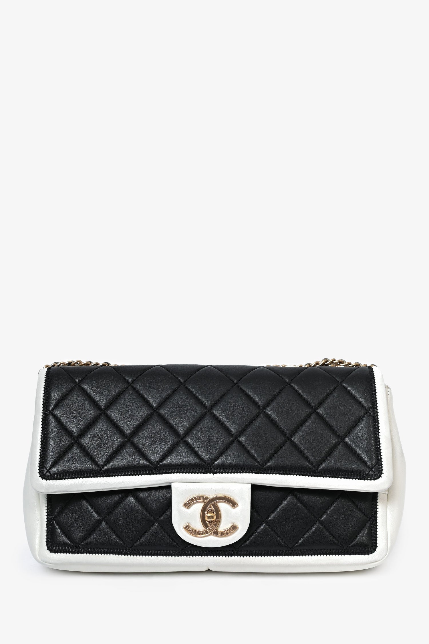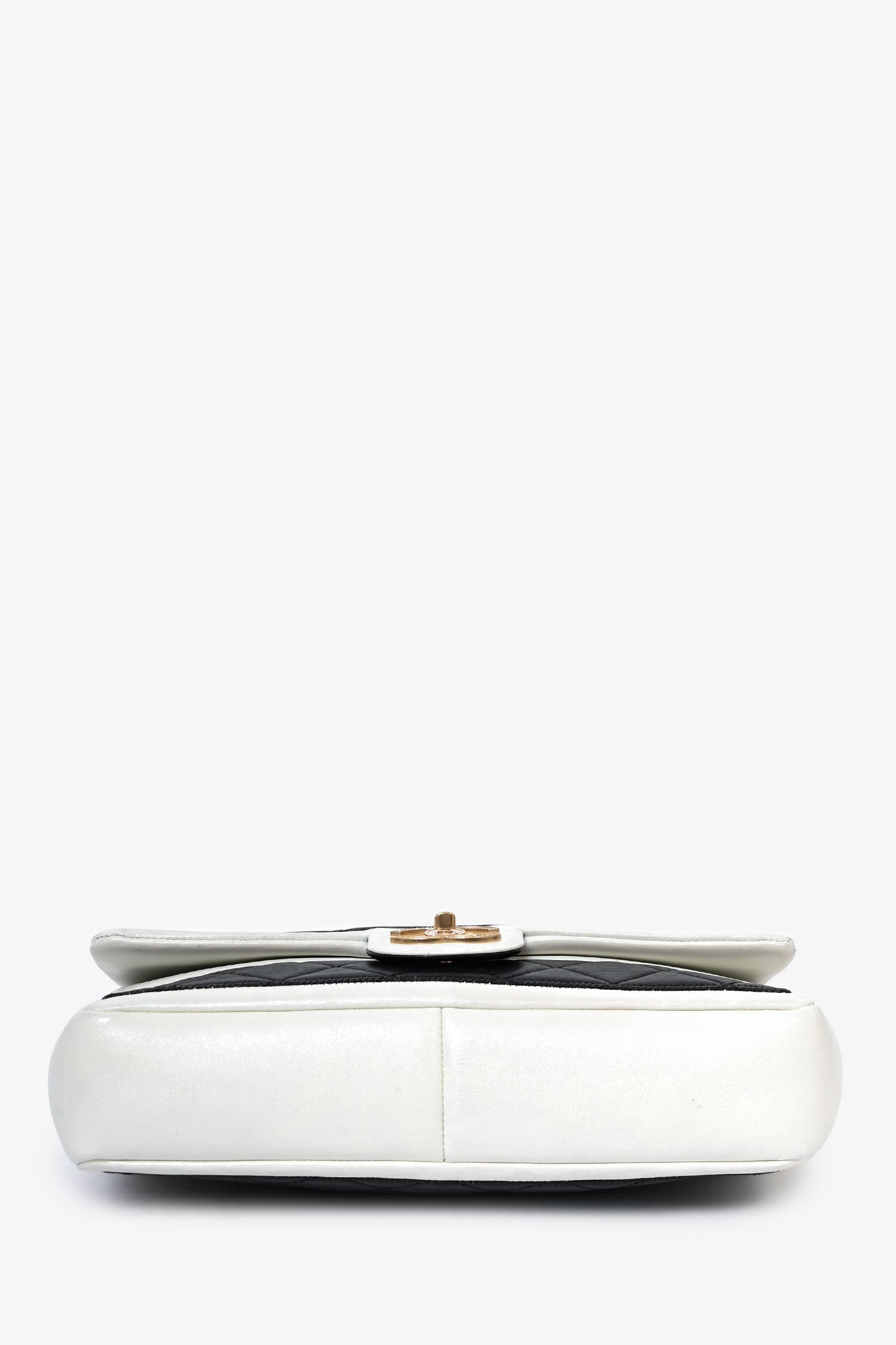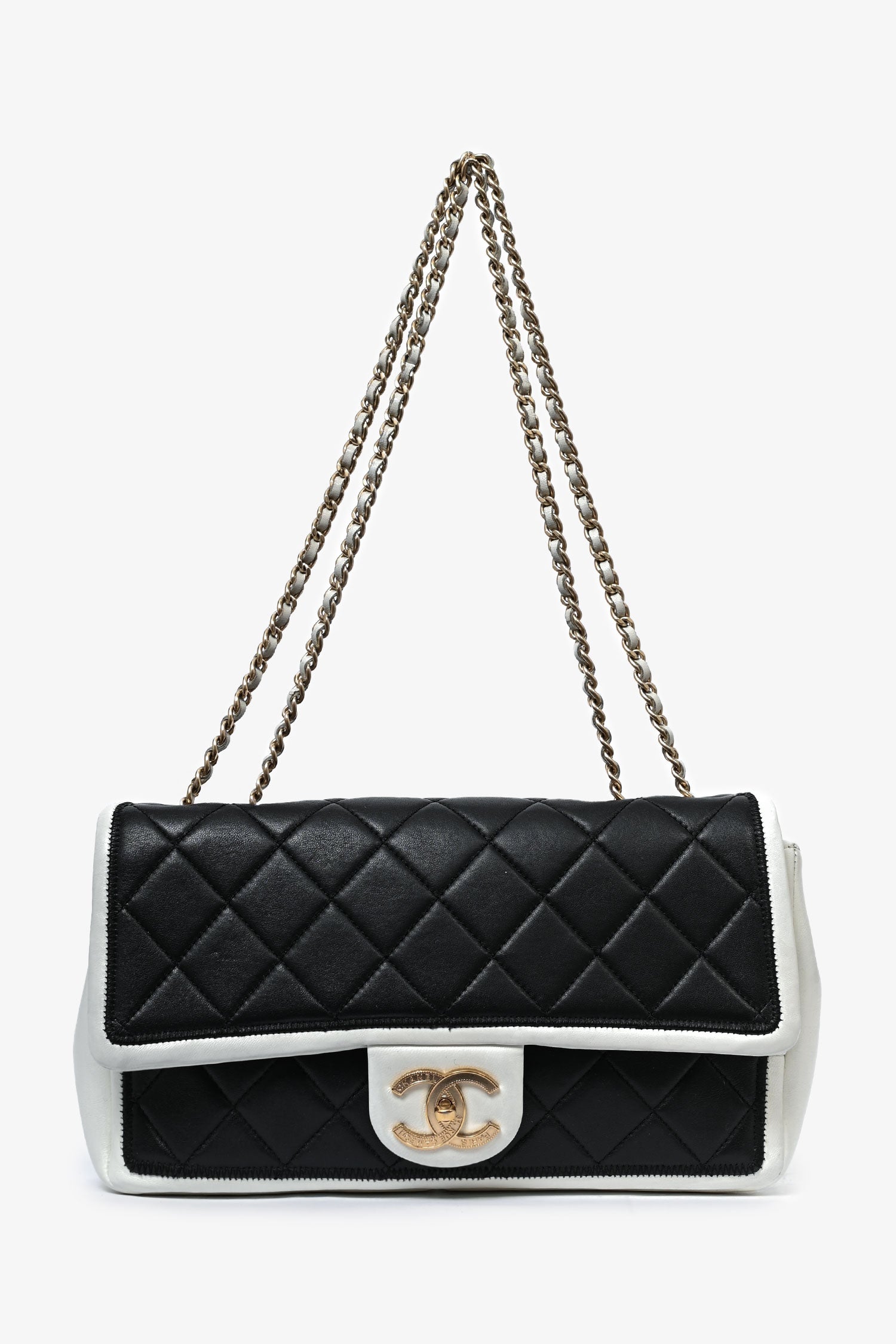 Refresh availabilityPre-Loved Chanel™ 2012/13 Black/White Lambskin Medium Graphic Flap Bag. Gold-tone turn-lock closure. Fold-over flap. Lined interior with a zipped compartment. Chain-link crossbody strap with woven white leather. Tonal stitching.