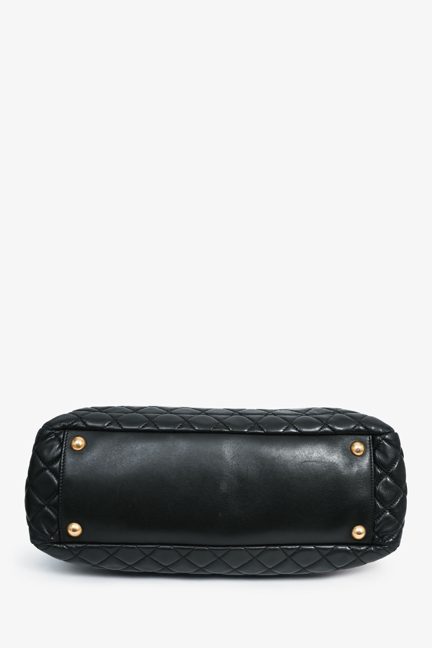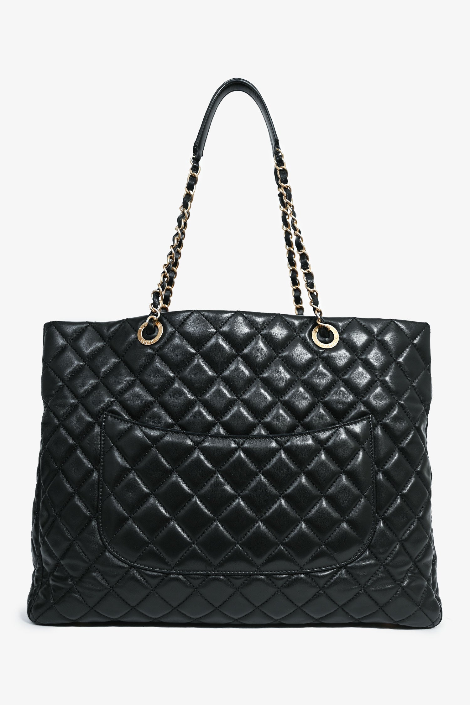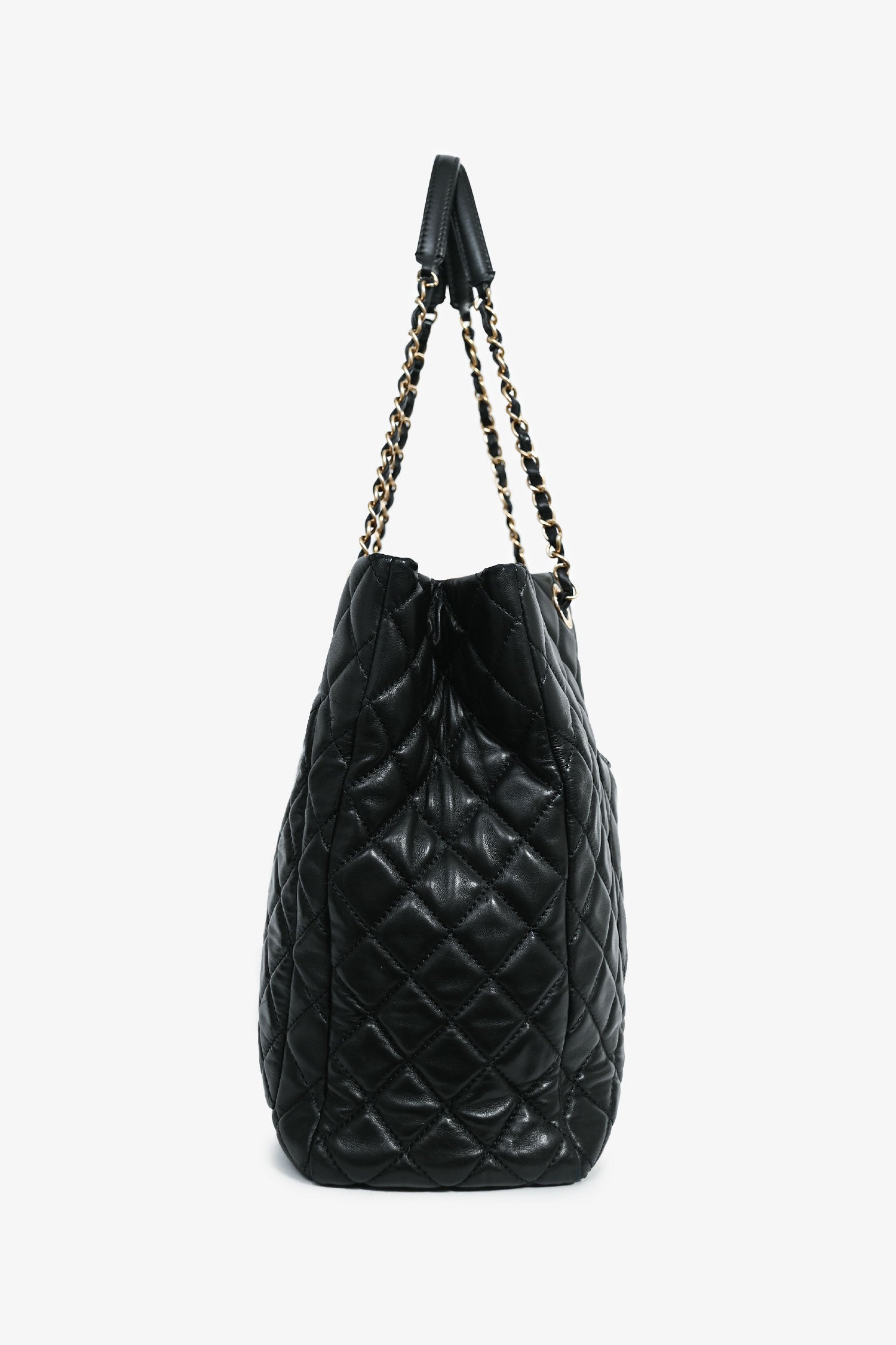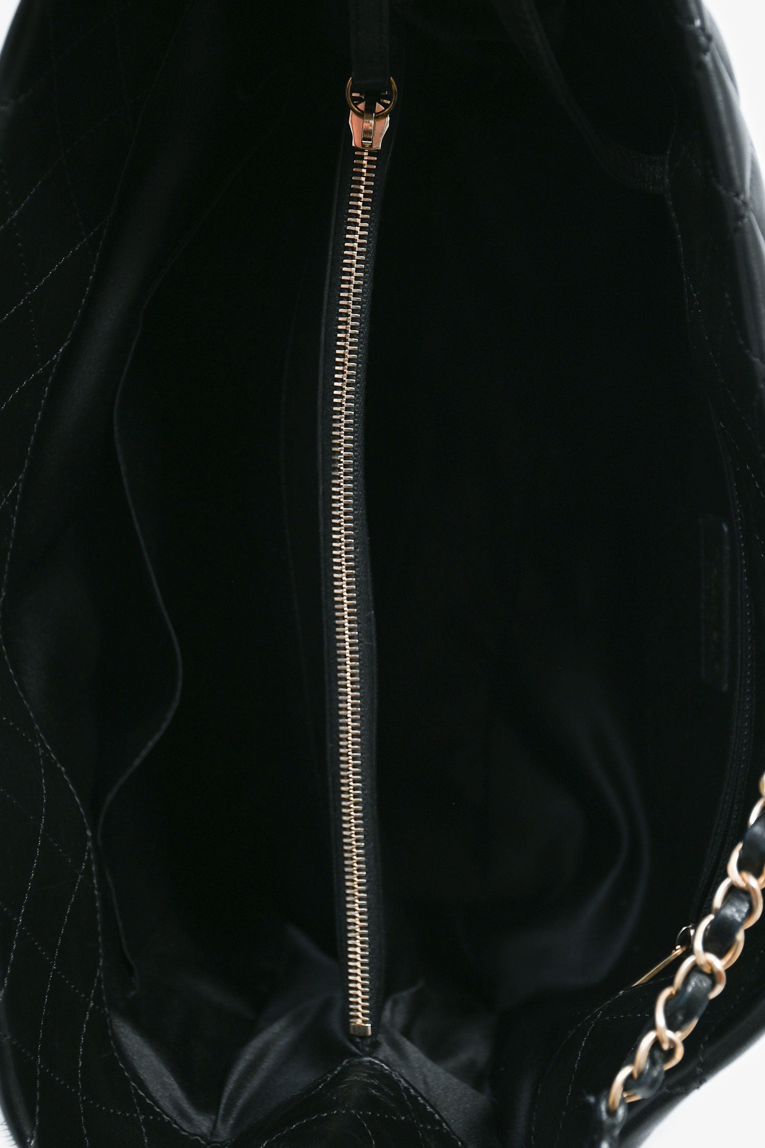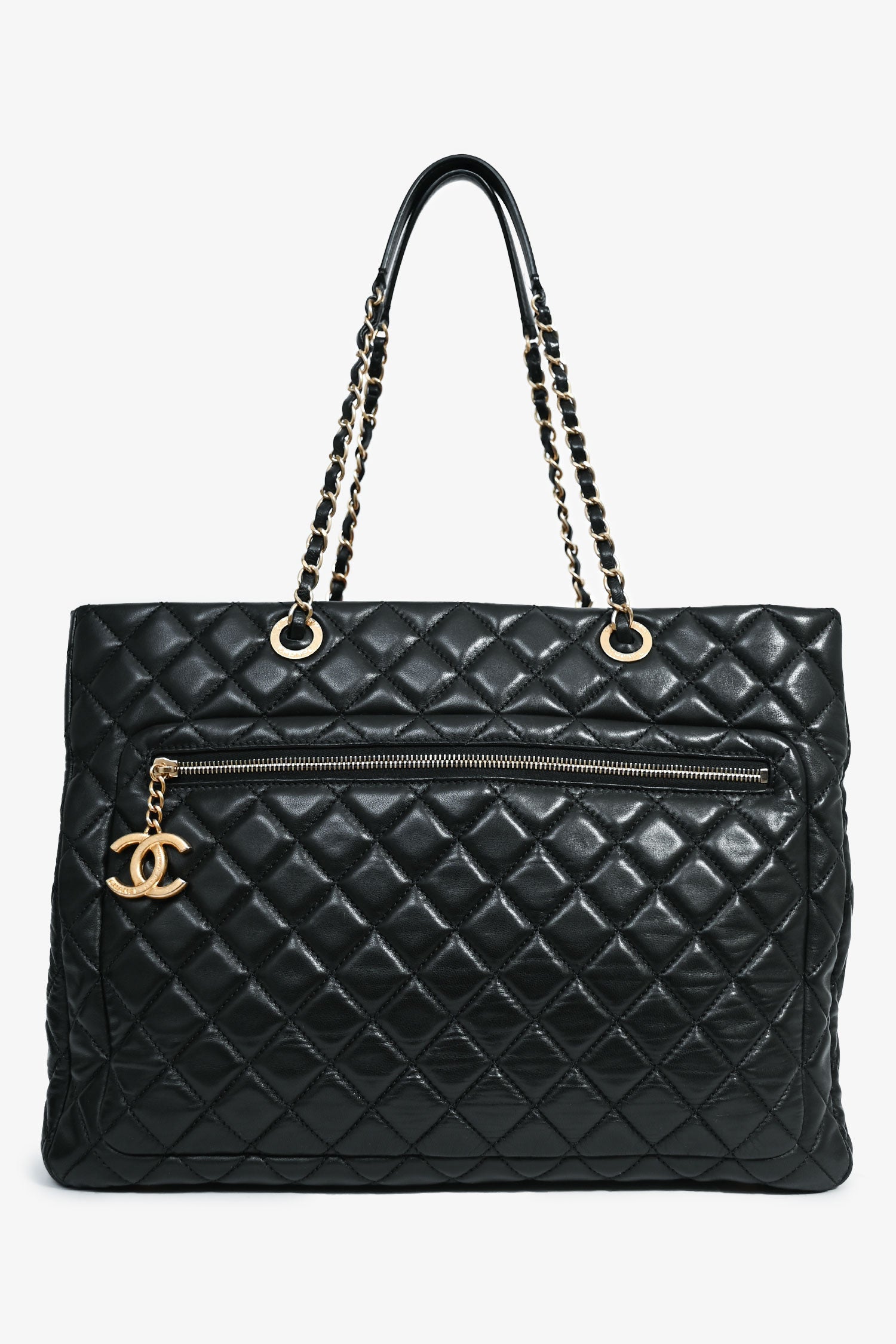 Pre-Loved Chanel™ 2013 Black Lambskin Quilted CC Charm Tote. Dual handle. Exterior front wall pocket with zipper closure. Rear exterior slip pocket. Open compartment with 2 slip wall pockets, and a wall pocket with zipper closure. Middle interior compartment with zipper closure. Interior bag strap. Protective hardware studs on bottom. Textile lining. Gold-tone hardware. Tonal stitching. Dust bag included.
