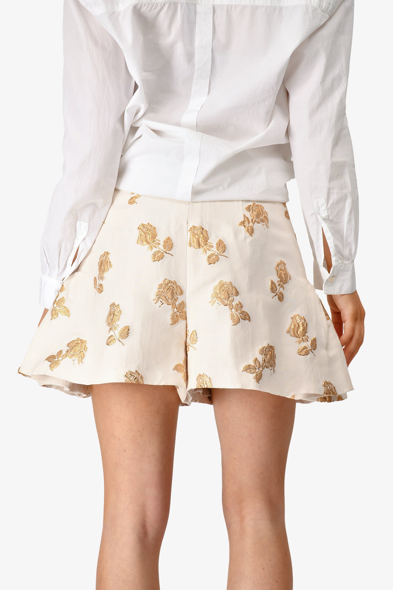Refresh availabilityPre-loved Chanel™ 2013 Cream/Gold Silk Rose Embroidered High Waisted Shorts. Front zip and button closure. 2 front slip pockets. Lined. Tonal stitching.