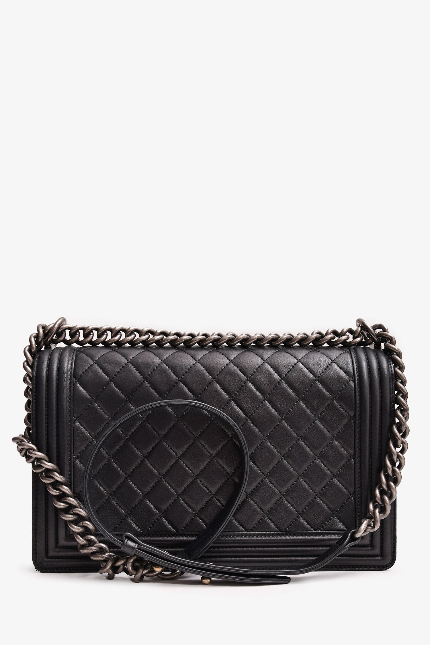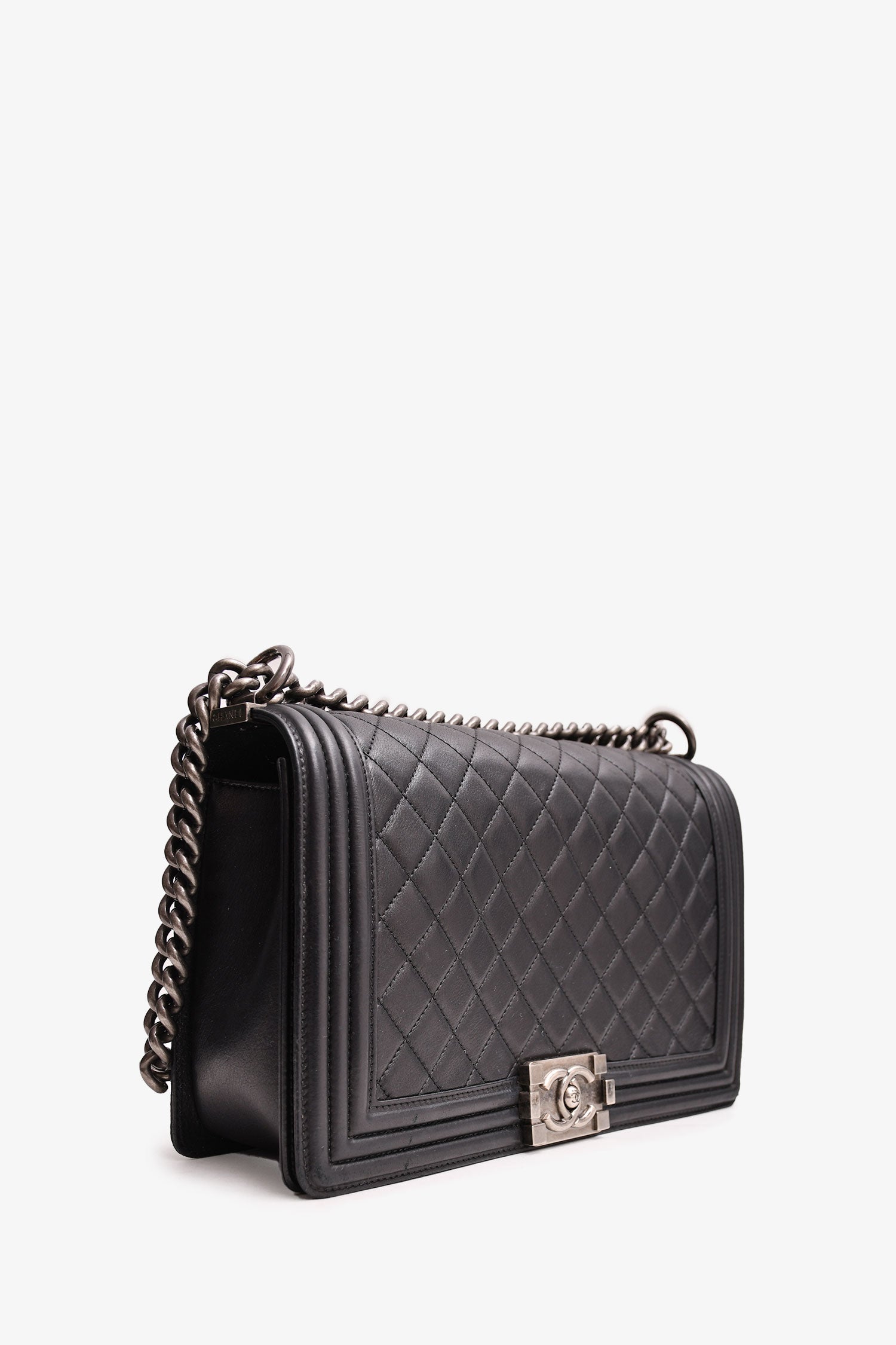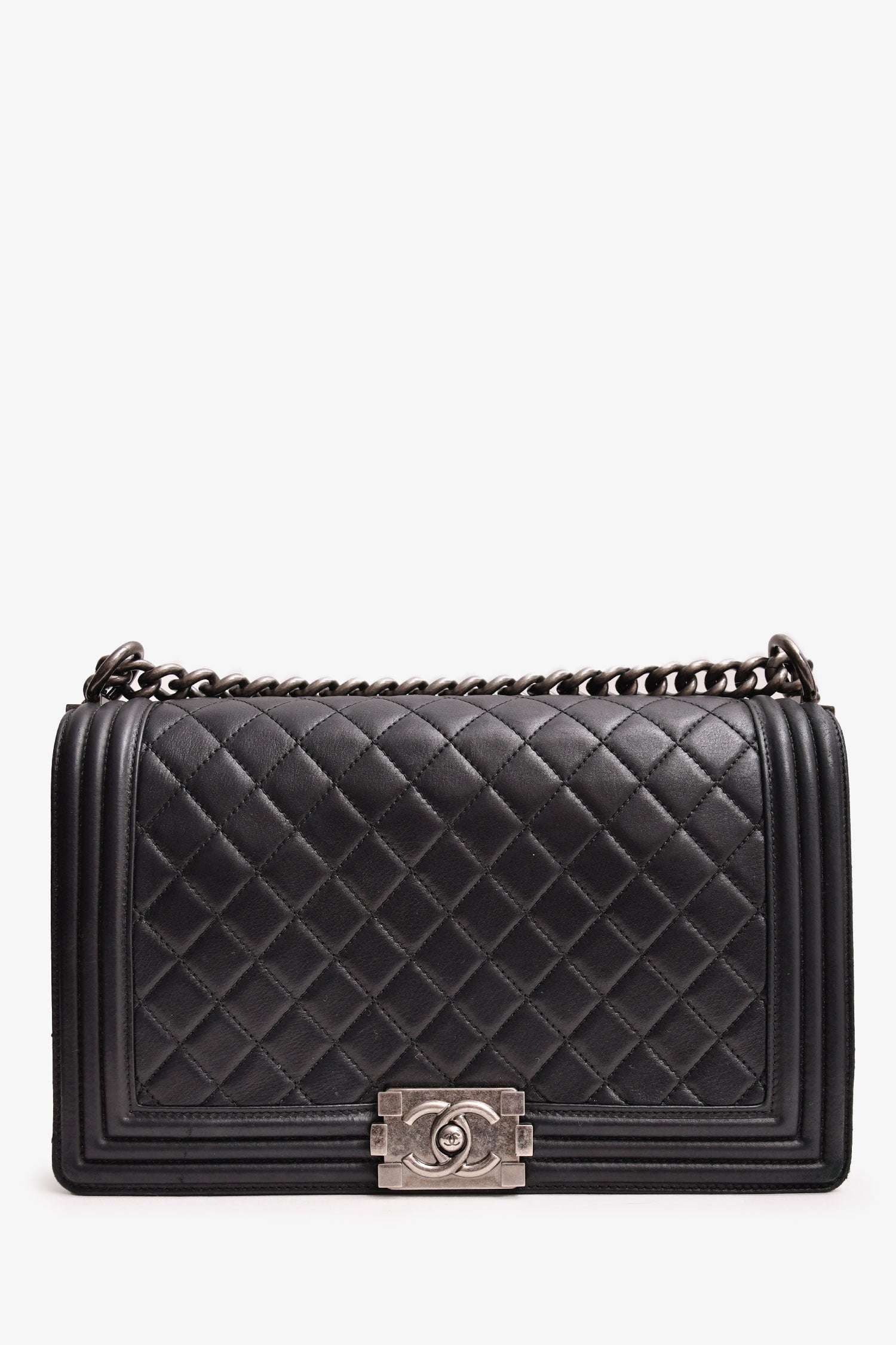 Refresh availabilityPre-Loved Chanel™ 2014 Black Quilted Leather Large Boy Bag. Front fold-over flap with pinch-lock closure. Grey textile interior lining. 3 interior wall pockets; 2 slip and 1 with zip closure. Slide-around chain. Silver-tone hardware.