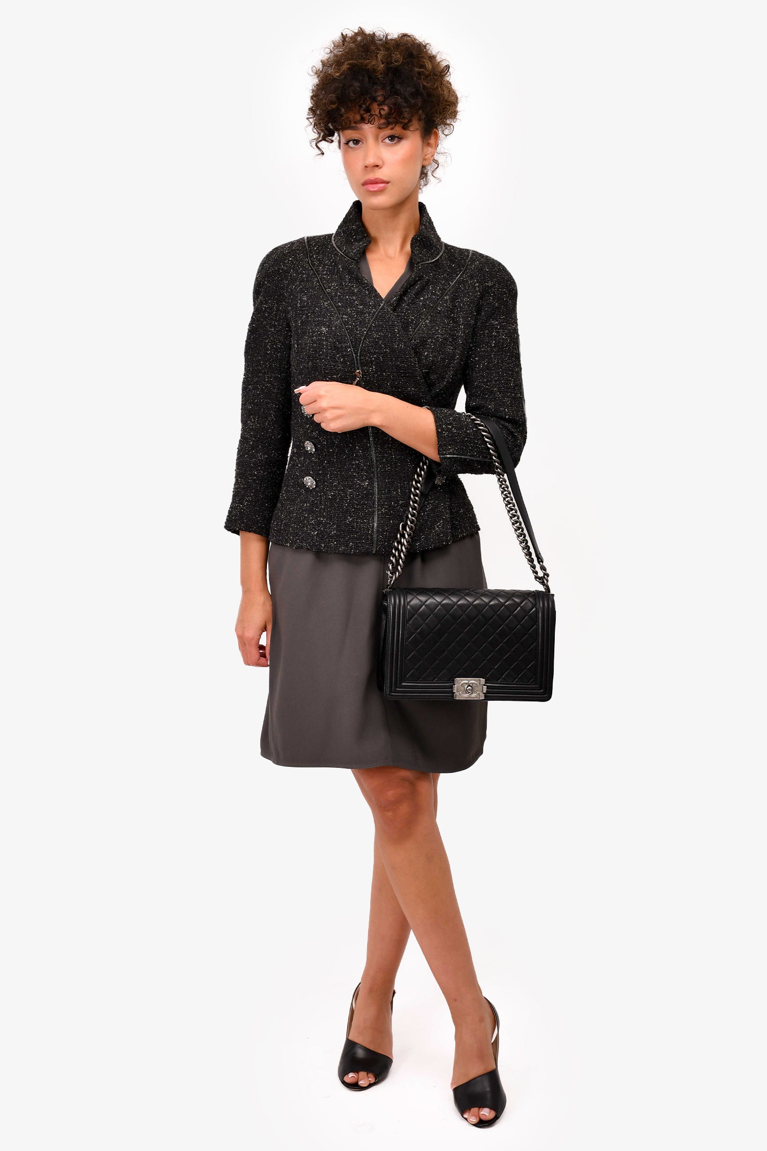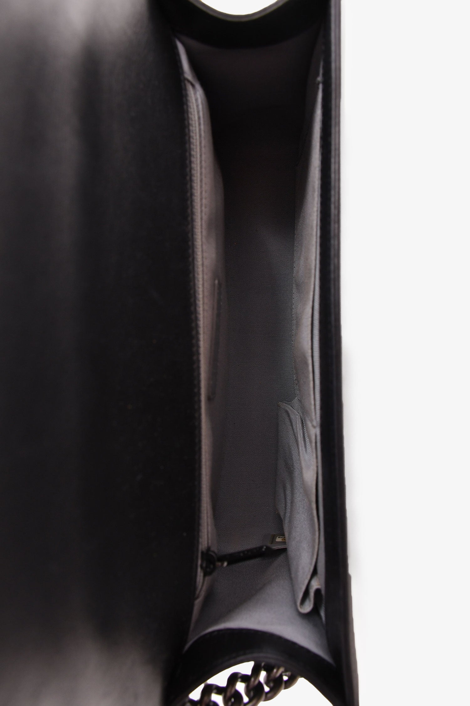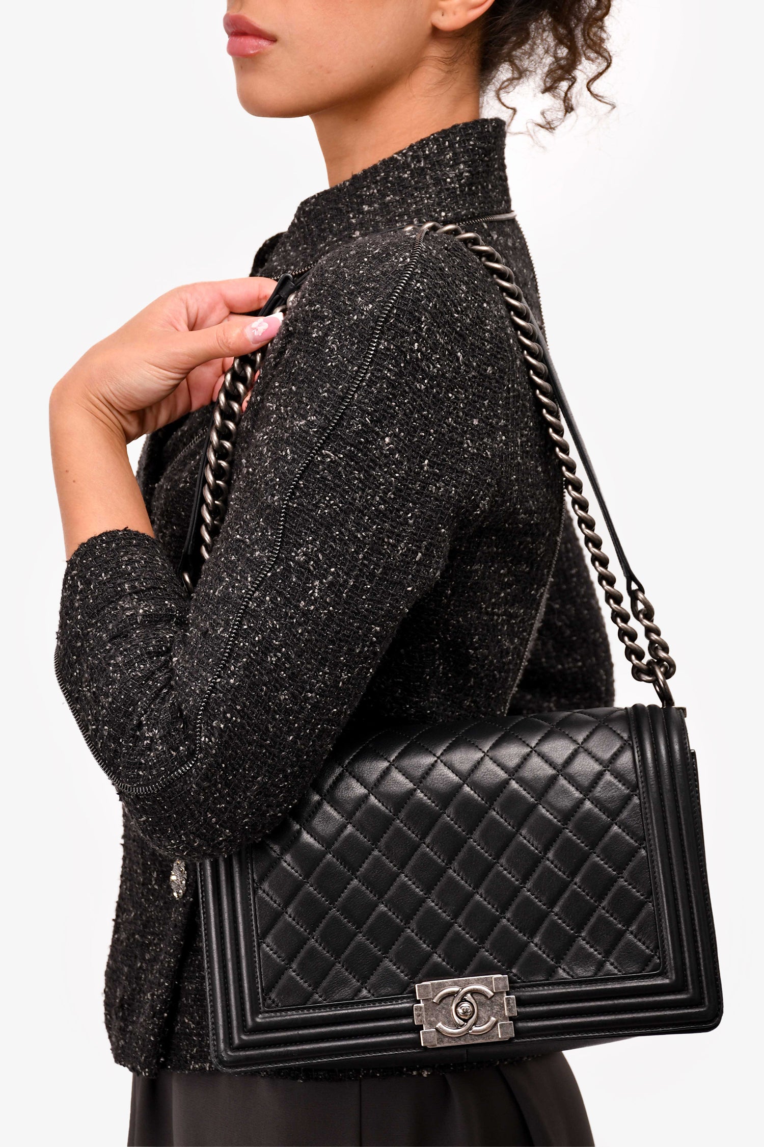Refresh availabilityPre-Loved Chanel™ 2014 Black Quilted Leather Large Boy Bag. Front fold-over flap with pinch-lock closure. Grey textile interior lining. 3 interior wall pockets; 2 slip and 1 with zip closure. Slide-around chain. Silver-tone hardware.