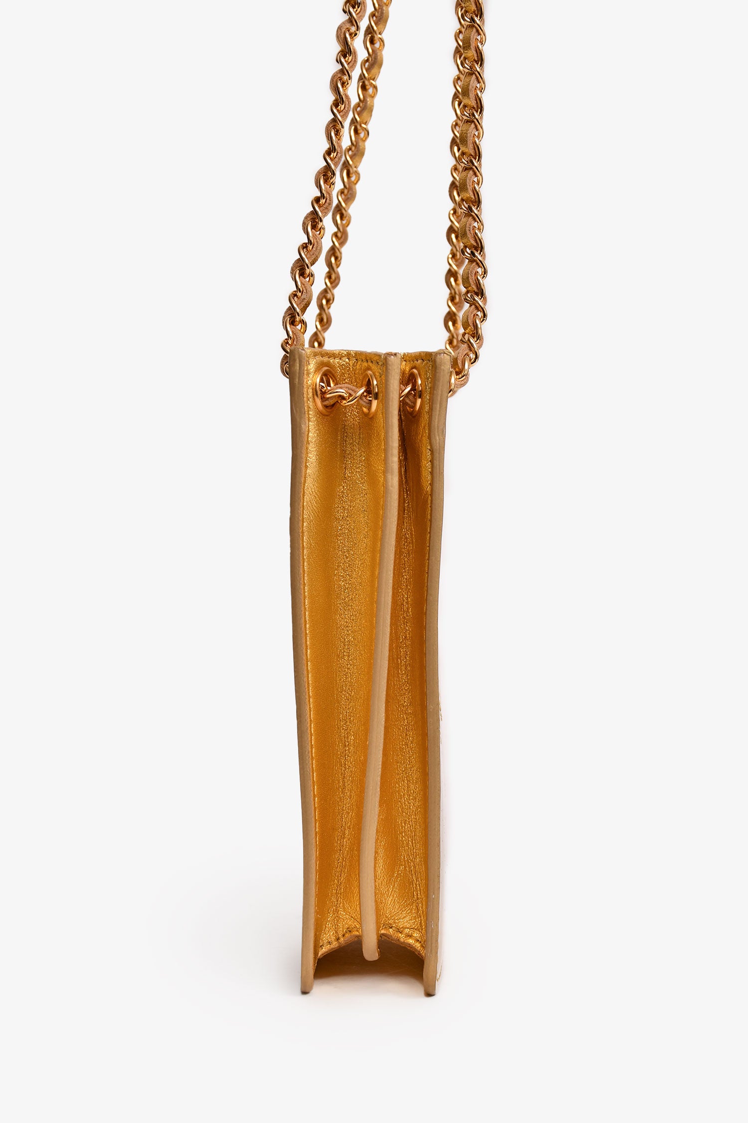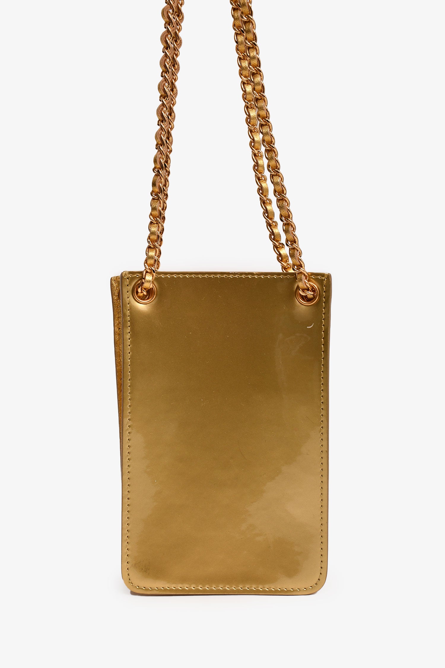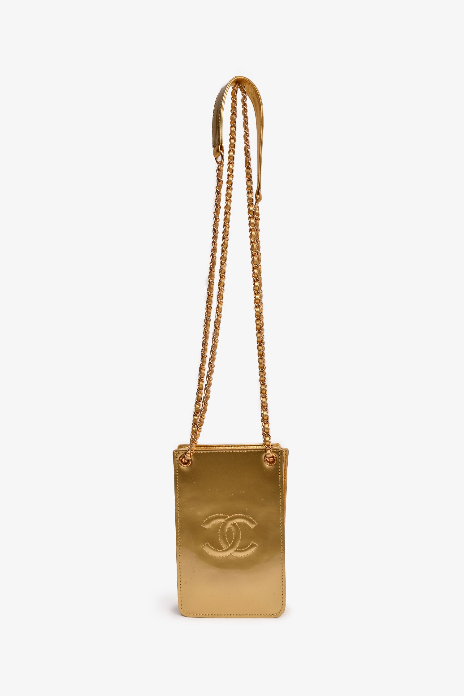 Refresh availabilityPre-Loved Chanel™ 2014 Gold Patent Timeless CC Phone Holder. Dark brown textile interior lining. 3 interior compartments; separated by dividers. Slide-around chain. Gold-tone hardware.