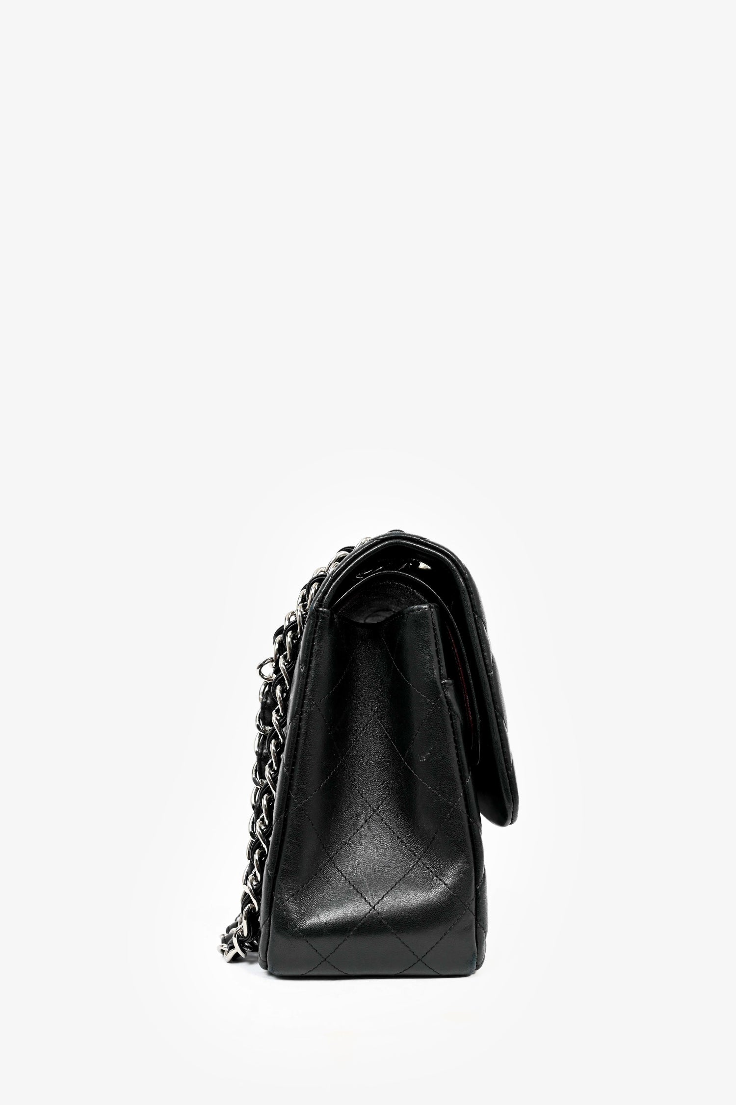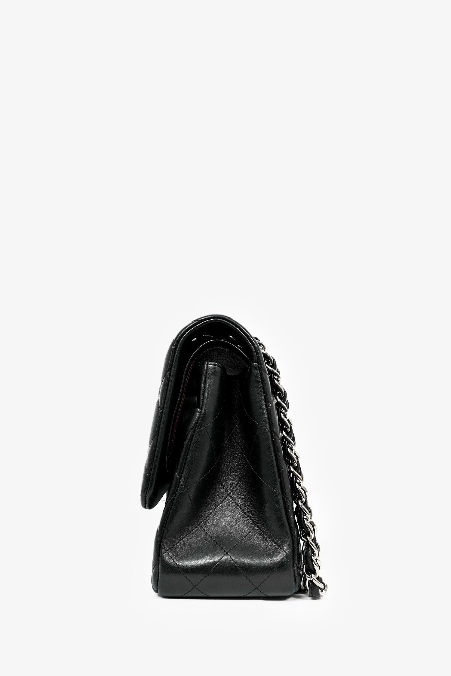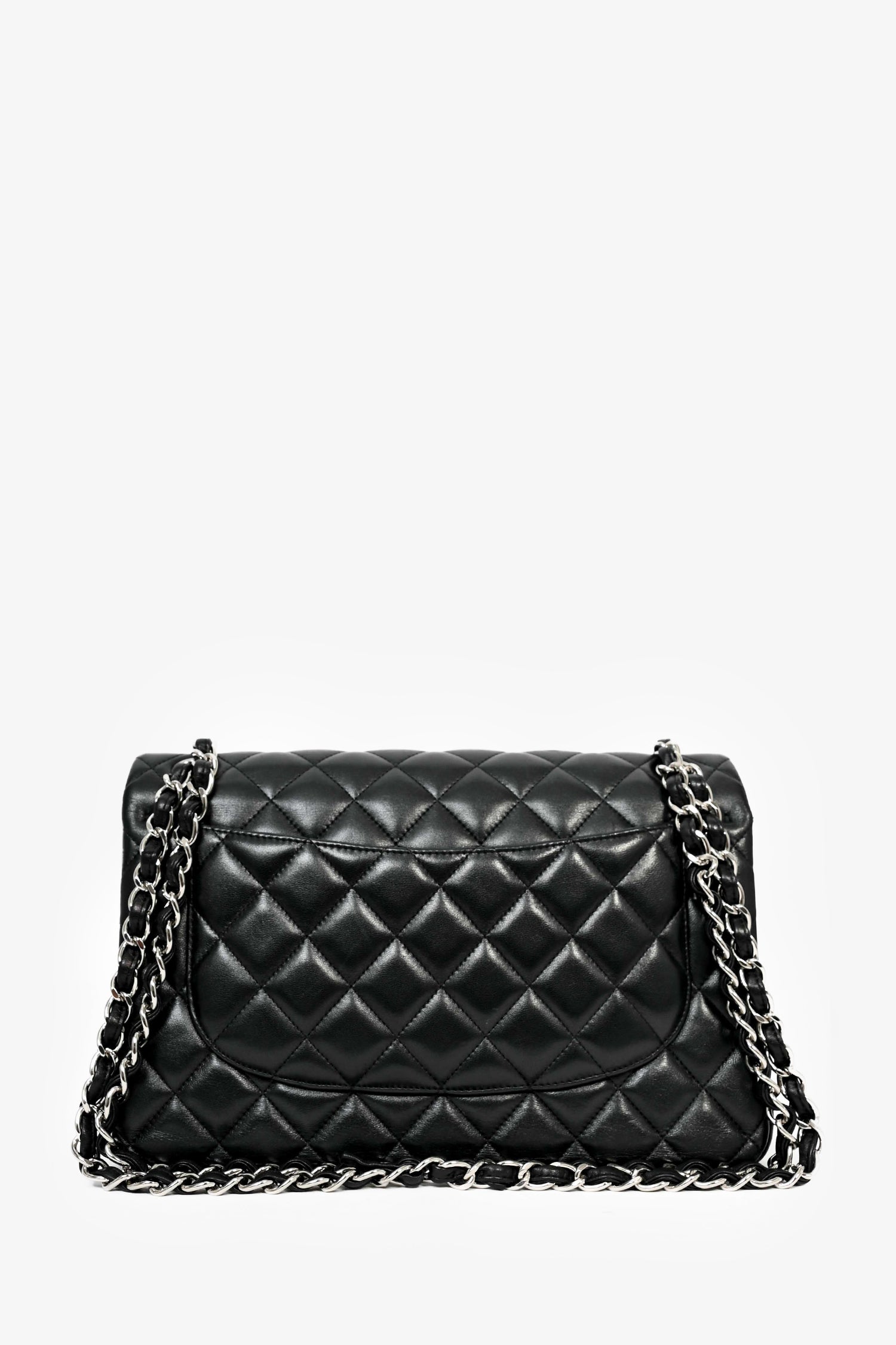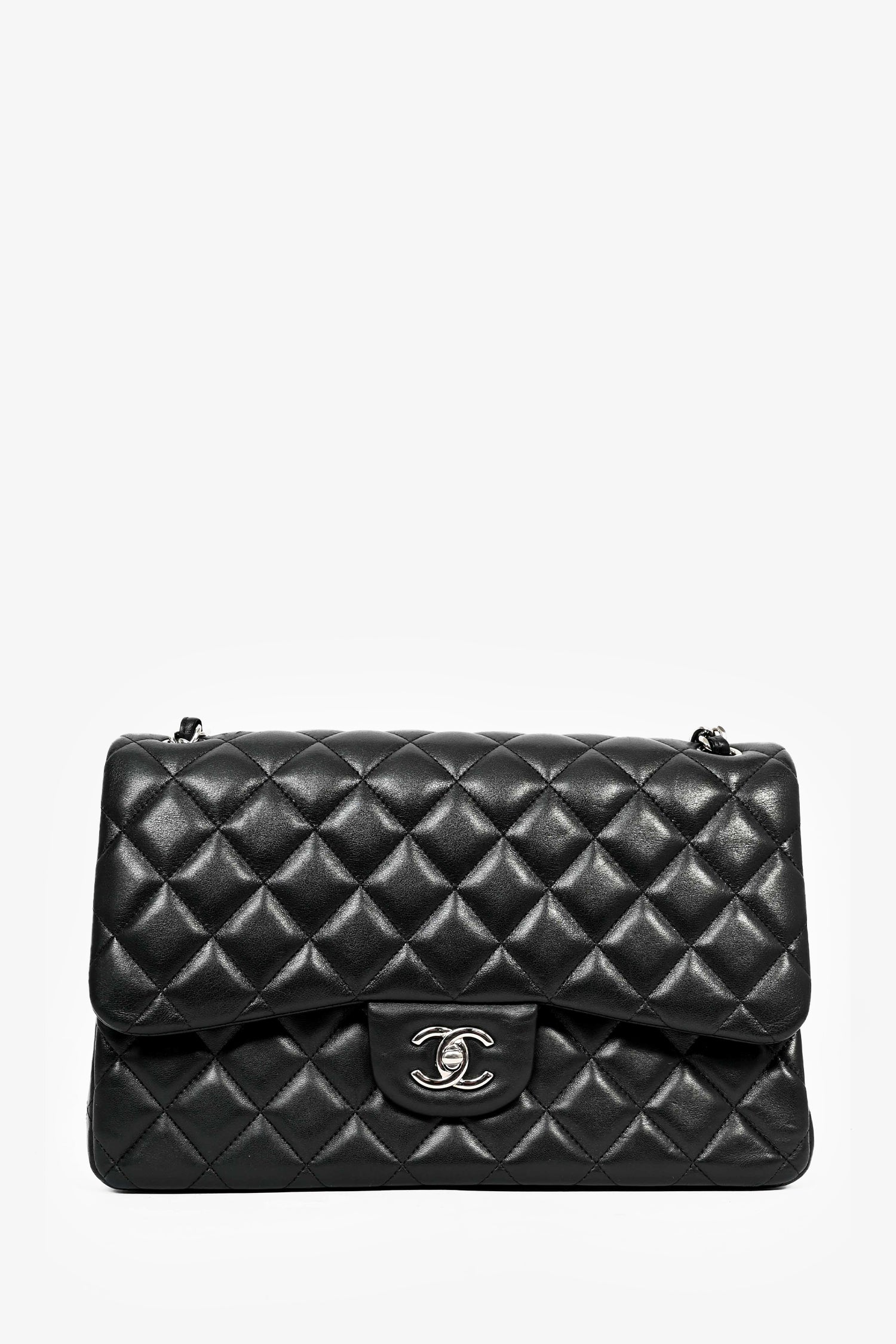 Refresh availabilityPre-Loved Chanel™ 2015-16 Black Lambskin Leather Quilted Jumbo Double Flap. Front fold-over flap with turn-lock closure. Front slip compartment. Burgundy leather interior. 2 interior wall slip pockets. Zipper pocket on the interior of the front flap. Slide-around chain. Outer rear slip pocket. Silver-tone hardware.