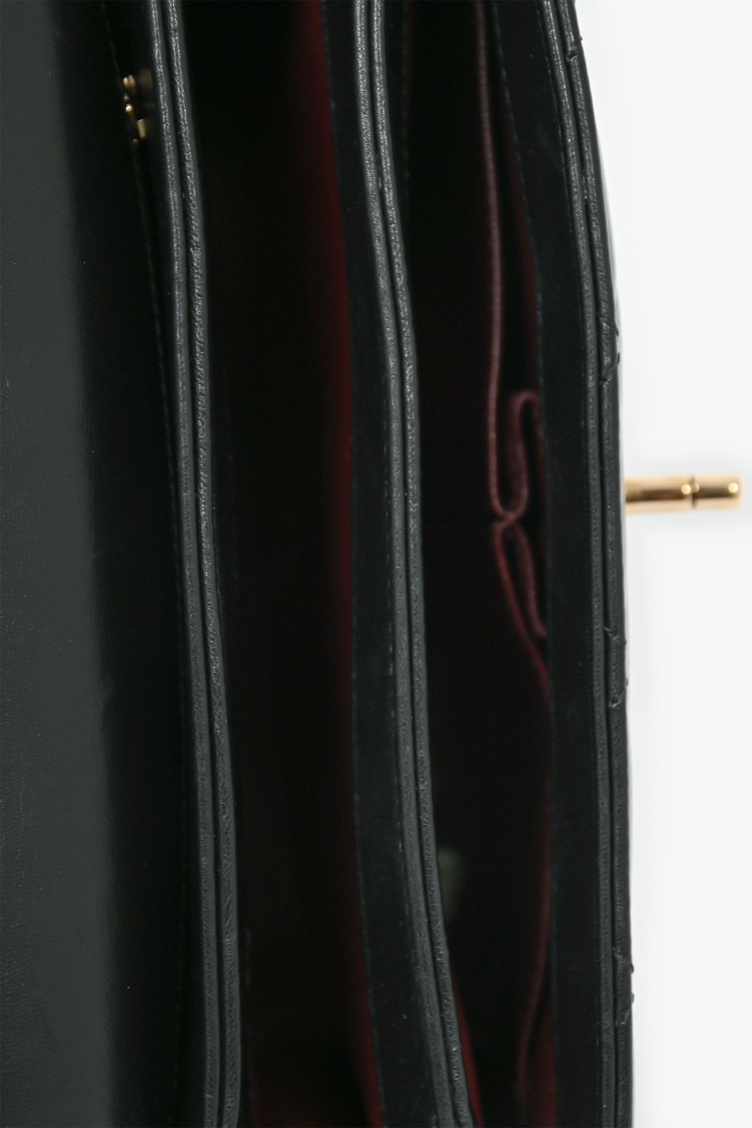 Pre-Loved Chanel™ 2017/18 Black Lambskin Leather Trendy Top Handle Bag. Front fold-over flap with turn-lock closure. Burgundy leather interior. 3 interior compartments; separated by dividers. 3 interior wall pockets; 2 slip and 1 with zip closure. Gold-tone hardware. Outer rear slip pocket.